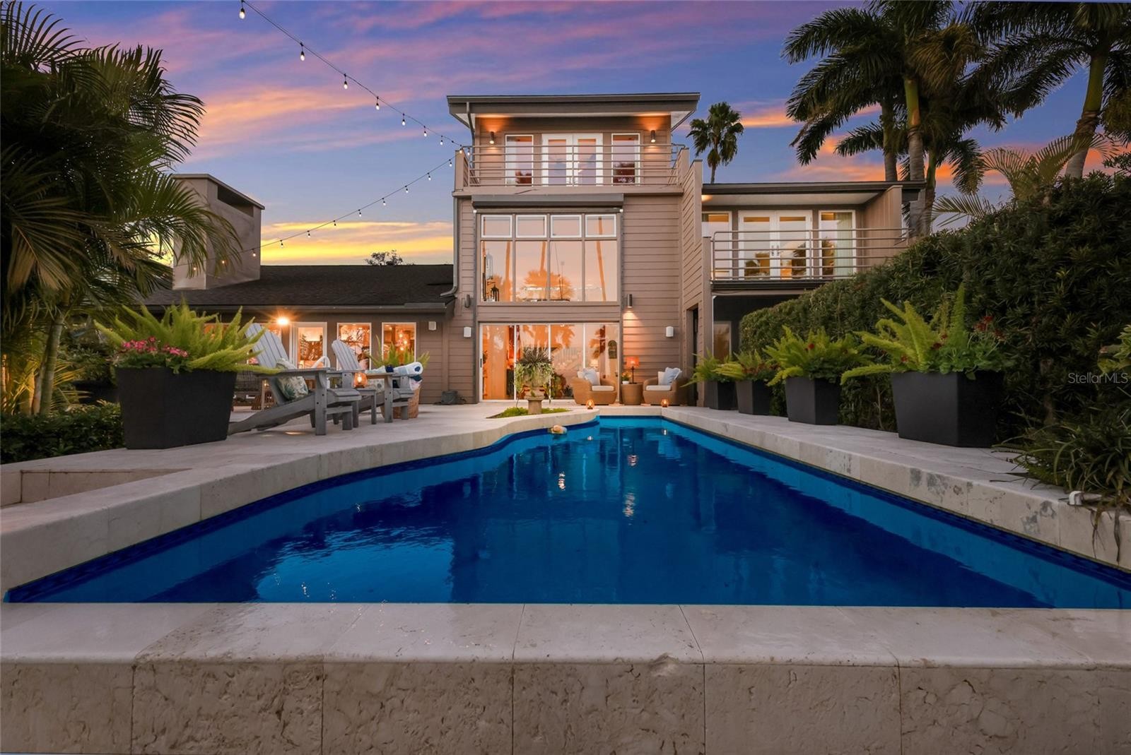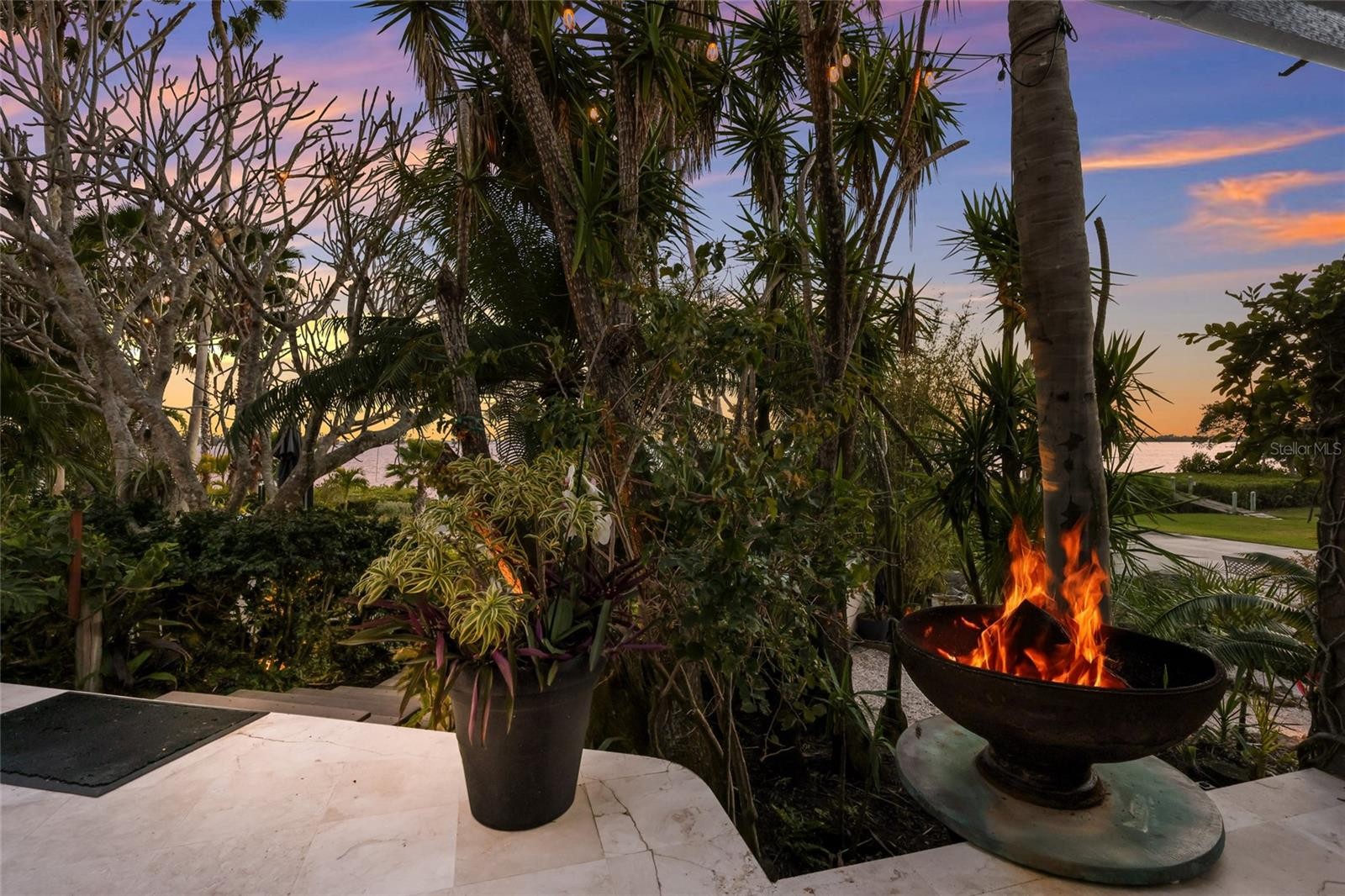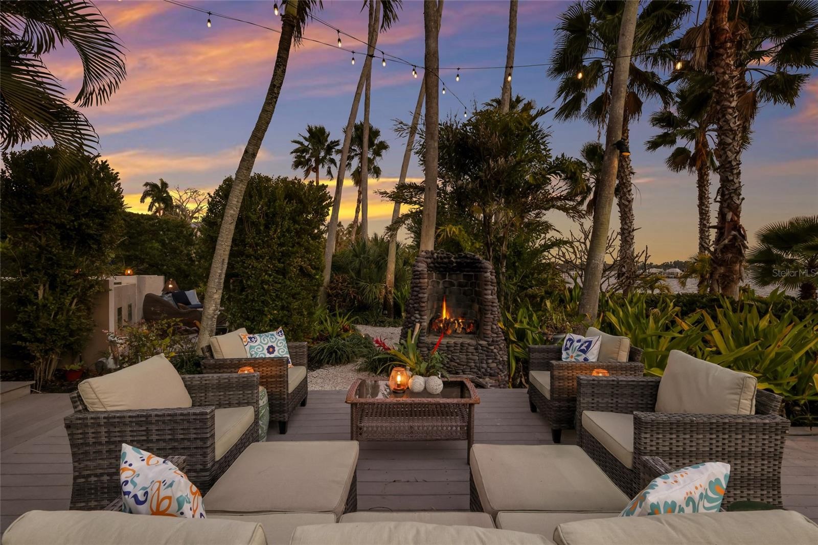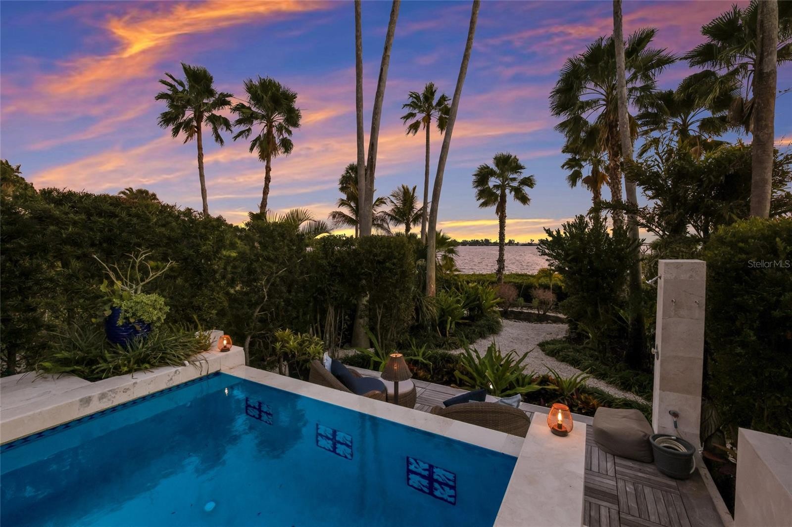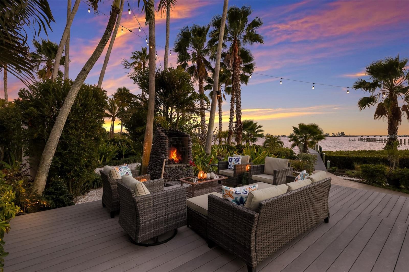 Overlooking Palma Sola Bay, this remarkable 5BD/4.5BA waterfront estate captures the essence of relaxed coastal luxury, where lush tropical landscaping, thoughtful architecture, and breathtaking sunset views come together across a truly unforgettable property. A winding circular drive welcomes you through beautifully illuminated gardens, leading to a charming pathway that crosses a serene koi pond before arriving at the front entrance, immediately setting the tone for the private retreat that awaits. Inside, travertine tile floors and soaring ceilings create a dramatic sense of openness, while expansive windows frame sweeping views of the bay and fill the home with natural light. The stunning great room makes an unforgettable first impression with its impressive ceiling height, elegant dining space, and striking wall of windows that perfectly frame the water and evening sunsets beyond the palms. Designed for both entertaining and everyday comfort, this central gathering space flows effortlessly into the living room anchored by a wood burning fireplace, creating a warm and inviting setting for conversation and relaxation while maintaining a seamless connection to the outdoors. Just beyond, the expansive chef’s kitchen is thoughtfully designed with extensive custom cabinetry, abundant prep space, and a large island ideal for casual dining and gathering. Distinctive copper sinks add warmth and character, while high end appliances and an open layout allow the kitchen to remain connected to both the great room and living areas, making it perfect for hosting friends and family. A dedicated wine cellar adds another level of sophistication for collectors and entertainers alike. Upstairs, the primary suite offers a peaceful sanctuary with private balcony access overlooking the bay. The third floor offers an additional guest suite that could also be ideal for a game/tv room or an artists retreat and features its own private balcony, creating another inviting space to enjoy the coastal breezes and water views. Outdoors, the property transforms into a private tropical retreat where expansive travertine terraces surround a beautiful pool and spa, creating multiple spaces for lounging, dining, and entertaining beneath the swaying palms. An outdoor grill area with covered seating make gatherings effortless, while winding garden paths lead to additional waterfront escapes including a fire pit lounge, tiki bar, and a tranquil spa nestled among lush landscaping. A lighted private dock extends into Palma Sola Bay, creating easy access for boating enthusiasts with direct access to the ICW and sparkling gulf waters. Just relaxing on the dock at the end of the day with a glass of wine watching the wildlife really captures the essence of this waterfront retreat. Do you enjoy entertaining? This home has had the honor of hosting many special events including weddings and amazing family gatherings. Countless memories have been created here and now it is your turn to create your own. Completing the package are raised garden beds, both an attached two car garage and a separate detached garage-perfect for a workshop, providing ample space for vehicles, storage, hobbies, or recreational equipment. With enchanting gardens, resort style outdoor living, and spectacular bay front scenery in every direction, this extraordinary property offers a rare opportunity to experience the very best of Florida waterfront living.