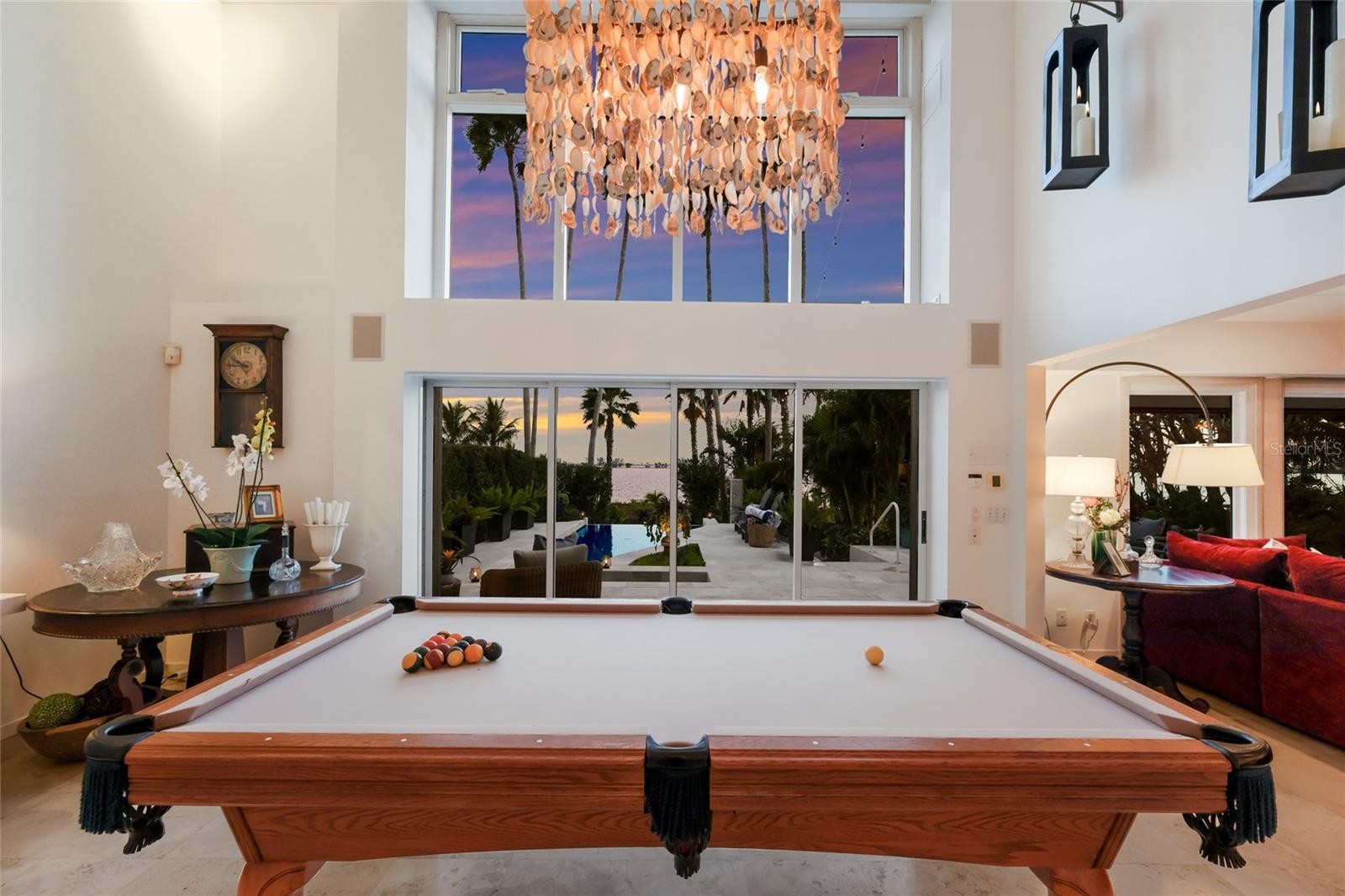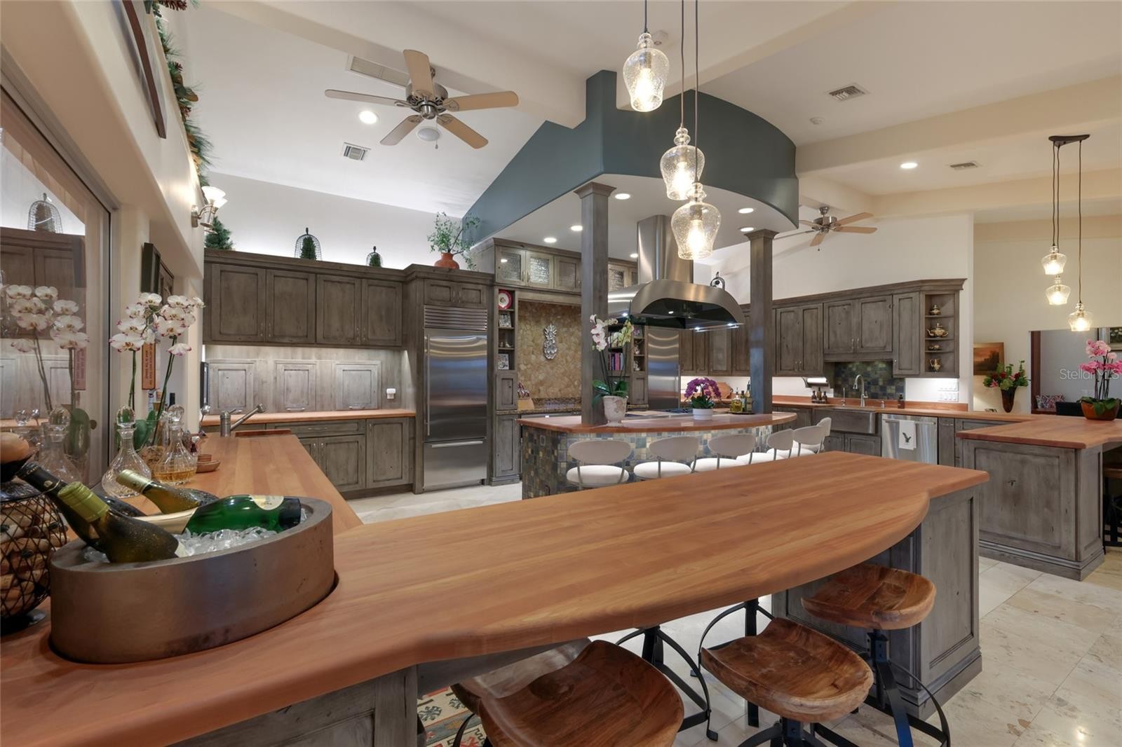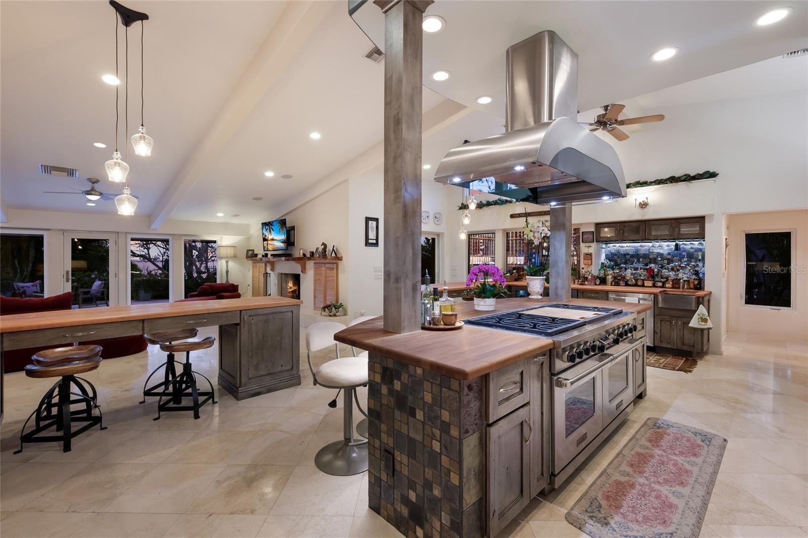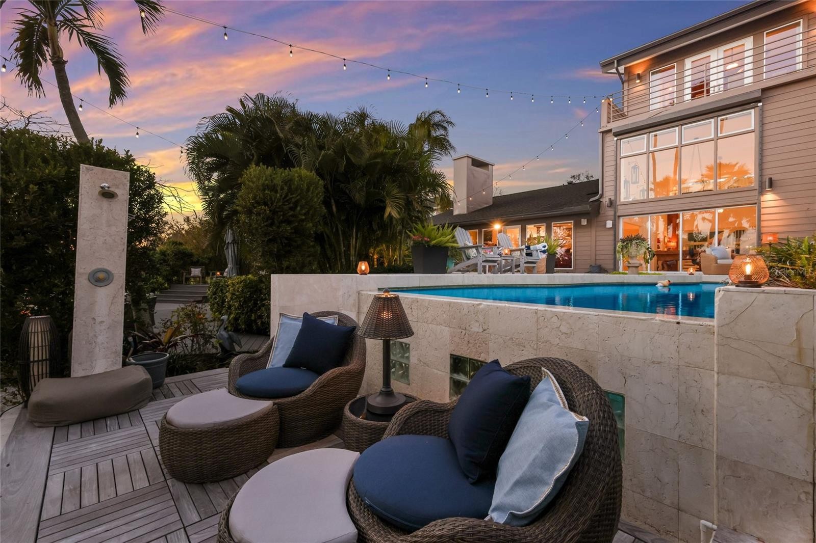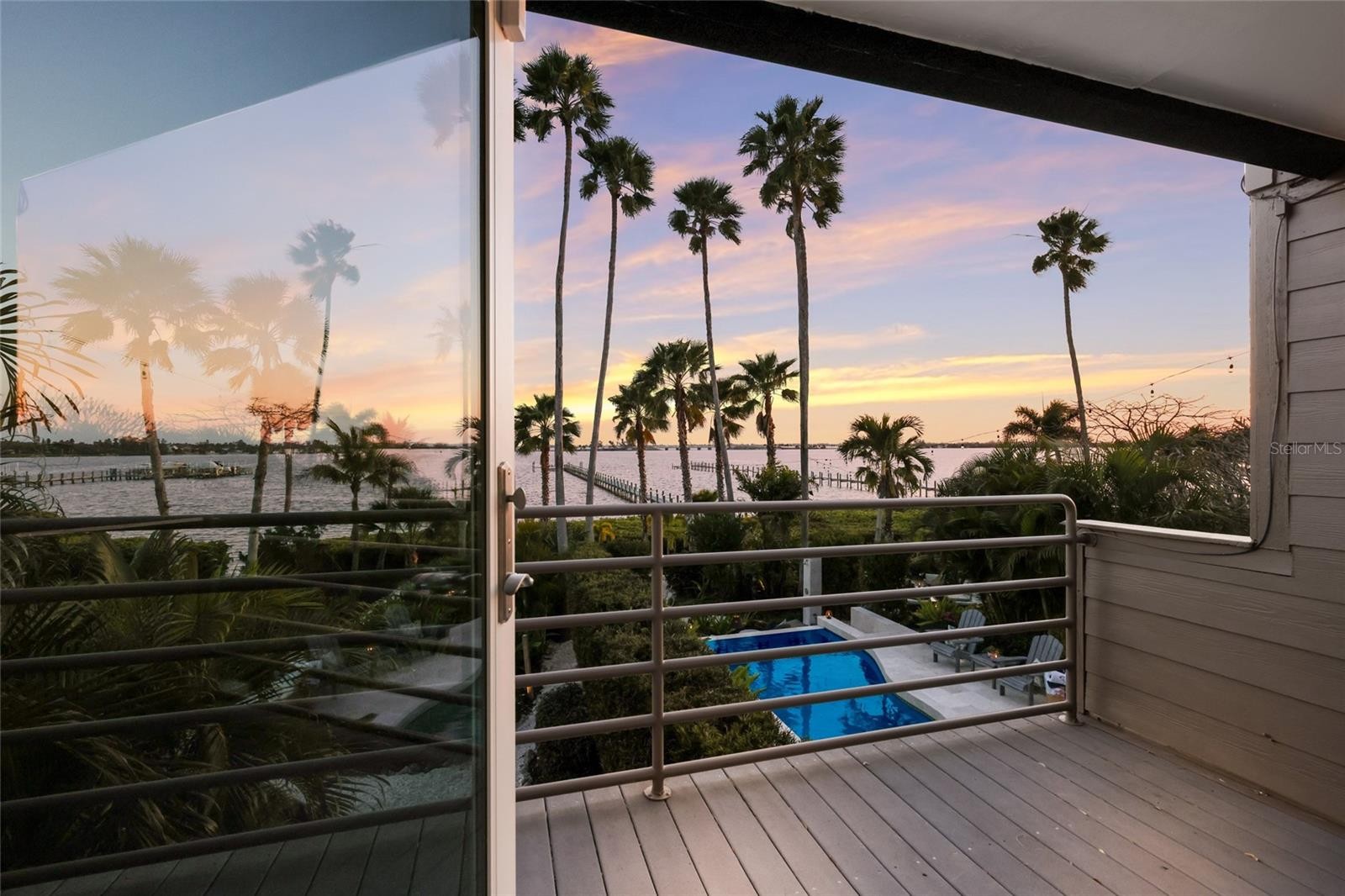 Overlooking Palma Sola Bay, this remarkable 5BD/4.5BA waterfront estate captures the essence of relaxed coastal luxury, where lush tropical landscaping, thoughtful architecture, and breathtaking sunset views come together across a truly unforgettable property. A winding circular drive welcomes you through beautifully illuminated gardens, leading to a charming pathway that crosses a serene koi pond before arriving at the front entrance, immediately setting the tone for the private retreat that awaits. Inside, travertine tile floors and soaring ceilings create a dramatic sense of openness, while expansive windows frame sweeping views of the bay and fill the home with natural light. The stunning great room makes an unforgettable first impression with its impressive ceiling height, elegant dining space, and striking wall of windows that perfectly frame the water and evening sunsets beyond the palms. Designed for both entertaining and everyday comfort, this central gathering space flows effortlessly into the living room anchored by a wood burning fireplace, creating a warm and inviting setting for conversation and relaxation while maintaining a seamless connection to the outdoors. Just beyond, the expansive chef’s kitchen is thoughtfully designed with extensive custom cabinetry, abundant prep space, and a large island ideal for casual dining and gathering. Distinctive copper sinks add warmth and character, while high end appliances and an open layout allow the kitchen to remain connected to both the great room and living areas, making it perfect for hosting friends and family. A dedicated wine cellar adds another level of sophistication for collectors and entertainers alike. Upstairs, the primary suite offers a peaceful sanctuary with private balcony access overlooking the bay. The third floor offers an additional guest suite that could also be ideal for a game/tv room or an artists retreat and features its own private balcony, creating another inviting space to enjoy the coastal breezes and water views. Outdoors, the property transforms into a private tropical retreat where expansive travertine terraces surround a beautiful pool and spa, creating multiple spaces for lounging, dining, and entertaining beneath the swaying palms. An outdoor grill area with covered seating make gatherings effortless, while winding garden paths lead to additional waterfront escapes including a fire pit lounge, tiki bar, and a tranquil spa nestled among lush landscaping. A lighted private dock extends into Palma Sola Bay, creating easy access for boating enthusiasts with direct access to the ICW and sparkling gulf waters. Just relaxing on the dock at the end of the day with a glass of wine watching the wildlife really captures the essence of this waterfront retreat. Do you enjoy entertaining? This home has had the honor of hosting many special events including weddings and amazing family gatherings. Countless memories have been created here and now it is your turn to create your own. Completing the package are raised garden beds, both an attached two car garage and a separate detached garage-perfect for a workshop, providing ample space for vehicles, storage, hobbies, or recreational equipment. With enchanting gardens, resort style outdoor living, and spectacular bay front scenery in every direction, this extraordinary property offers a rare opportunity to experience the very best of Florida waterfront living.