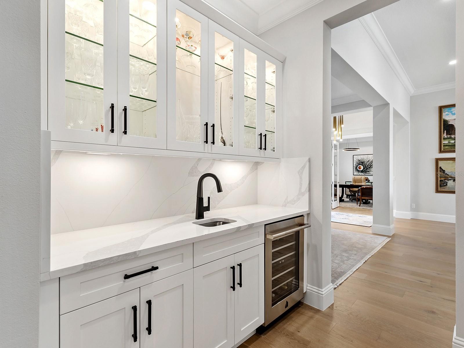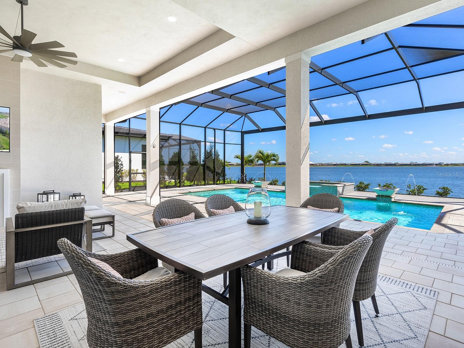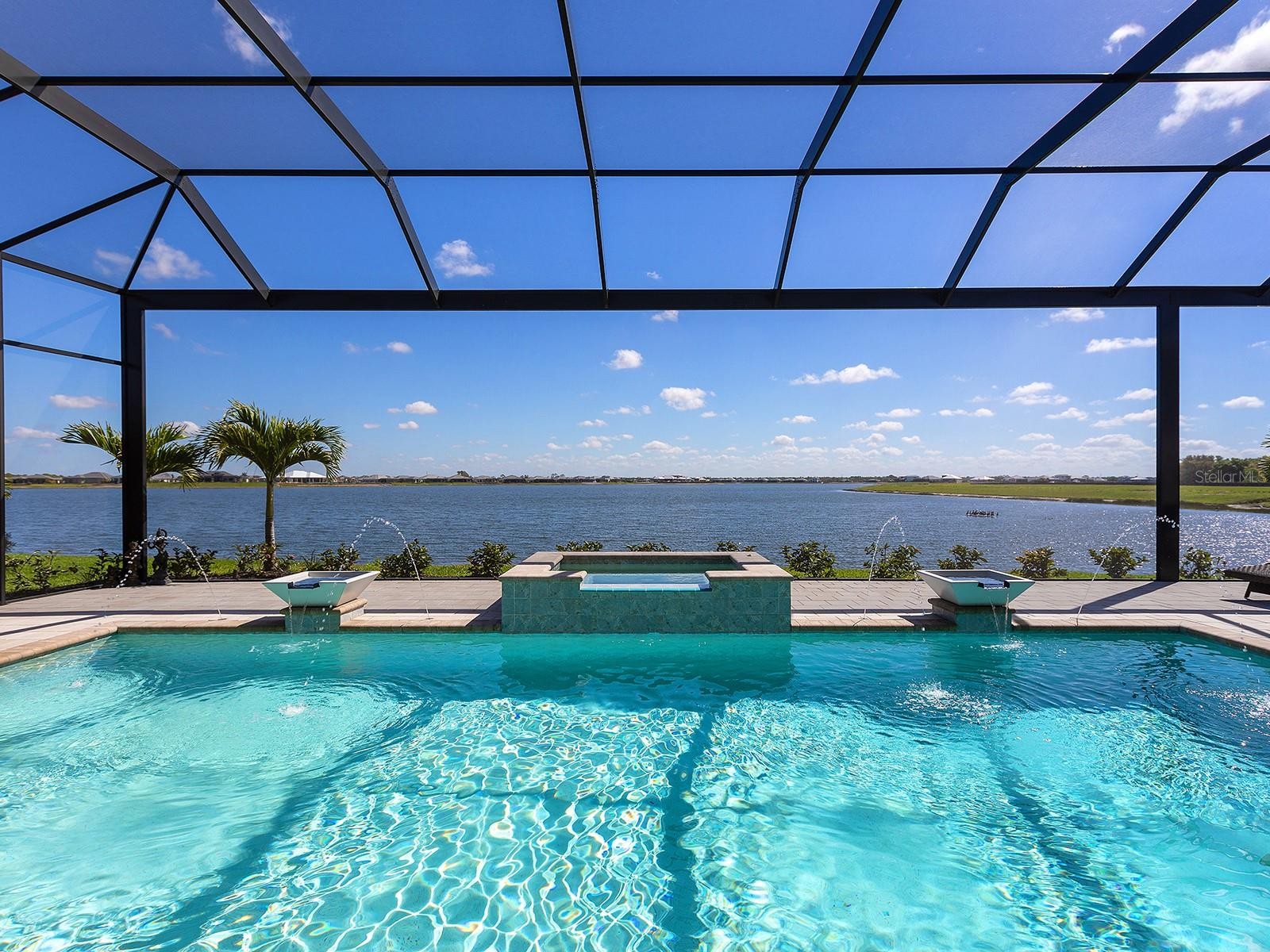 Don't wait for new construction when you can have a pristine, better than new, custom home with mile long water views that is available NOW! This stunning; lakeside home built in 2024 has been meticulously upgraded post-construction with a multitude of high-end upgrades. Lush landscaping lines the paver driveway, equipped with an oversized parking pad for guests and leads you to the front entry with modern impact full-glass front door. Inside the foyer you’re immediately greeted with the large lake views that are truly the star of this residence. Enjoy contemporary design within the open floor plan including both study and bonus room, engineered hardwood flooring, designer light fixtures, volume ceilings with crown molding, plantation shutters, professional custom closets, and a bright light-filled space. The central great room has a triple tray ceiling, feature wall with built-in cabinetry, and impact sliding glass doors to the lanai with the lake beyond. The open flow continues into the upgraded kitchen that is expertly outfitted with a central island of waterfall quartz counters, abundant crisp white cabinetry with matte black hardware, glass display cabinets, full-height quartz backsplash, farmhouse sink, walk-in pantry with custom shelving, and top-of-the-line Jenn-Air appliance suite with 6-burner gas cooktop. Perhaps the most desirable feature of this floor plan is the convenient butler’s wet bar connecting the kitchen to the formal dining room with quartz counters and backsplash, glass display cabinets, and wine refrigerator. Enjoy elegant occasions in the formal dining room adorned with custom moldings, or casual weeknights in the dinette surrounded by lake views. But the best place to entertain is on the paver lanai where the lake views take center stage from the covered living area with cozy fireplace, modern ceiling fan, and remote-controlled hurricane screens. The dining space is highlighted by the custom outdoor kitchen with granite counters, full-height backsplash, stainless steel grill, pizza oven and side burner and beverage refrigerator. The heated saltwater pool includes a raised spa, water founders, water bowl features and a panoramic screen enclosure framing the lake views. Your primary suite also takes advantage of the remarkable lake views through glass french doors, plus custom triple tray ceiling, dual walk-in closets, and en-suite bath with freestanding tub, oversized walk-in shower, long vanity with dual sinks, and private water closet. Guests will find their own comfort and privacy in 3 guest bedrooms, all with walk-in closets, 2 of which have private en-suite bathrooms, and the third full bath also works as a pool bath. Additional spaces include a private study, lakeside bonus room with closet (could be a 5th bedroom), functional laundry room, mudroom entry hall with cabinetry, and impressive 3-car garage with its own air conditioning. Peace of mind is secured with impact windows and doors, whole-house GENERATOR, and whole-house water filtration. Wild Blue at Waterside is one of Sarasota’s premier neighborhoods offering upscale amenities including a waterfront clubhouse with restaurant opening fall 2026, dock and kayak launch, 6 tennis courts, 8 pickleball courts, pro shop, outdoor fitness, walking trails, pavilion, playground, dog park, basketball court, and Midway Sports Complex access. Plus enjoy proximity to Waterside Place with shopping, dining, farmers market, parks, events and more.