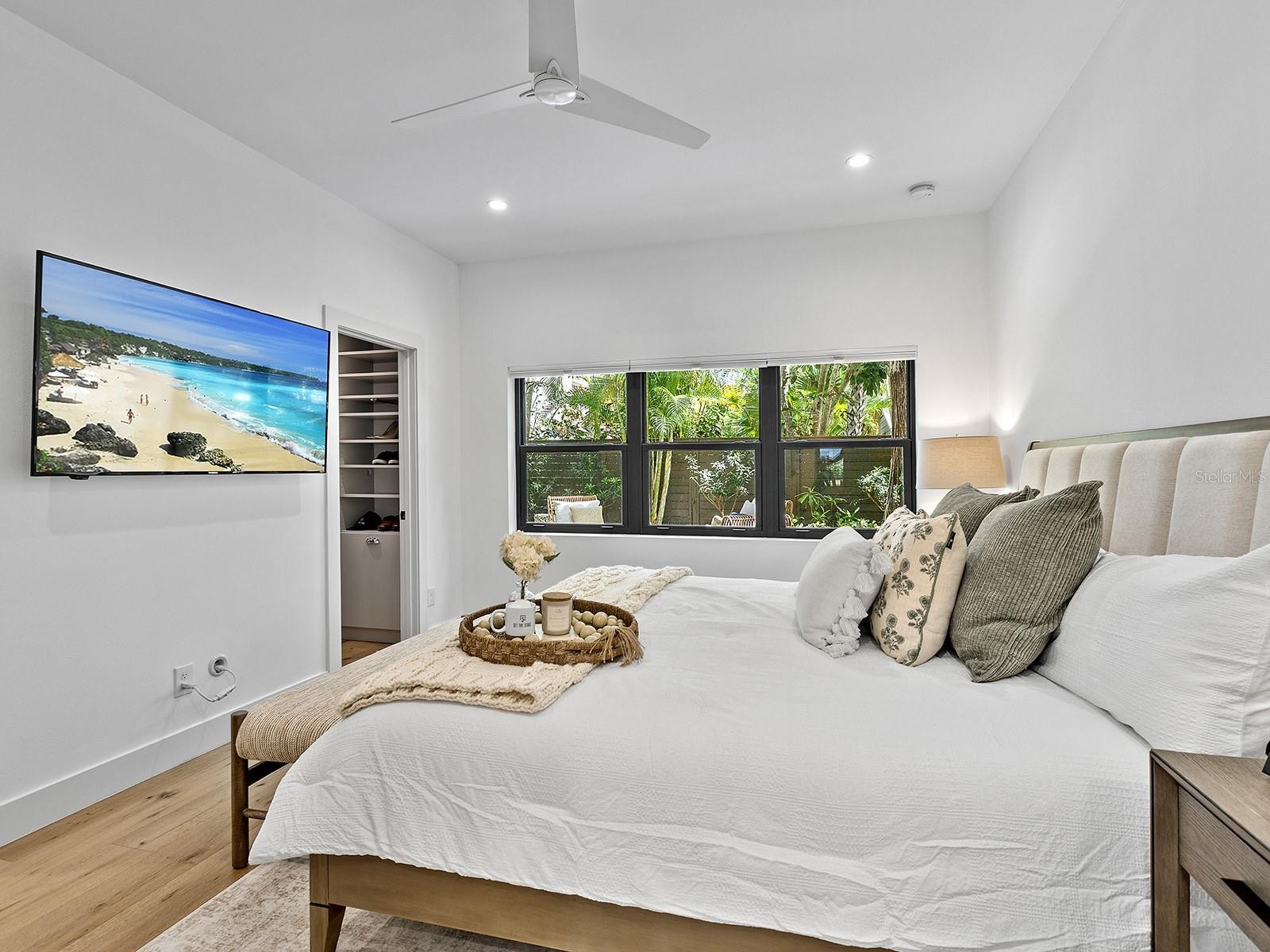 Experience modern coastal living in this striking designer inspired three-bedroom two-bath contemporary residence that blends clean architectural style with a private, lush, and tropical setting in downtown Sarasota’s historic Laurel Park. This unbeatable location is close to the city’s best dining, shopping and theater, Bayfront Park, Selby Gardens and the area’s world-renowned beaches. A rare, move-in ready opportunity where high design meets the very best of the Florida coastal lifestyle. As you walk through the inviting glass entry doors, you are met by an open layout, wide-plank white oak flooring and numerous windows which bathe the home in natural light, creating a bright and airy interior. The open great room floor plan is both refined and welcoming, seamlessly connecting dining, living, and kitchen into one cohesive area designed for entertaining and everyday living. At the heart of the home, is a bright and inviting coastal-inspired chef's kitchen which serves as both a functional workspace and a natural gathering place. It features custom Shaker-style cabinetry offering pullouts, an oversized island with seating and designer pendant lighting, quartz counters with honeycomb Mosaic tile backsplash and Viking stainless appliances where meals are enjoyably prepared using natural gas. The beautifully curated primary suite provides a tranquil retreat, offering a peaceful escape with garden views and a spa quality bath featuring natural marble flooring in an offset pattern, freestanding soaking tub, frameless glass shower with subway tile wall, dual vanities, large walk-in closet with custom built-in shelves and cabinetry, and additional high-end finishes that create a calming aesthetic that invites relaxation. A well-appointed guest suite thoughtfully designed for comfort and serenity blends understated elegance with private ambiance and features marble mosaic flooring in a elongated hex pattern, designer lighting, a double vanity, tub and shower with white subway wall tile. A beautifully styled second guest bedroom with Murphy bed is currently utilized as a private office to add versatility for remote work or guests. Upon opening the great room french doors and stepping outside, you will discover a secluded courtyard-style backyard as your private oasis surrounded by lush tropical landscaping and anchored by a spacious travertine sitting area ideal as a peaceful backdrop for morning coffee or evening gatherings under the canopy of mature trees. Other exceptional benefits include: impact glass windows and doors, custom built-ins for all closets, tankless water heater, new HVAC (2025) and dishwasher (2026), tongue and groove ceilings, reverse osmosis system in the kitchen for drinking and cooking water, carbon purification system for entire home, fenced private yard and landscape lighting. Laurel Park offers its own pocket park with playground on Laurel Street and a kayak launch at the end of Ohio Place. Embrace the opportunity to live in this beautiful home while enjoying the coastal Florida lifestyle.