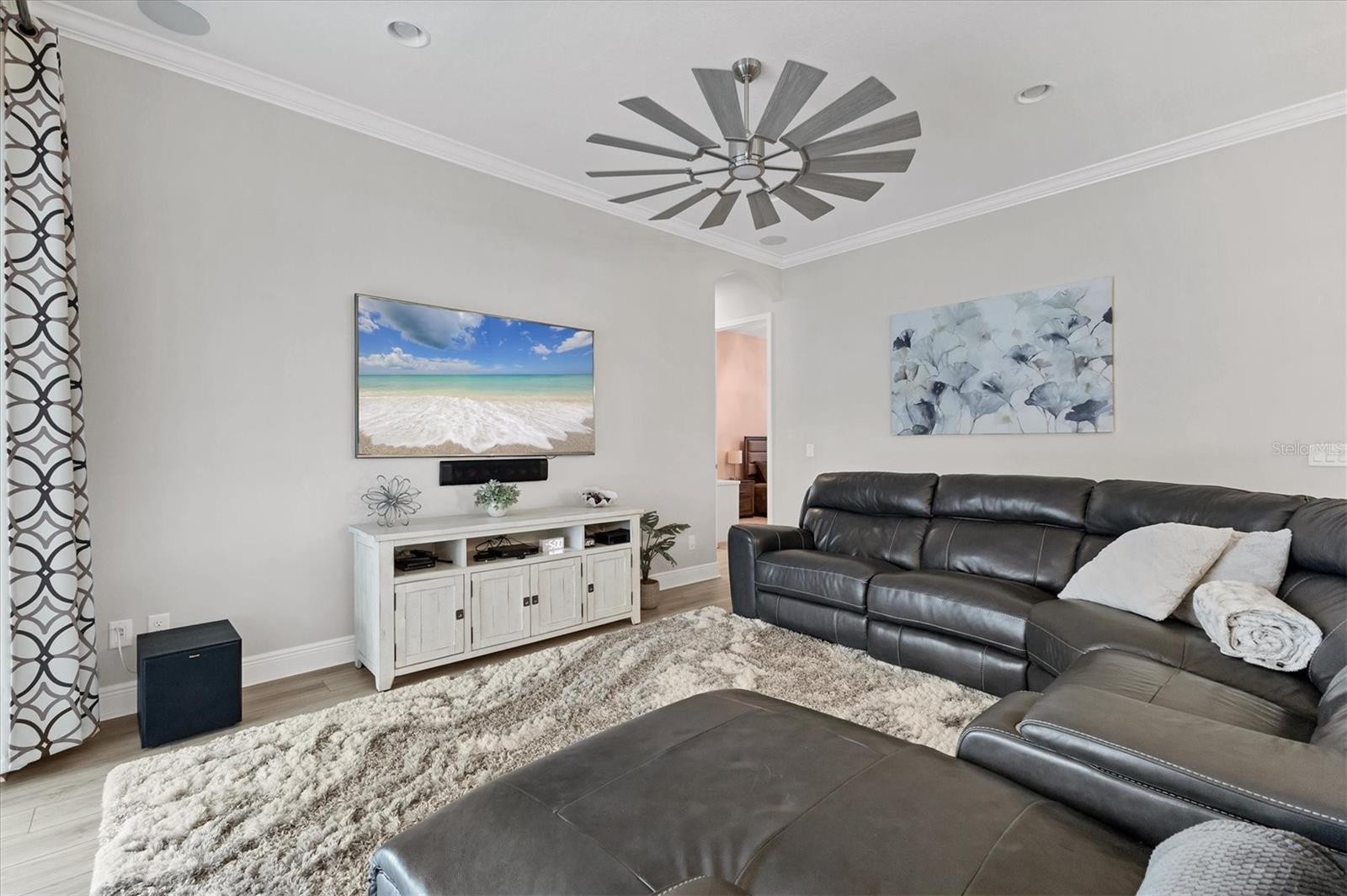 Welcome to this beautifully upgraded 5-bedroom, 3-bath home in the exclusive, gated community of Legends Bay. With over 3,000 sq. ft. of luxury living space and over $180,000 in upgrades - this home is truly move-in ready and designed for both comfort and entertaining. This home its High & Dry in Flood Zone X. Step inside to discover an open, light-filled floor plan enhanced by an upgraded lighting package with recessed lights, designer fixtures, and upper-cabinet illumination. The gourmet kitchen is a chef’s dream, featuring sleek Samsung black stainless appliances, a custom backsplash, and generous counter space — perfect for cooking and gathering alike. The fireplace surround has been tastefully upgraded to complement the home’s modern aesthetic. The living room and lanai are both equipped with surround sound, creating the ideal setting for seamless indoor and outdoor entertaining. Outside, your private backyard oasis awaits — complete with a heated saltwater pool, spa, and fully equipped outdoor kitchen featuring a built-in stainless grill, refrigerator, sink, and expansive counter space. There is plenty of room for lounging or dining while enjoying serene lakefront views. A highlight of this home is the flexible fifth bedroom, designed to serve as a bonus space that bridges indoor and outdoor living. With direct pool access, a built-in closet, and ample space for guests or recreation, it perfectly blends versatility with comfort. The dedicated office provides a quiet, private retreat for working from home, thoughtfully separated from the main living areas. The spacious primary suite offers dual walk-in closets with custom built-ins, providing exceptional storage and organization. Additional upgrades include an impact-rated front door, premium finishes throughout, and meticulous attention to detail at every turn. Legends Bay offers resort-style living with a lakeside pool, observation pier, and maintenance-free conveniences — including lawn care, cable, and Wi-Fi — all covered by HOA dues. Residents also enjoy a scenic loop for walking or biking and golf cart access to the nearby IMG Golf Club. Located just 5 minutes from IMG Academy and within 15 minutes of Bradenton’s pristine beaches, SRQ Airport, downtown Sarasota, and UTC Mall, this home perfectly combines luxury, location, and lifestyle in one exceptional package.