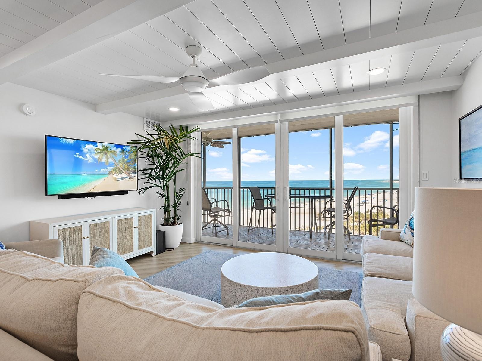 Turnkey-furnished 8th-floor gem in Crystal Sands on Siesta Key! Renovated in 2022 with stunning Gulf views, custom wood beam ceilings, granite counters, laminate floors, and wind-rated glass. Designer kitchen with built-in banquet and seamless fridge/cabinet design. Both bedrooms feature walk-in closets; primary bath has dual sinks and luxe shower. Huge lanai for sunset views. This unit grossed $150K income (January 2024 through May 2025). Art Deco-style beachfront complex with pool on the beach. Trolley service up and down the key, providing rides to beaches, dining, and Siest Key Village.
