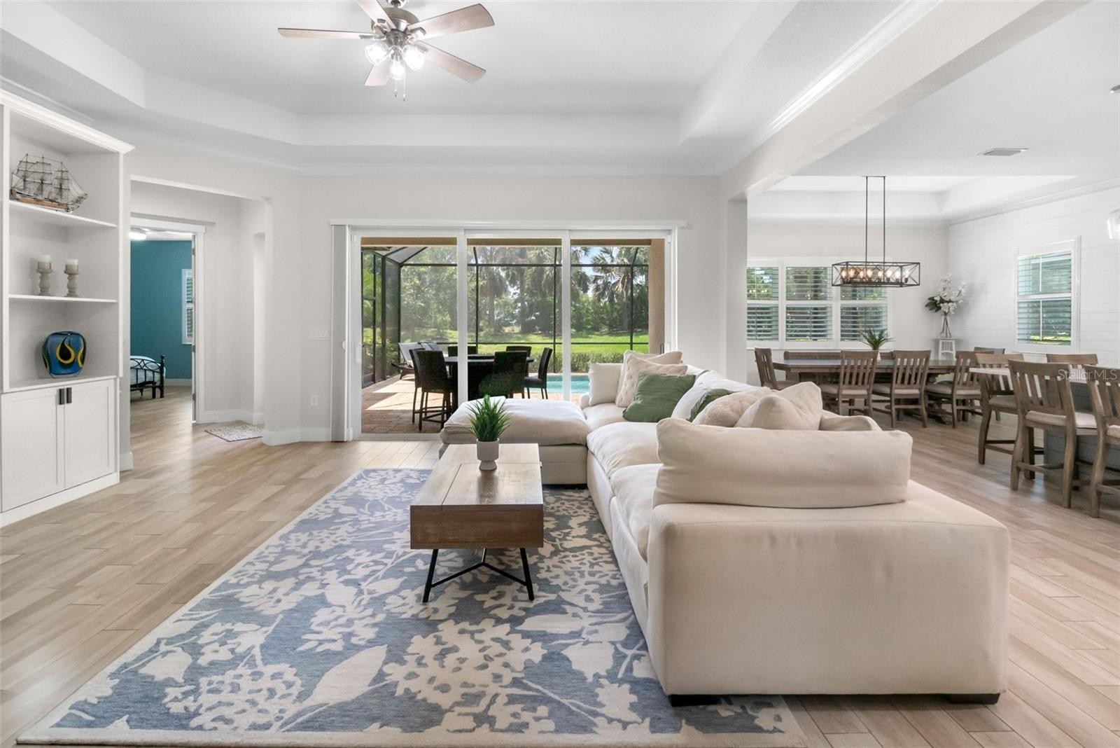 Welcome to Rivo Lakes, a luxurious gated community of just 107 homes, known for its low HOA fees, NO CDD fees, and one of the few communities in the area that allows the installation of backyard fencing with approval. This exquisite 5-bedroom, 3.5-bath pool home was built in 2019 by the highly sought-after MI Homes. Nestled within an A-Rated school district, this 2-story executive residence is 3,938 square feet of pure modern luxury. As you enter you will be captivated by the grand foyer with crown molding and custom lighting. This masterpiece was built with ALL HURRICANE IMPACT WINDOWS AND DOORS for safety and peace of mind. The interior is adorned with custom lighting, tray ceilings, and 8-foot doors. The heart of this home is undoubtedly the custom chef's kitchen, featuring high-end appliances, 42-inch wood cabinets, an oversized island, stunning quartz countertops, and a walk-in pantry. The first floor features an oversized primary suite with a massive walk-in closet, complete with custom built-in cabinetry. The ensuite bathroom is a luxurious oasis, offering a walk-in shower, a soaking tub, and dual vanities. Two additional bedrooms and a full bathroom are also located on the main level. As you ascend the rich hardwood stairs to the second floor, you'll be welcomed by a spacious bonus room, two more bedrooms and a full bathroom. WOW your guests when entertaining on the extended lanai and luxurious pool that is set against beautifully landscaped surroundings with palm trees and lush shrubbery. A convenient half bathroom is located near the screened lanai, ideal for guests while entertaining outside. Near Rivo Lakes, you'll find Twin Lakes Park, the Serenoa Golf Course, and a wide variety of shopping and dining options. Best of all, the world-renowned Siesta Key Beach is just a short drive away, offering endless opportunities for leisure and relaxation. Don't miss your chance to experience this exceptional property in this friendly neighborhood. Call now to schedule your private showing because this showstopper will not last!