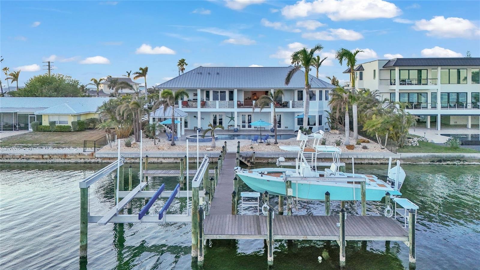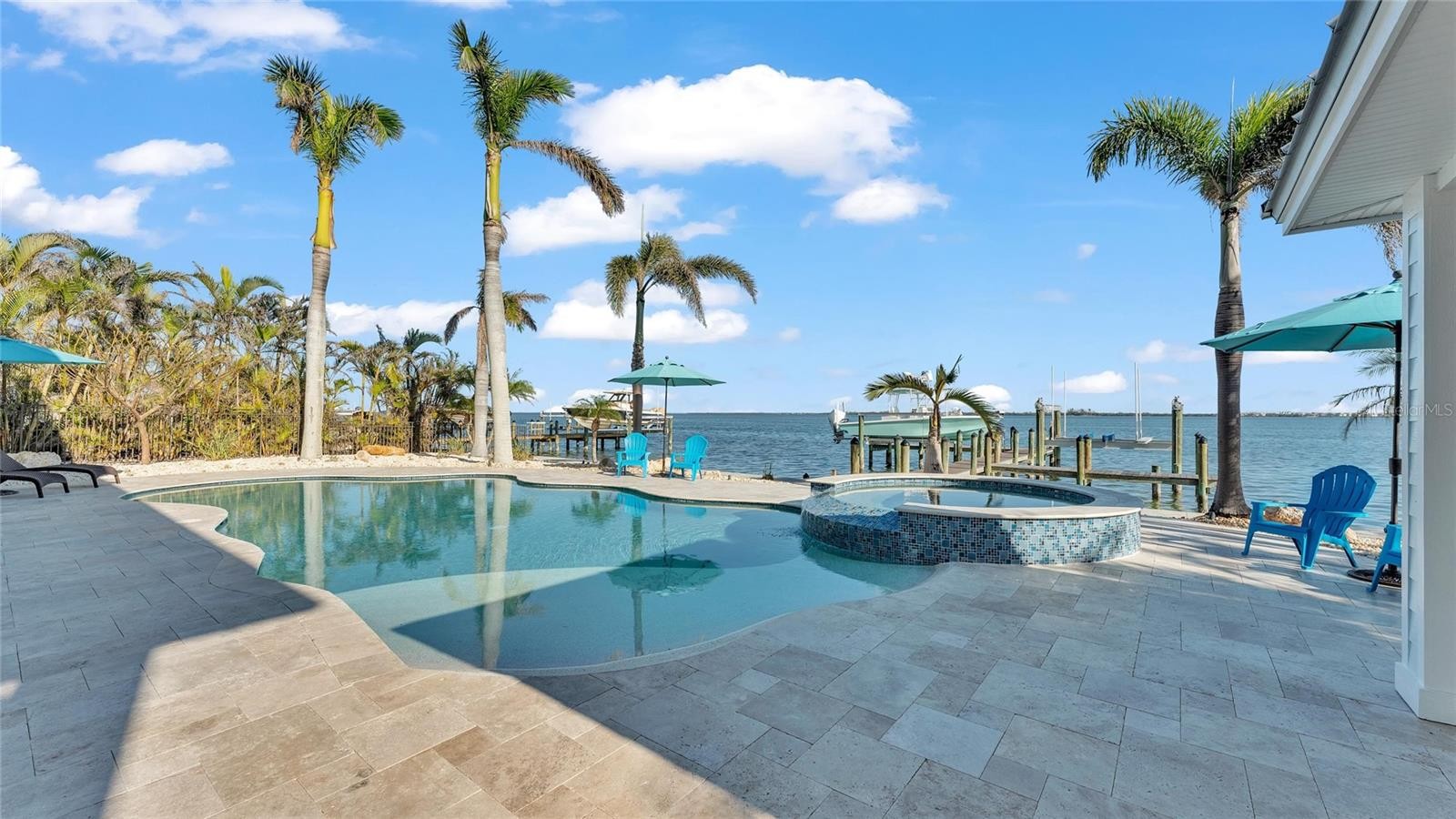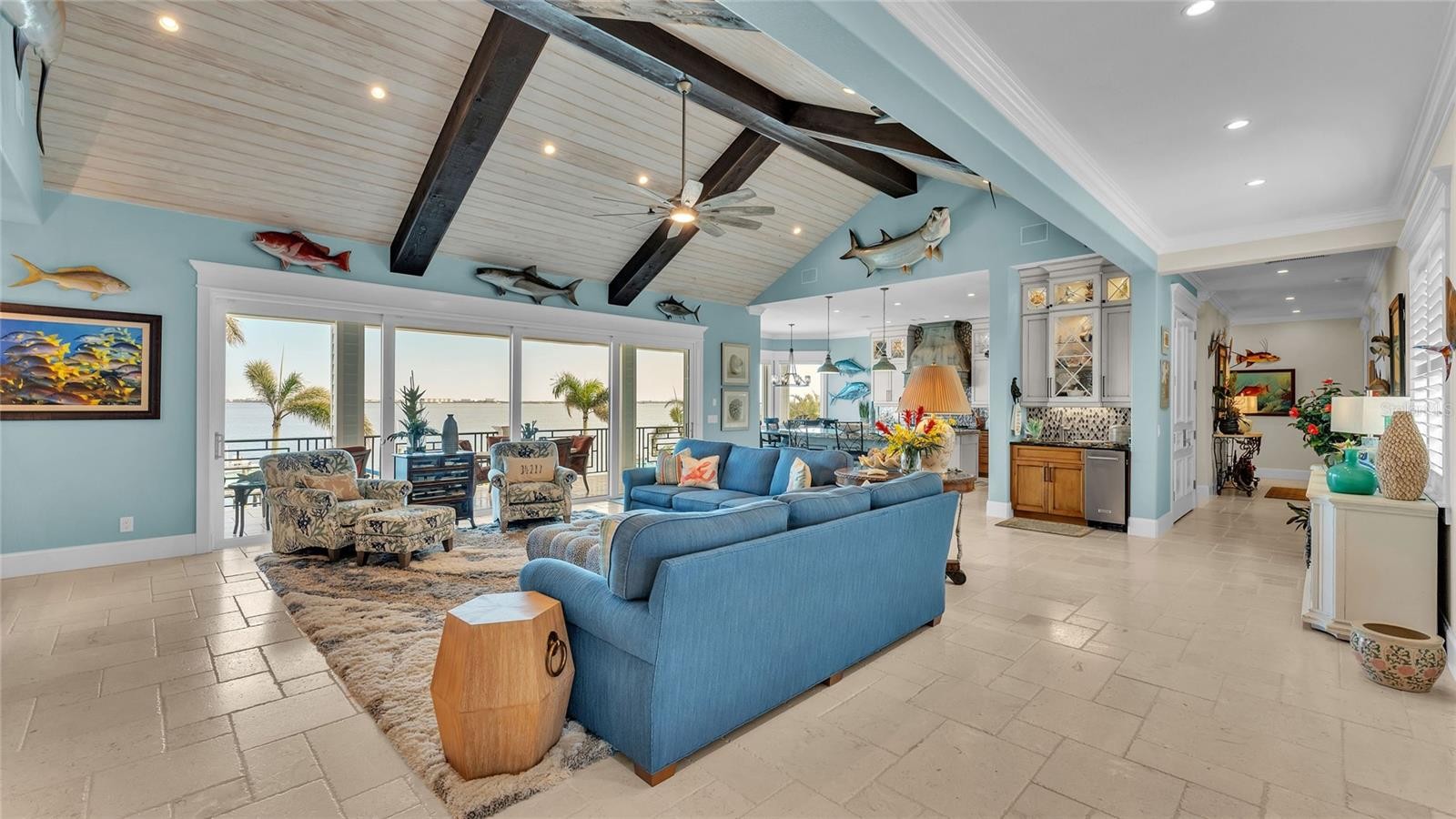 This bayfront Key Royale home is ideally situated on the southern side of Key Royale, offering a more protected setting away from the north wind and enhancing year-round outdoor enjoyment. Truly a World of Its Own—delightful bayfront living with sweeping views of the crystal-clear waters of Anna Maria Sound and Tampa Bay. This elevated, single-level custom-built coastal residence is a tribute to exceptional design, premier location, and impeccable construction, finishes, and taste. Calm coastal hues and shell stone travertine flooring flow throughout the soaring living spaces, highlighted by tongue-and-groove ceilings with solid wood beams. The home showcases custom cabinetry with 100-year-old pine accents, extensive millwork, and a handcrafted TV feature wall. Additional features include a Control4 AV system, upgraded custom lighting and fans, an elevator, 8-foot solid core interior doors, whole-home sound system, plantation shutters, custom motorized window treatments, and central vacuum. The chef’s kitchen is equipped with Thermador commercial-grade appliances, a built-in pantry, and double laminated-edge granite countertops. Expansive bay views are captured from nearly every angle, while sliding glass doors open to an elegant 63-foot balcony complete with an outdoor kitchen and Trex staircase leading to the pool area below. Three of the four bedrooms are ensuite, all featuring rich Ipe wood flooring, custom closet systems, and luxurious bathrooms finished with travertine flooring and Moen body spray shower systems. Built to the highest standards, the exterior boasts a commercial-grade 24-gauge standing seam metal roof, PGT impact windows and doors, second-floor block construction, poured concrete porches, a Cantera entry door, and Icynene attic insulation. The spacious garage includes insulated doors and durable epoxy flooring. Outdoors, the home transforms into a private waterfront retreat with a bayside freeform pool and spa, expansive travertine deck for lounging and dining, and a covered cabana. Boating enthusiasts will appreciate the Trex dock with water and electric, along with 28,000 lb and 10,000 lb boat lifts. This stunning residence is a decorator’s masterpiece and a true feast for the senses. It presents a rare opportunity to embrace an extraordinary coastal lifestyle. Sold turnkey furnished less personal exceptions!