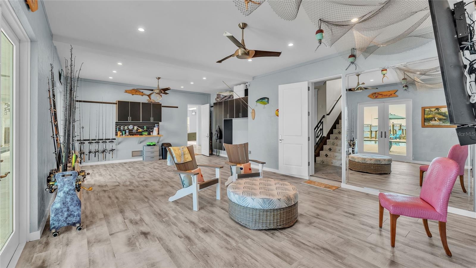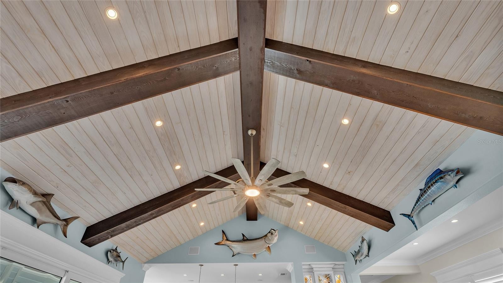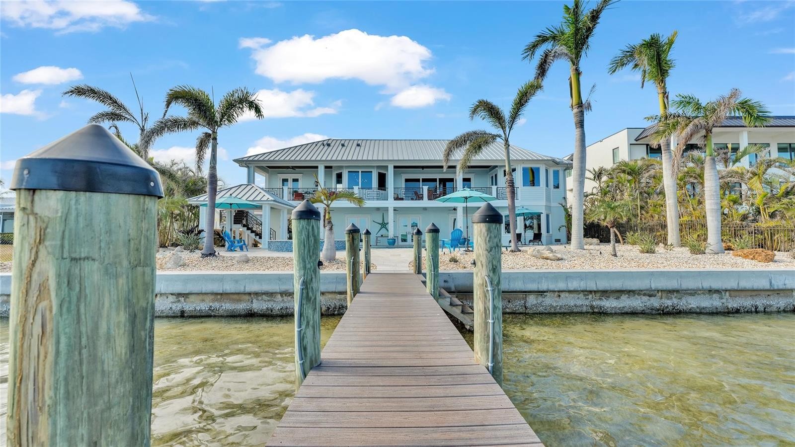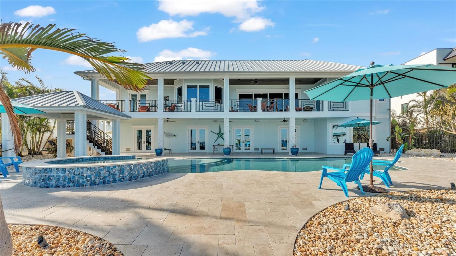 This bayfront Key Royale home is ideally situated on the southern side of Key Royale, offering a more protected setting away from the north wind and enhancing year-round outdoor enjoyment. Truly a World of Its Own—delightful bayfront living with sweeping views of the crystal-clear waters of Anna Maria Sound and Tampa Bay. This elevated, single-level custom-built coastal residence is a tribute to exceptional design, premier location, and impeccable construction, finishes, and taste. Calm coastal hues and shell stone travertine flooring flow throughout the soaring living spaces, highlighted by tongue-and-groove ceilings with solid wood beams. The home showcases custom cabinetry with 100-year-old pine accents, extensive millwork, and a handcrafted TV feature wall. Additional features include a Control4 AV system, upgraded custom lighting and fans, an elevator, 8-foot solid core interior doors, whole-home sound system, plantation shutters, custom motorized window treatments, and central vacuum. The chef’s kitchen is equipped with Thermador commercial-grade appliances, a built-in pantry, and double laminated-edge granite countertops. Expansive bay views are captured from nearly every angle, while sliding glass doors open to an elegant 63-foot balcony complete with an outdoor kitchen and Trex staircase leading to the pool area below. Three of the four bedrooms are ensuite, all featuring rich Ipe wood flooring, custom closet systems, and luxurious bathrooms finished with travertine flooring and Moen body spray shower systems. Built to the highest standards, the exterior boasts a commercial-grade 24-gauge standing seam metal roof, PGT impact windows and doors, second-floor block construction, poured concrete porches, a Cantera entry door, and Icynene attic insulation. The spacious garage includes insulated doors and durable epoxy flooring. Outdoors, the home transforms into a private waterfront retreat with a bayside freeform pool and spa, expansive travertine deck for lounging and dining, and a covered cabana. Boating enthusiasts will appreciate the Trex dock with water and electric, along with 28,000 lb and 10,000 lb boat lifts. This stunning residence is a decorator’s masterpiece and a true feast for the senses. It presents a rare opportunity to embrace an extraordinary coastal lifestyle. Sold turnkey furnished less personal exceptions!