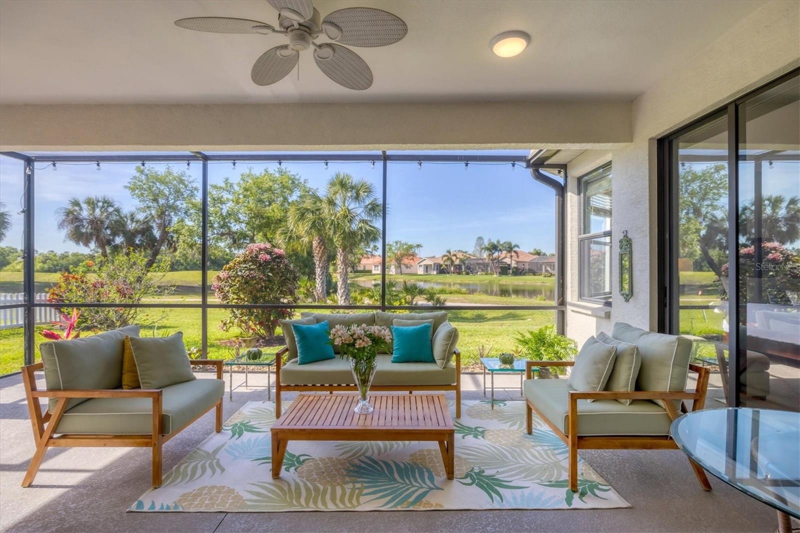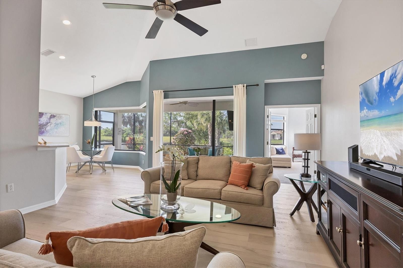 Welcome to The Preserve at Tara, where scenic beauty meets refined living. Set against sweeping lake and golf course views, this beautifully updated home delivers an exceptional blend of elegance, comfort, and tranquility. Lush landscaping creates a warm first impression, guiding you to an extended screened lanai—an ideal space to unwind while enjoying the peaceful surroundings. Inside, the thoughtfully designed kitchen will impress even the most discerning chef, featuring a natural gas range, quartz countertops, breakfast bar, pantry, and a striking aquarium window that perfectly frames the outdoor scenery. Adjacent to the kitchen, the formal dining room is bathed in natural light from expansive windows, creating an inviting space for entertaining. The great room is truly stunning, highlighted by soaring 14-foot ceilings, graceful archways, rounded wall corners, and sliding glass doors that open seamlessly to the lanai for effortless indoor-outdoor living. The spacious primary suite serves as a private retreat, offering a cozy seating area, walk-in and built-in closets, and direct access to the lanai. The spa-like primary bath features dual vanities, a walk-in shower, and a separate soaking tub. Two additional bedrooms offer high ceilings and generous closet space, while the guest bath is updated with a quartz countertop and a tub/shower combination. Throughout the home, you’ll find tasteful upgrades including tile, luxury vinyl plank, and carpet flooring, ceiling fans in every room, and a recently updated HVAC system (2024). Practicality meets convenience with a two-car garage and modern appliances, including a gas range (2021), microwave (2021), water heater (2021), and dishwasher (2022). Residents of The Preserve at Tara enjoy access to community amenities such as tennis courts, pickleball, and a resort-style pool and spa. Golf enthusiasts can take advantage of optional membership or pay-as-you-play access to The Preserve Golf Club, featuring a Ted McAnlis Signature course designed to harmonize with Florida’s natural wetlands. Ideally situated, this home provides effortless access to the Gulf Coast’s finest attractions—world-famous beaches, Downtown Sarasota, Lakewood Ranch, Waterside Place, and University Town Center Mall—all just minutes away. Convenient proximity to I-75, shopping, dining, and entertainment are always within easy reach.
