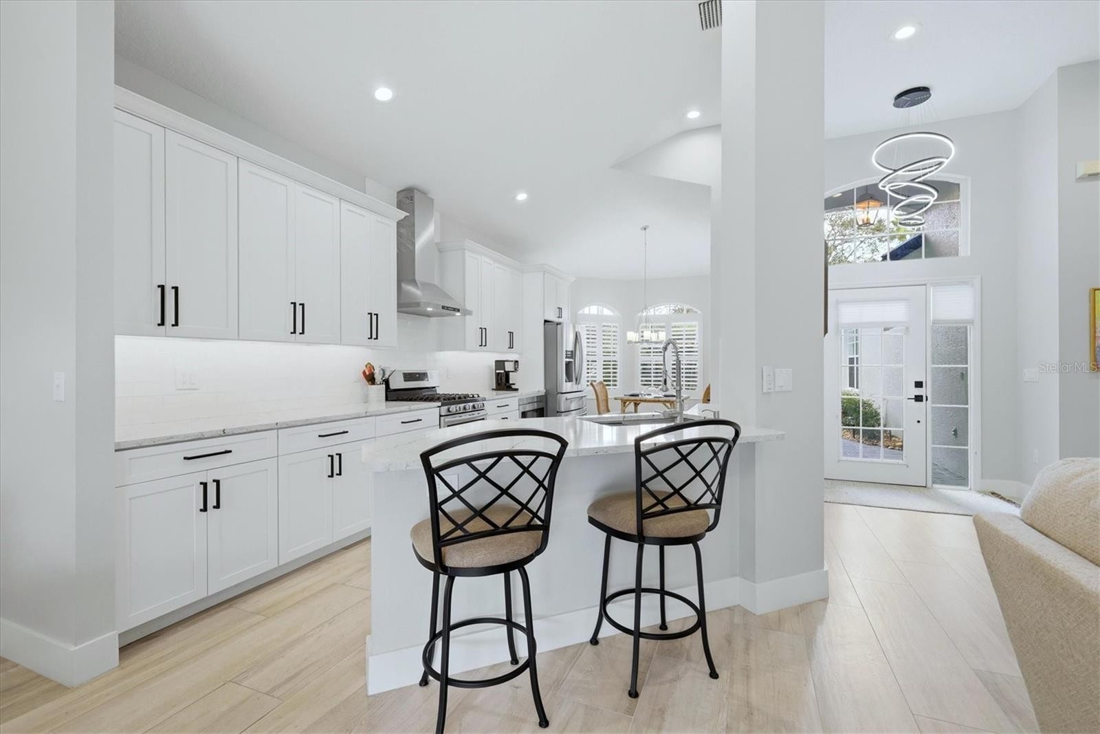 Behind the gates of Lakewood Ranch Golf & Country Club, this beautifully renovated single-family home in the desirable maintenance-free Muirfield neighborhood offers the rare combination of luxury updates, privacy, and a short distance to the community pool. Tucked away on a quiet cul-de-sac, the home enjoys open lake and preserve views, creating a peaceful backdrop with frequent wildlife sightings. This residence has undergone an extensive renovation of over $200,000, giving it the look, and feel of a new home. Major improvements include a new tile roof, new gutters, replaced HVAC system, and new water heater. Inside, the home showcases new porcelain tile flooring throughout, all new lighting and ceiling fans, and a freshly painted interior and exterior with enhanced landscaping. A Tesla EV charging system has also been installed for modern convenience. Step through the glass front entry into a bright, open floor plan designed for effortless indoor-outdoor living. The great room features a striking electric fireplace framed with stone and shiplap detailing and a wall of disappearing sliding glass doors that open seamlessly to the outdoor living area. The resort-style outdoor space is designed for entertaining and relaxation, featuring a saltwater pool and spa, a covered lanai with wood ceiling, outdoor kitchen, and a custom tiled feature wall with flat-screen TV—perfect for enjoying Florida’s year-round lifestyle. The fully renovated gourmet kitchen is a standout, offering new soft-close shaker cabinetry, stone countertops, new appliances, and designer backsplash tile. It flows naturally into the casual dining nook with bay windows, while the formal dining room sits just off the great room for easy entertaining. Guests and family are comfortably accommodated with two additional bedrooms, including one with a built-in Murphy bed, along with a beautifully updated full guest bathroom. The primary suite provides a private retreat with a spacious sleeping chamber, walk-in closet with custom organizers, and an additional walk-in closet in the primary bath for extra storage. The completely renovated primary bathroom showcases double vanities with elegant stone countertops, dramatic large-format tiled walls, and an expansive walk-in shower featuring dual rain shower heads, river stone flooring, and sleek frameless glass enclosure. Additional highlights plantation shutters, renovated laundry room with new cabinetry, sink, and laundry tub, making everyday tasks both functional and stylish. With extensive upgrades, serene lake and preserve views, and a prime location within Lakewood Ranch Golf & Country Club, this home is truly move-in ready. A complete detail list is available. Optional membership opportunities are available at Lakewood Ranch Golf & Country Club, offering an exceptional lifestyle with no mandatory membership. Members enjoy access to four 18-hole championship golf courses, 18 Har-Tru lighted tennis courts, pickleball courts, a state-of-the-art fitness center, junior Olympic-size pool and aquatic center, and luxurious clubhouses featuring dining, social events, and activities. Located within Lakewood Ranch, the #1 top-selling master-planned community in the country, residents benefit from abundant amenities including parks, scenic walking trails, top-rated schools, and an array of shopping and dining options. Great location with close proximity to dining, beaches, UTC mall, SRQ airport, and downtown Sarasota.