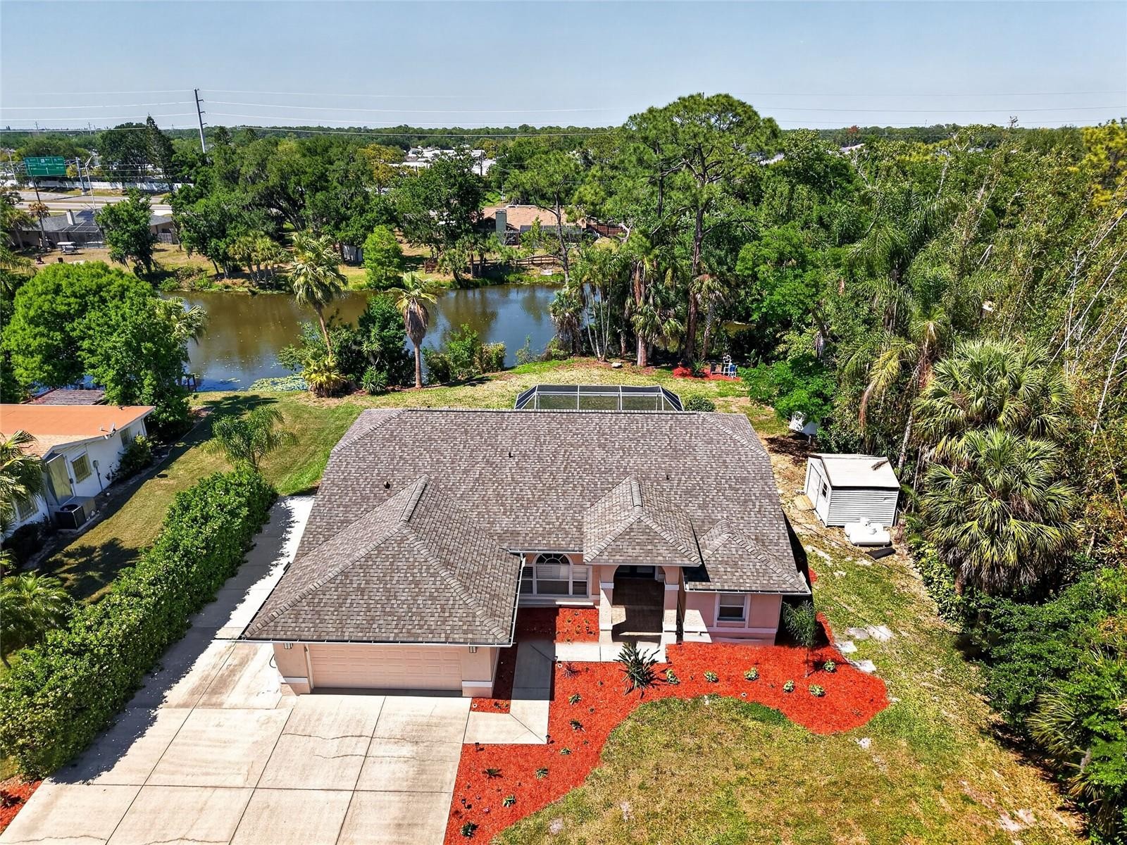 Welcome to this beautifully maintained three-bedroom, two-bath home, perfectly positioned in a highly desirable location with NO CDD and NO HOA—offering both freedom and value. From the moment you arrive, you’ll notice the expansive concrete driveway extending alongside the garage, providing ample space for a boat, RV, or work vehicles—an uncommon and highly sought-after feature. Step inside to discover soaring high ceilings and an abundance of natural light pouring through large windows, creating an open, airy atmosphere that feels both inviting and spacious. The thoughtfully designed layout includes generously sized bedrooms, ideal for families, guests, or a comfortable home office setup. The oversized backyard features beautifully maintained flower bed areas and plenty of room to relax or entertain. Unwind on the large screened lanai, complete with a nearly new hot tub, all while enjoying peaceful pond views that add a sense of serenity to everyday living. This home offers true peace of mind with major updates already completed: A/C, roof, washer, dryer, and refrigerator—all replaced within the past two years. A generator with two propane tanks is also included, ensuring reliable backup power when you need it most. Ideally located with convenient access to the highway, commuting and daily travel are effortless. Move-in ready and meticulously cared for, this home combines comfort, functionality, and tranquility in one exceptional package. Simply bring your personal belongings and start enjoying everything it has to offer. Opportunities like this don’t come often—schedule your showing today and make it yours.