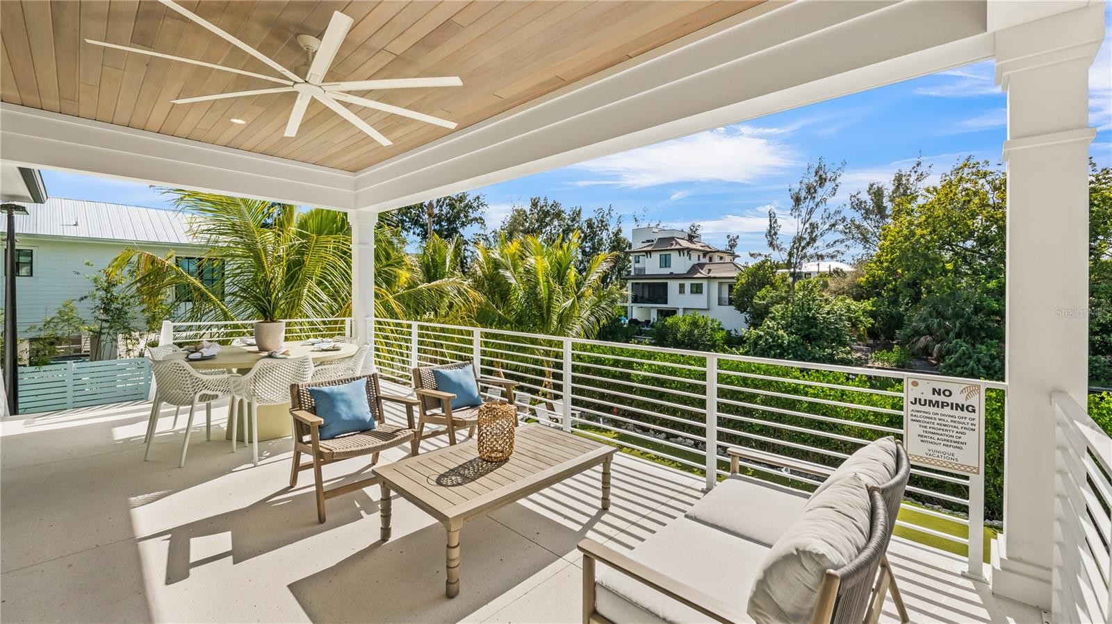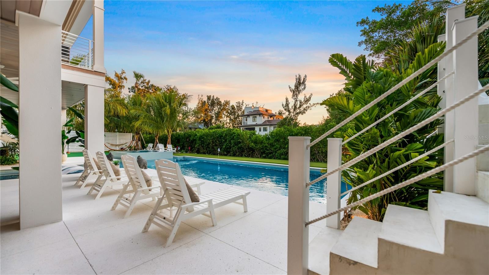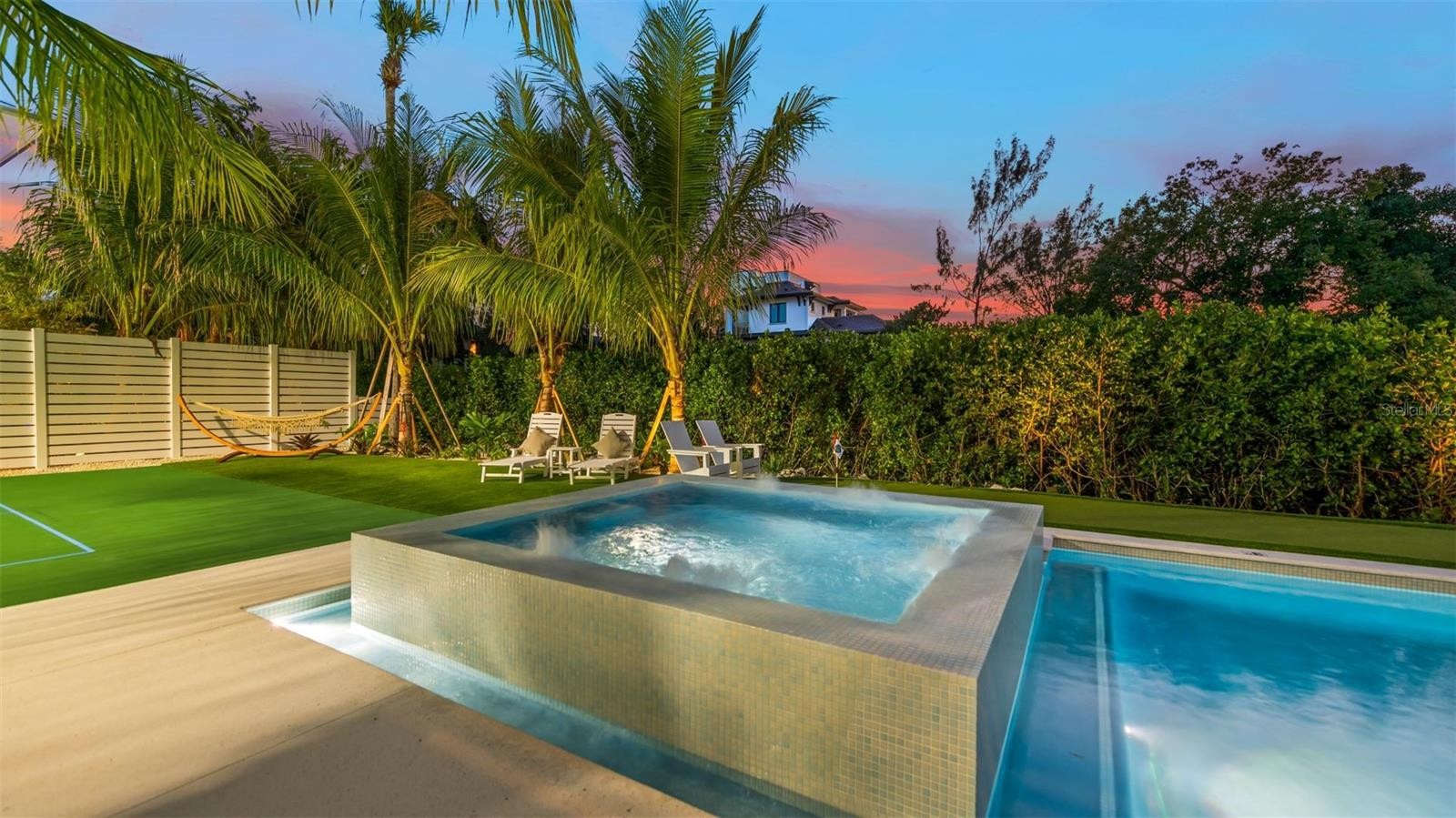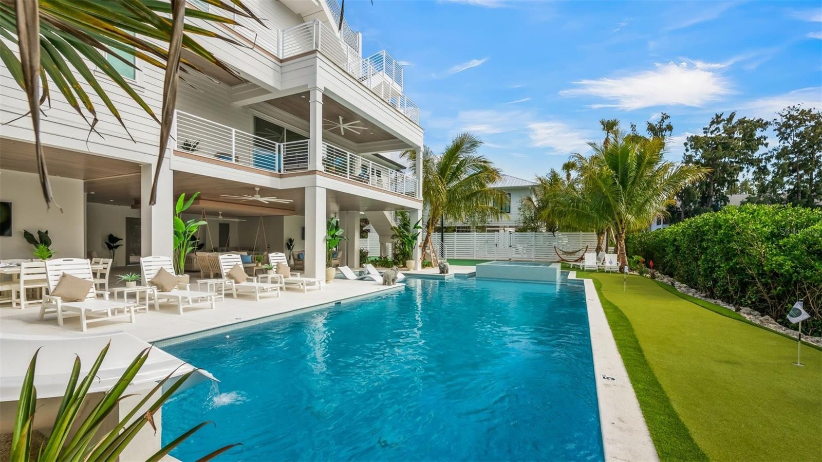 There is only one — Siesta Sun Sets. Set against the quiet backdrop of Sabal Lake, with glimpses of the Gulf beyond, this residence unfolds with a sense of irresistible intention. Influenced by West Indies architecture, the design blends expansive indoor-outdoor living with natural textures, layered spaces, and a palette that mirrors its surroundings — soothing, sun-washed, and enduring. Across more than 4,000 square feet, the home offers seven incredible en-suite bedrooms and multiple living areas designed for both gathering and restful retreat. The great room anchors the experience, where kitchen, dining, and living spaces open outward to twin balconies — one overlooking the extensive grounds, the other framed by mature oaks, offering a quiet contrast of shade and light. Above, a private club level introduces a more intimate setting — a theater-style lounge, additional suites, and access to the rooftop deck. It is here, at the highest point of the home, that the name reveals itself. As day transitions to evening and the Gulf reflects gold, the softening sky reveals stunning sunsets, becoming the backdrop against which you count your blessings. Below, the grounds are equally considered. A multi-sport court — rare in both scale and versatility — sits alongside a resort-style pool and 360-degree spillover spa, creating a setting as seductive as it is serene. Covered outdoor living spaces extend the home’s presence, offering multiple areas for dining, gathering, and quiet retreat, all within a private, fully enclosed landscape. Siesta Sun Sets is not defined by any one feature, but by the way it brings them together — water, light, elevation, and space — into a residence that feels both grounded and removed, exclusive and secluded. A masterwork of resilient engineering and high-end coastal construction, this estate is architecturally primed to withstand coastal elements while serving as a premier venue for grand-scale entertaining and lucrative seasonal retreats. More than a home, Siesta Sun Sets is part of an exclusive Vunique collection with a proven history of strong rental performance — each residence one-of-one, purpose-built to balance bold design and bespoke experience. Here, ownership transcends address; it becomes a mark of belonging to something beautifully uncommon.