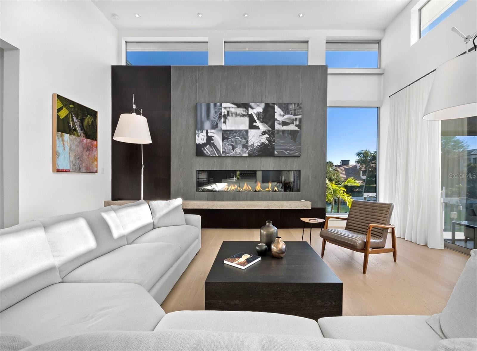 A showcase of architecture and radiant light, this 3BR/3.5BA residence commands a beautifully landscaped extended corner lot on one of Bird Key’s premier canal-front properties. The 2023 Murray Homes design boasts crisp lines, expanses of glass and warm wood accents that signal the home’s elevated contemporary character. Step inside and the design intention becomes unmistakable, as skylights, clerestory windows and full-height sliders flood every room with natural light and create a sense of openness that feels both artful and effortless. The kitchen is a striking focal point, styled with low-profile cabinetry, stone surfaces, top-tier stainless-steel appliances and a gas range. A large breakfast bar connects seamlessly to the dining and living areas, while a back-kitchen area keeps the main space sleek and uncluttered. The living room is a bright retreat anchored by a custom accent wall with a gas fireplace and wrapped in soaring windows and glass doors. The primary suite offers a spacious, quiet refuge with pool access, a custom walk-in closet and a stunning modern bath with floating dual vanities, freestanding tub, separate water closet and an open shower. Sliding glass doors lead to the pool terrace, where covered sitting areas with roll-down hurricane-rated screens, a full summer kitchen, expansive paver deck and open pool create an inviting outdoor living environment. The canal-front setting provides exceptional boating water, quick access to the bay and a large dock with 16,000 LB boat lift - 158' seawall. This amenity rich home also features a whole-home generator, irrigation well for landscaping, oversize garage perfect for car lifts, and water purification system.