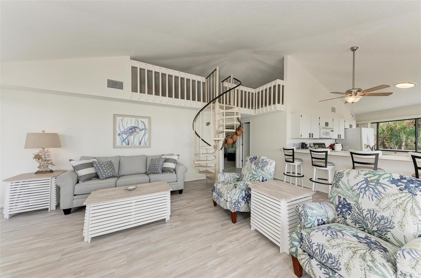 A secluded & private, nearly one-acre tropical paradise surrounds this beachfront coastal-style home. A spectacular property with its own private beach! Unsurpassed Gulf Views will take your breath away! As you enter, you gaze across the spacious and open floor plan, through the windows that open onto the wrap-around expansive deck, and out to the stunning views of the beautiful beach and sparkling Gulf. You notice how the sunlight pours in, fills the home with light, and lifts your spirits. Soaring high ceilings, tile floors in the kitchen area, and an incredible amount of cabinets, closets, and storage in this home. This home is spacious with 2 Bedrooms, 2 Bathrooms. There is currently a queen sofa bed in the living room. Plus a great loft area for additional guest space You will never want to leave when you watch in awe the spectacular nightly performance, sunsets on the gulf! There are so many spaces that beckon you to enjoy time with family and friends as you blissfully watch the ospreys soar, the pelicans dive, and manatees and dolphins playing in the shimmering sea. The yard is true serenity for a nature enthusiast and beckons you to meander through the island-style lush & park-like grounds with many Oak and Palm trees. The unique shape of this home will give you breathtaking views of Southwest Florida sunsets. You will never miss a sunset as the never-ending panoramic views of the Gulf of Mexico are available to you from inside the home, outside around your property, and on the beach. This home is tucked back from the road and the mature landscape offers added privacy. And just steps away through your private backyard, you step out to your private beach where you can relax and sink into the sand with a frosty beverage in your hand. This is a desirable and unique location walking or biking distance to a park with playground, beautiful trails through mangrove forests, and additional public fishing docks, pavilion & picnic areas.