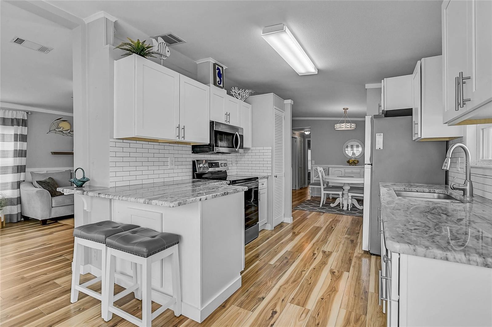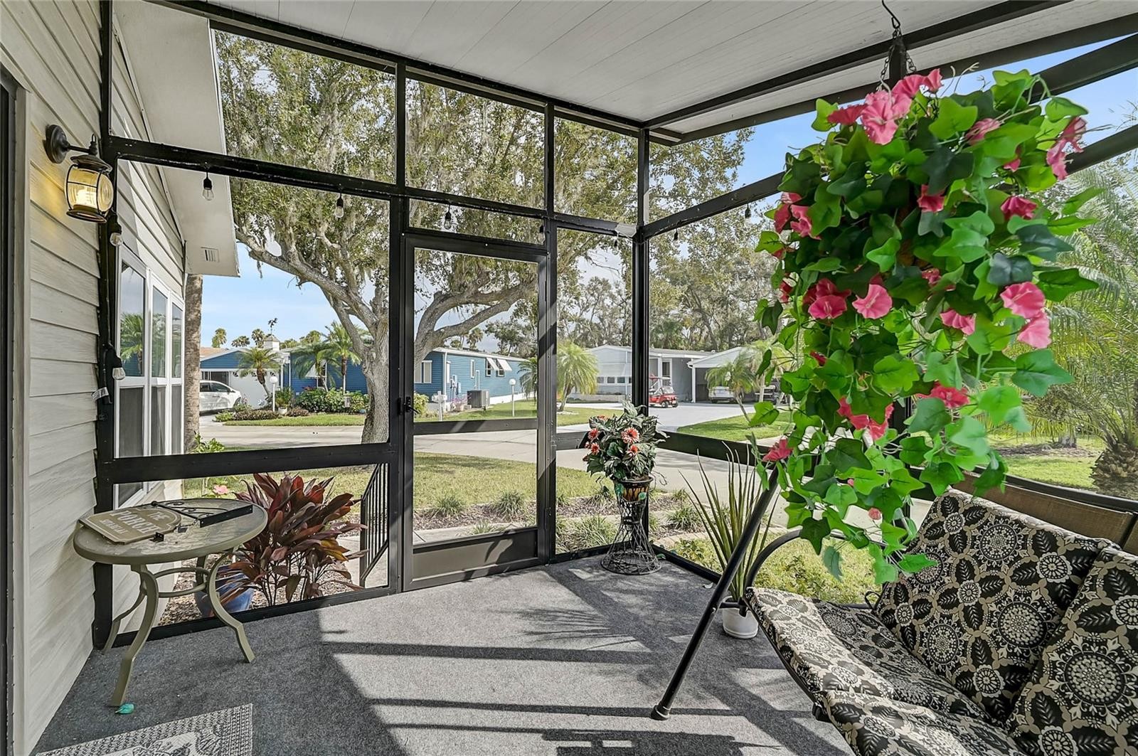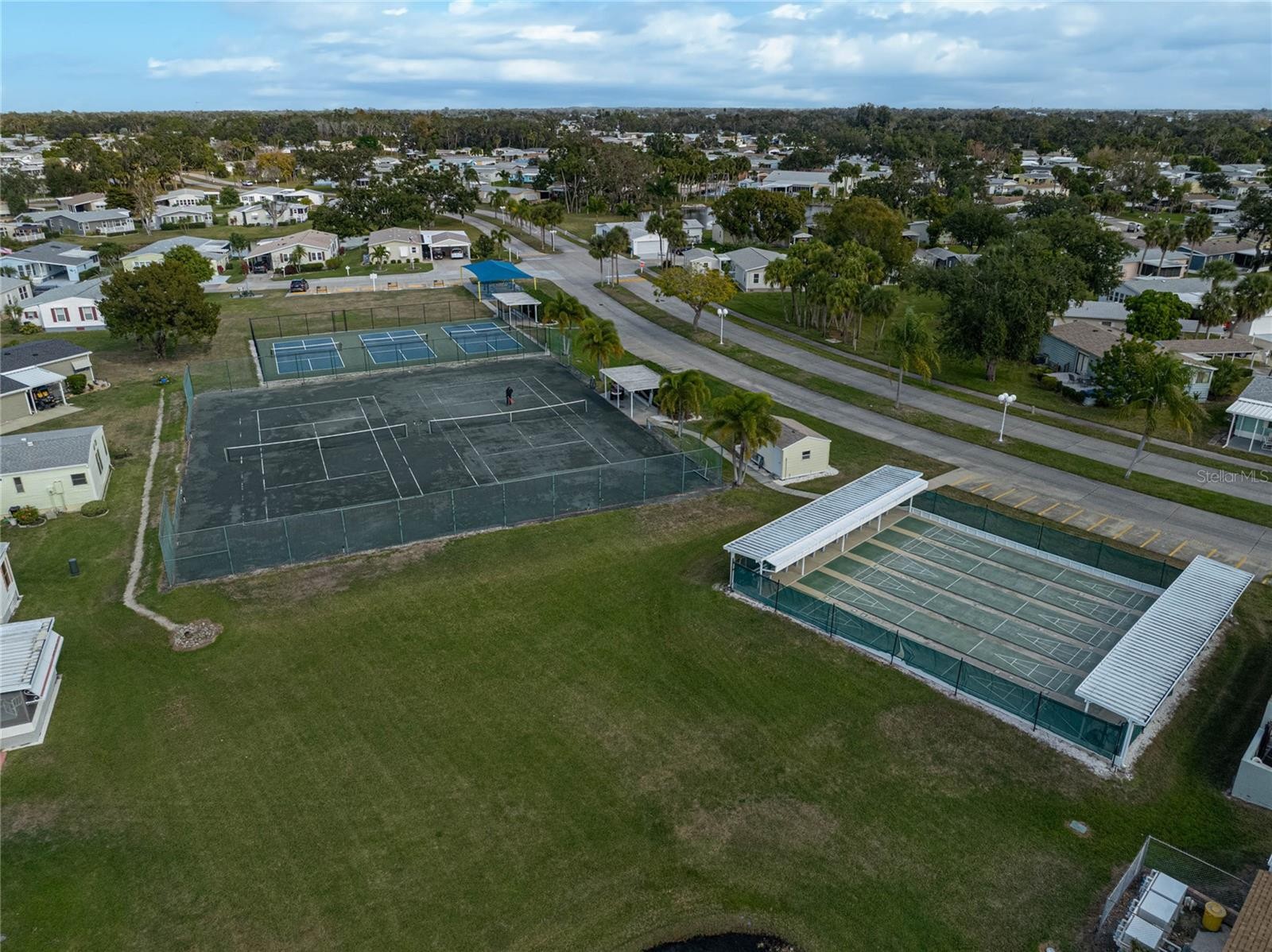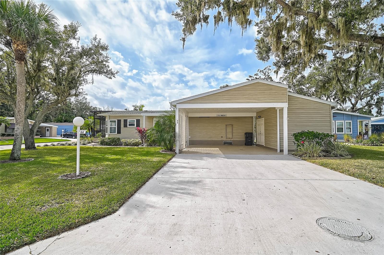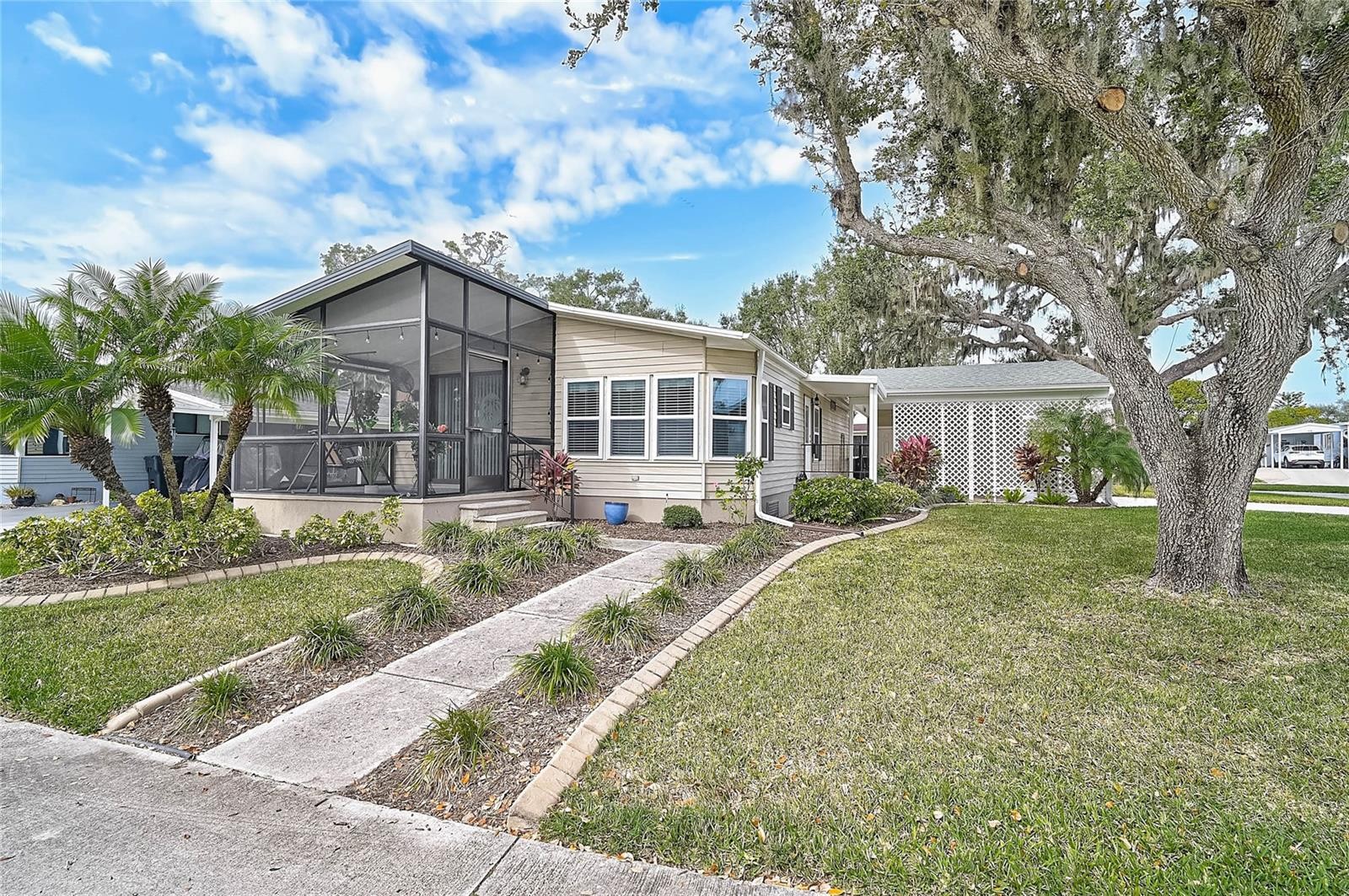 Discover your own slice of paradise and you owned the land, NO LOT FEES! This beautifully updated and partially furnished 2-bedroom, 2-bath ranch-style home sits on one of the largest corner lots in the desirable Ridgewood Oaks, a 55+ gated community with 24-hour security. Surrounded by lush landscaping, the property features a majestic oak tree that offers exceptional privacy and natural shade. The exterior showcases pristine steel siding along with a newer roof, impact windows, doors, with plantation blinds. The screened lanai has been recently upgraded, and the oversized double carport doubles as a perfect outdoor entertaining space, finished with a unique epoxy-coated floor that extends to the steps and front porch. You can easily convert the carport to an oversized double garage. An additional structure provides ample space for a golf cart garage, workshop, or extra storage. The property offers parking for up to six vehicles. Inside, the home has been completely remodeled and thoughtfully designed to resemble a charming coastal craftsman cottage. Enjoy water-resistant hickory wood plank flooring throughout, fresh paint, drywall, custom craftsman trim, plantation shutters, and updated window treatments. The kitchen features new shaker-style soft-close cabinetry, granite countertops, and stainless-steel appliances. The spacious primary suite includes a walk-in closet for added comfort. Conveniently located just steps from the clubhouse and pool, this home also includes lawn care, irrigation, and internet/cable services within the low quarterly HOA fee. Ridgewood Oaks offers an impressive array of amenities including a clubhouse with social activities, swimming pool, spa, clay tennis courts, pickleball courts, shuffleboard, and an outdoor fitness area. The community is golf cart–friendly and welcomes small pets. Ideally situated near I-75, residents enjoy easy access by car or golf cart to shopping, dining, banks, a library, outlet mall, and waterfront restaurants along the Manatee River. With everything so close, you may never need to leave your driveway!