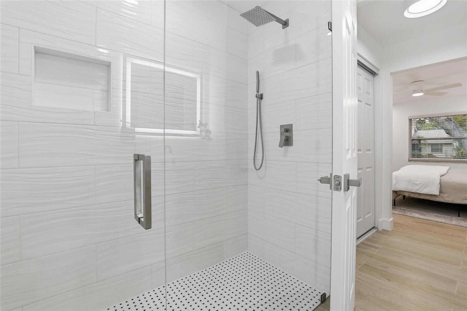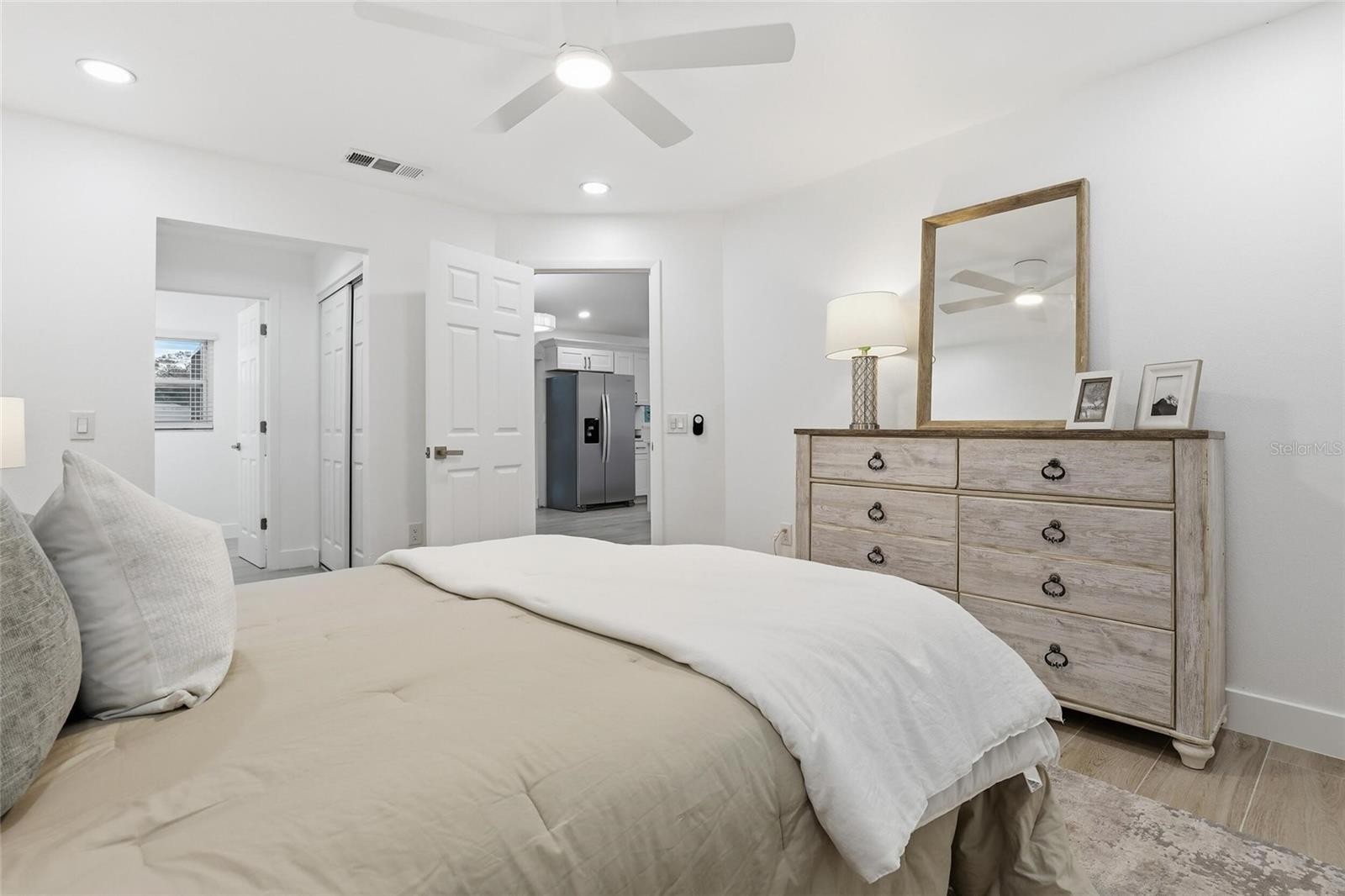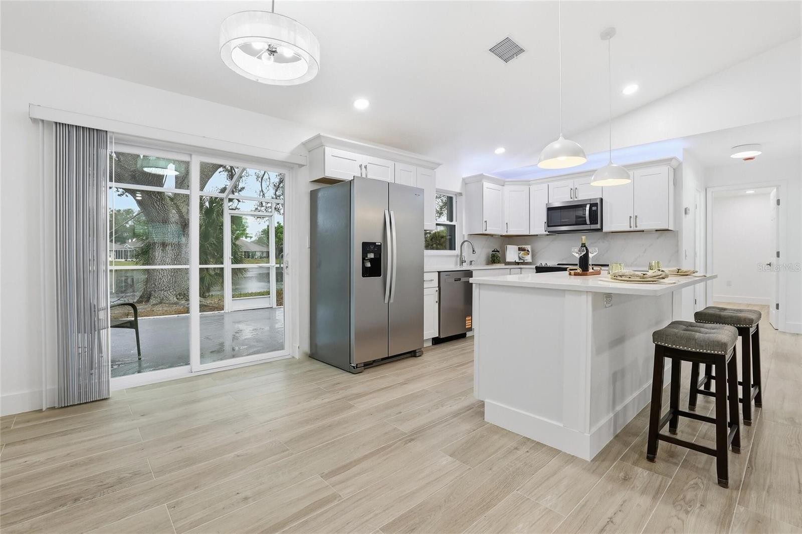 Fully renovated 2-bedroom, 2-bath split floor plan home in the highly desirable Chestnut Creek community of Venice. The interior features tile plank flooring throughout and a redesigned kitchen with quartz countertops, custom cabinetry, and a spacious island, creating an open, modern living area suited for everyday living and entertaining. The primary suite includes a custom walk-in tiled shower with glass enclosure, and the home is enhanced with custom window treatments throughout. Recent improvements include a brand-new AC system, impact windows, and a tankless hot water heater for energy-efficient, on-demand hot water. Enjoy Florida living from the screened lanai with tranquil lake views, providing a relaxing outdoor space year-round. Conveniently located near beaches, shopping, dining, golf, and area amenities. Move-in ready home with quality upgrades throughout.