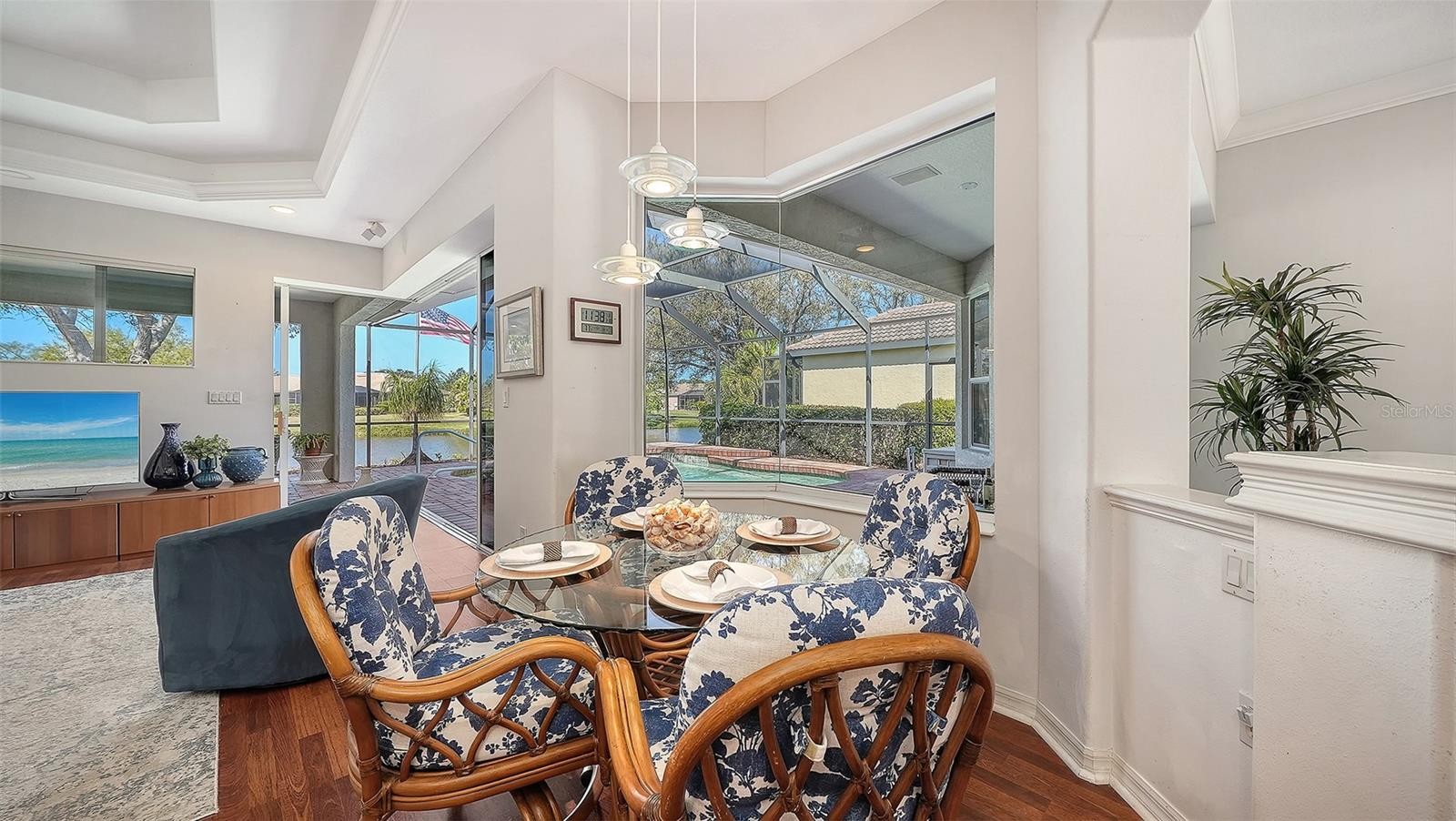 Discover a blend of comfort and sophistication in this meticulously maintained home in the desirable Willowbend community. The striking architecture of the Ashley floor plan makes it a favorite. Go into a serene oasis featuring breathtaking wide lake views overlooking a sparkling pool, complemented by desired western exposure that invites an abundance of natural light and showcases vibrant sunsets. Gourmet kitchen with natural gas range, stainless dishwasher and refrigerator (new 2026). The interior boasts custom features, including crown molding and elegant tray ceilings. This spacious four-bedroom, three-bath home includes a chef's kitchen outfitted with natural gas cooking, as well as a cozy eat-in area with an aquarium window that beautifully frames the pool and lake views. The owner's suite serves as a sanctuary, offering two walk-in closets and a luxurious bath complete with dual sinks, a walk-in shower, a soaker tub and a separate toilet for added privacy. Thoughtfully designed with a split floor plan, the home ensures guests enjoy ample separation from the owner's suite for optimal comfort. A full-size laundry room adds to the home’s convenience. This exceptional residence is a blank canvas for an extraordinary lifestyle, conveniently near downtown Venice and Sarasota, beautiful beaches, Pine View School and the Legacy Trail. With no CDD fees and in a preferred X flood zone, the low community fees cover ground maintenance, irrigation and access to a community pool and spa, gym, pickleball courts, as well as high-speed internet and DirecTV streaming. Embrace the lifestyle you’ve always dreamed of in this stunning Willowbend home.