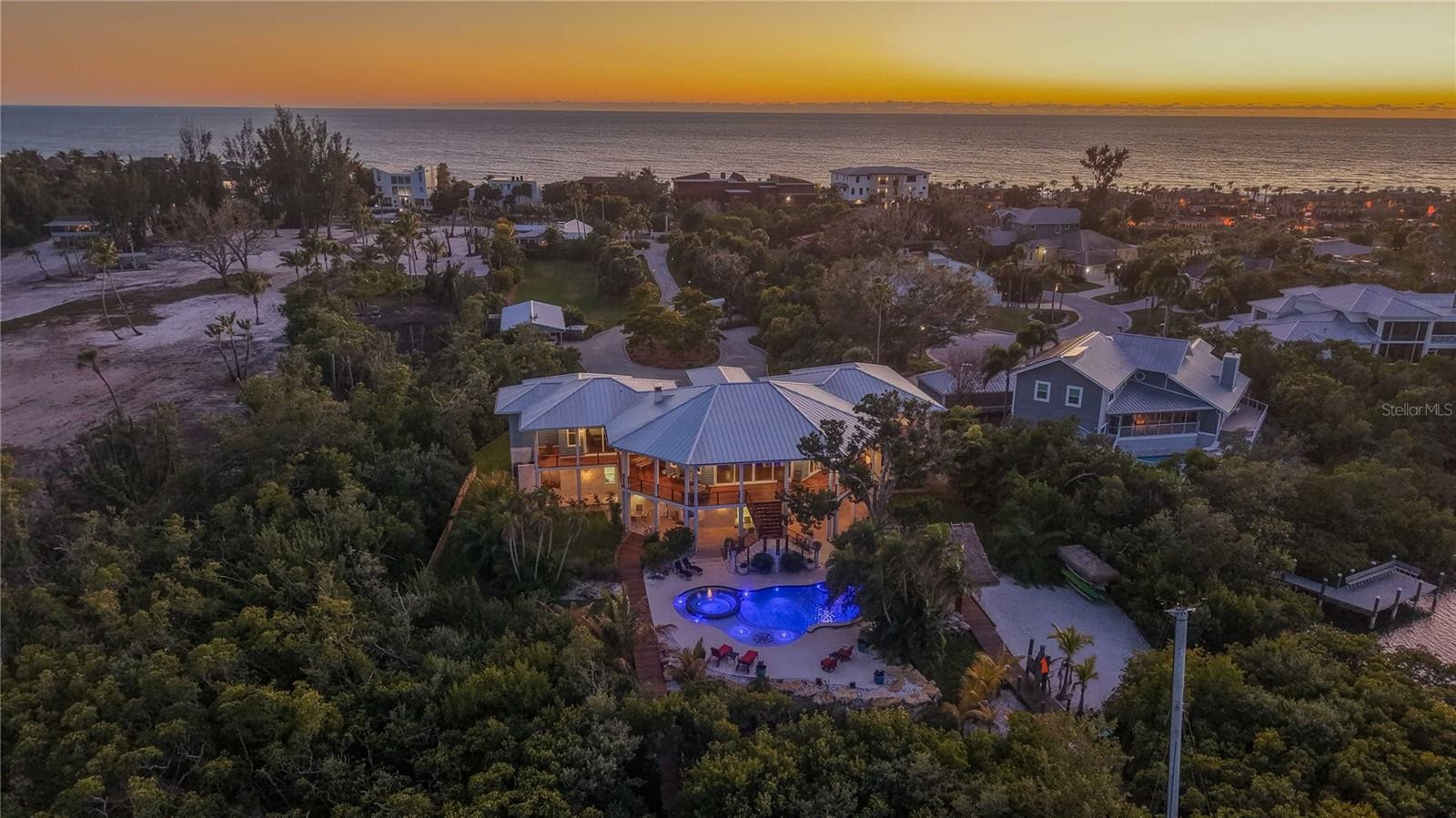 Welcome to a once-in-a-generation private waterfront family compound on the coveted north end of Longboat Key—an extraordinary two-acre, fully gated coastal estate that blends architectural mastery, resort-level amenities, and rare development potential. Encompassing four buildable parcels (500, 510, 520 Nomas Way and 6680 Gulf of Mexico Drive), this legacy property offers unparalleled privacy, flexibility, and long-term value. From the moment you arrive, illuminated by classic Bevelo gas lanterns, the estate unfolds with intention and elegance. The custom-designed main residence is complemented by a separate 3-bedroom, 2-bath, 1,850-sq-ft guest home with a detached garage—perfect for extended family, guests, or staff accommodations. Every detail reflects thoughtful craftsmanship, from the 900-bottle red cedar wine cellar to the oversized custom wood-burning fireplace with gas option. Designed for both grand entertaining and everyday indulgence, the chef’s kitchen features natural gas cooking with Wolf and Sub-Zero appliances, while state-of-the-art home automation and whole-home sound elevate daily living. Step outside to a true private resort: a 15,000-gallon free-form pool with a 1,000-gallon spa, heating and chilling via reverse heat pump and natural gas, and an expansive custom tiki pavilion built for unforgettable gatherings. For boating enthusiasts, this estate is unmatched—165 feet of frontage on Bishops Bayou, two docks, three boat lifts, and deep-water, direct Intracoastal access. Across Gulf of Mexico Drive, deeded private beach access makes turquoise waters and nightly sunsets a daily ritual. Car collectors and hobbyists will appreciate six garages, including an automotive lift, plus a 50’ x 24’ covered pole barn for additional storage. Peace of mind is absolute with a 24-camera security system, safe room, elevator, and a 60kW natural gas generator powering the entire estate during any weather event. Fully fenced and gated, this property offers complete privacy without compromise. This is more than a home—it is a coastal masterpiece, a designer’s dream that exudes sophistication, balance, and harmony. An irreplaceable opportunity to own one of Longboat Key’s most remarkable waterfront estates, where luxury, security, and lifestyle converge in perfect alignment.