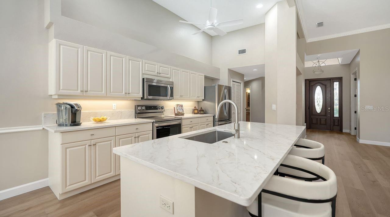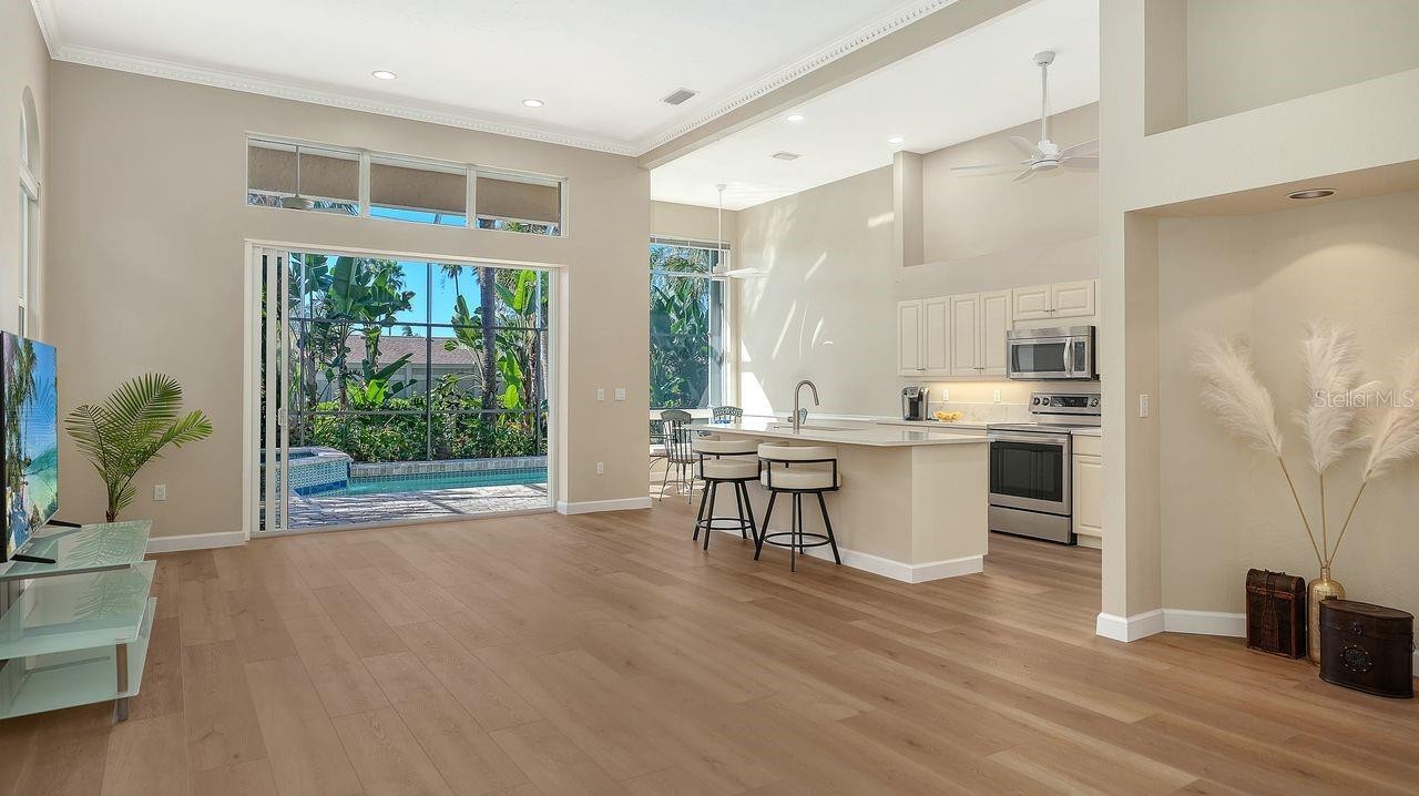 Experience modern Florida living at its finest in this tastefully remodeled two-bedroom, two-bath home with an office, located in the gated quiet community of Marbella within Palmer Ranch. Designed with style, comfort, and ease in mind, this residence offers an elegant open floor plan filled with natural light, 12-foot-high ceilings with luxurious sculptured dentil crown molding and sophisticated finishes throughout. Watch the sunset from your lanai or living room with East-West exposure. Comfort and safety define this property by providing protection with a combination of impact windows and a full folding metal hurricane curtain across the West side of the house. The interior features a modern, open-concept design with beautiful new flooring and spacious living areas that flow seamlessly together. The remodeled kitchen impresses with sleek quartz countertops, custom cabinetry, large island, and a dining area — ideal for both everyday living and entertaining. The primary suite provides a peaceful retreat with two closets, one of which walk-in and a spacious bathroom featuring granite countertops, custom cabinetry, a jacuzzi tub, and a separate walk-in shower. Access your pool directly from your bedroom through a 10-foot door! Privacy is respected with a corridor leading to the second bedroom. The guest bathroom features custom cabinetry, onyx sink and stone walk-in shower. The office/ den offers built-in desk and bookshelves and ample space for a sofa bed. Step outside to your private screened lanai, really charming with lush tropical landscaping surrounding the sparkling saltwater pool and spa, creating a serene, resort-like setting. An outdoor kitchen with grill and refrigerator makes it easy to enjoy “Al Fresco” dining or entertain guests under the Florida sun — all in complete privacy. Added conveniences include a two-car garage, ample storage throughout the property, a newer roof (5 years old), a whole-house water filtration system, and pavers on the driveway and lanai. This home was repiped in 2004. Low homeowners’ association (HOA) fee a $175 per month and no assessment in the community of Marbella. This home is truly one-of-the-kind and offers the ultimate combination of privacy, modernity, convenience and style. This property is situated in a non-flood zone and enjoys a tranquil environment (no rental permitted). Located just 12 minutes drive from the renowned Siesta Key and 5 mn from the Golf courses of TPC Prestancia and sports facilities. The Legacy Trail perfect for walking and biking is less than half mile away. Shopping and fine dining options are conveniently located within proximity. The property is ready to move in so schedule your private showing today! Virtual Tour Available!