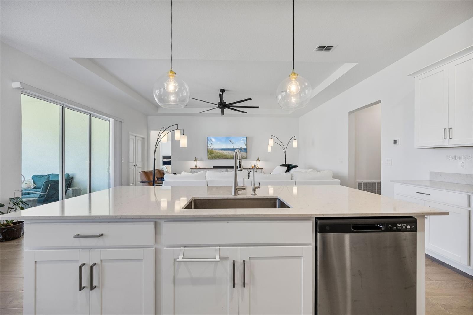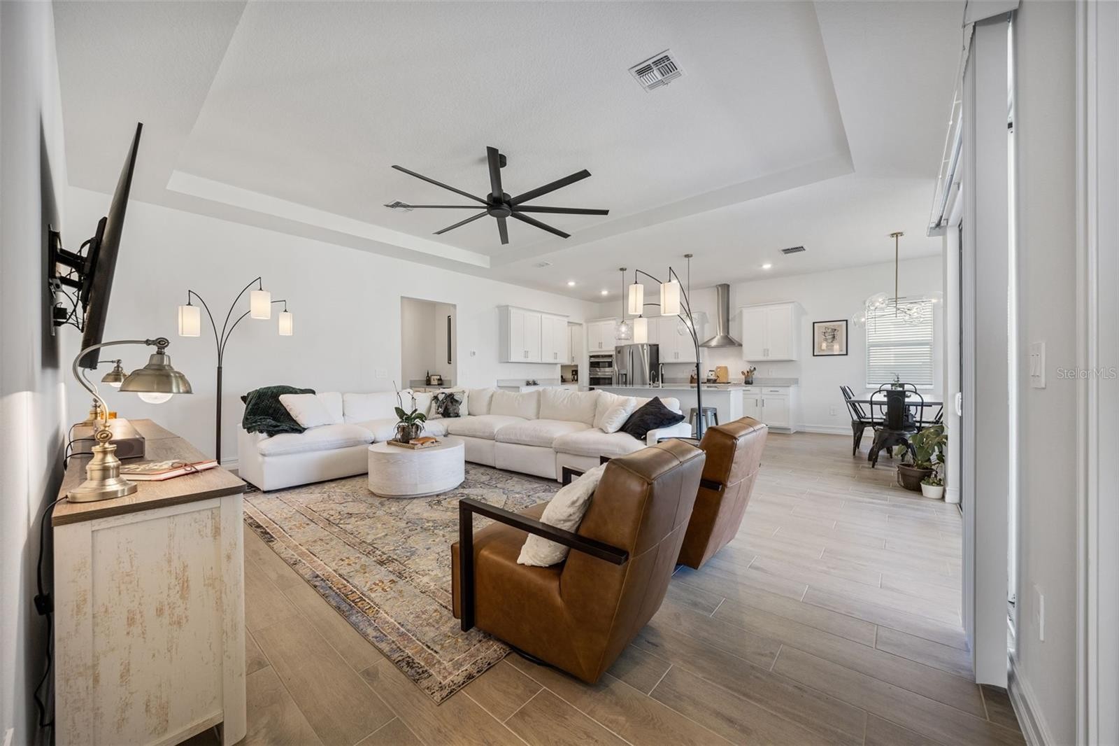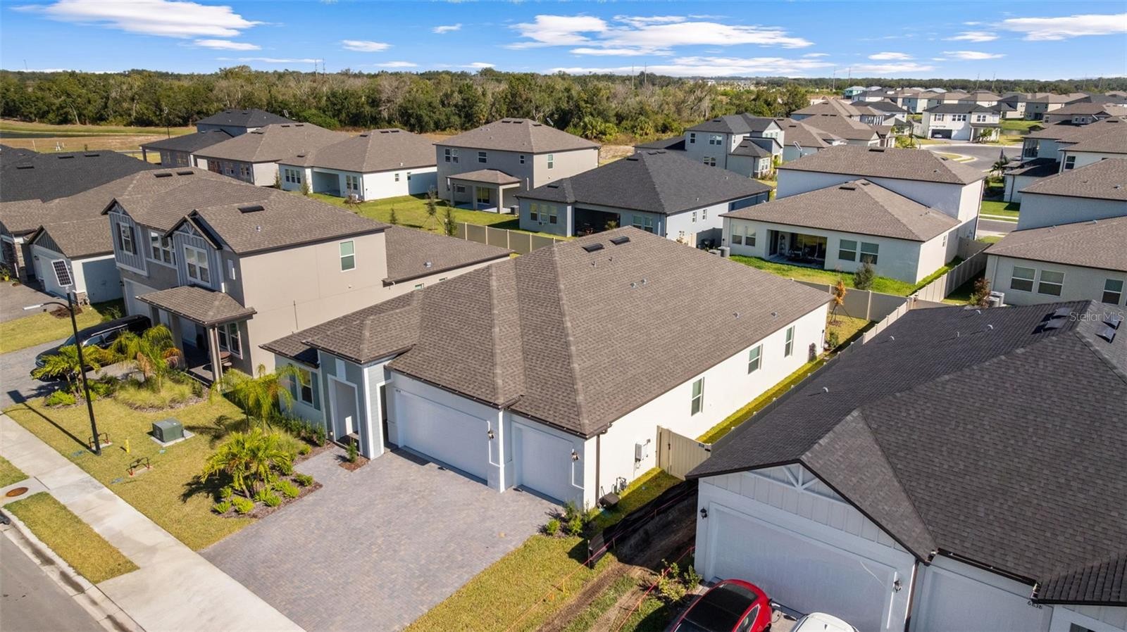 Experience elevated comfort and style in this brand-new 2025 Lennar Home, offering 4 bedrooms, 3 bathrooms, an office/flex room, and 2,610 sq. ft. of beautifully designed living space in the desirable Stonegate Preserve community. From the moment you arrive, the brick-paver driveway and manicured landscaping create a warm, welcoming first impression. Step inside to a bright foyer featuring wood-look ceramic tile, elegant coffered ceilings, and thoughtful architectural details throughout. Toward the front of the home sits a spacious bedroom with access to a full bathroom featuring dual sinks and a partition for added privacy—ideal for guests or multigenerational living. Down the main hallway, you’ll find two additional bedrooms, each with plush carpeting and generous closets. Continue on to discover a stylish dry bar with a wine refrigerator, plus a built-in workstation perfect for remote work or homework. Nearby, the laundry room offers a utility sink and extra storage. A modern second full bathroom sits adjacent to the fourth bedroom, complete with an upgraded shower. The heart of the home is the expansive open-concept living and dining area, highlighted by another coffered ceiling, a large ceiling fan, and sliding glass doors that lead out to the covered patio—perfect for indoor-outdoor living and entertaining. The chef’s kitchen is a true showstopper, equipped with stainless steel appliances, including a gas stove, range hood, dishwasher, microwave, and built-in oven. Enjoy a walk-in pantry, a large island with seating, a dedicated coffee bar, and abundant cabinet and counter space. Retreat to the luxurious primary suite, featuring coffered ceilings, a massive walk-in closet, and a spa-inspired en suite bathroom with dual vanities, a modern walk-in shower, a soaking tub, and a private water closet. An additional office/flex space provides room for a home gym, playroom, or quiet workspace. The home also boasts a three-car garage and a fully fenced backyard, offering plenty of room for pets, gardening, or outdoor relaxation. Residents of Stonegate Preserve enjoy resort-style amenities including a clubhouse, sparkling pool, fitness center, pickleball court, and a fully equipped playground. The location provides quick access to the stunning beaches of Anna Maria Island (just 30 minutes away), upscale shopping at the Ellenton Premium Outlets, and local entertainment such as the nearby marina featuring Pier 22 restaurant. Schedule your private showing today!