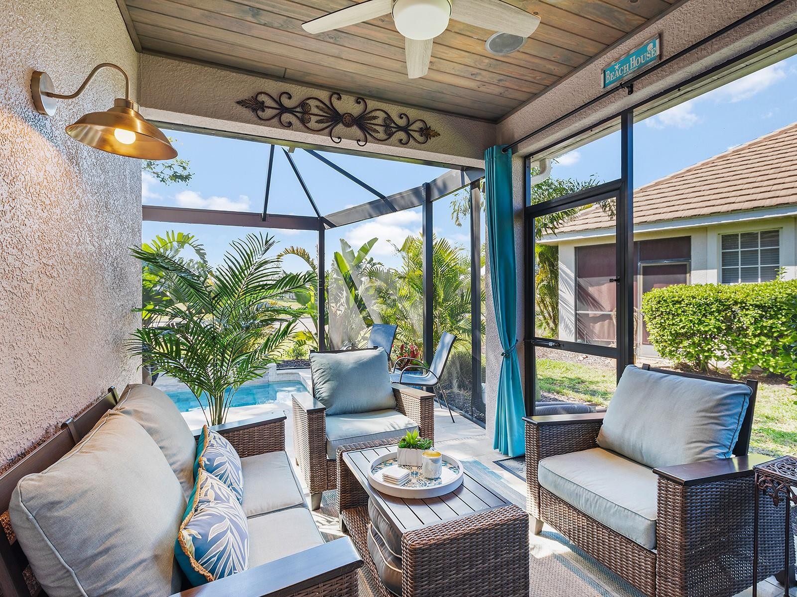 BRAND NEW 2025 ROOF, AND 2025 IMPACT WINDOWS AND SLIDING GLASS DOORS! Savor the best life has to offer at Lakewood Ranch Country Club from this charming villa offering a premier lot with both lake and golf course views, plus a highly desirable private pool! Overlooking the 17th hole of the Legacy Course designed by Arnold Palmer, this villa has SOUTHERN views of the unique island where golfers will play over the lake. The exterior and interior of this unit have been COMPLETELY renovated throughout 2025-2022 so you will have peace of mind knowing all you need to do is move right in! The modern interior is brought together by high ceilings with crown molding, plantation shutters, window treatments, neutral color palette, and wood-look porcelain plank tile flooring. Your functional front entry invites guests past a mature oak and 2025 lush landscaping through the glass front door; and includes a built-in storage bench inside at the large window, plus an art display niche with accent lighting and quartz shelves. The central great room has an open floor plan with custom wood feature wall, in-ceiling speakers and NEW 2025 IMPACT sliding glass doors to the lanai. Your outdoor oasis offers the ideal location to relax while taking in breathtaking views surrounded by tropical landscaping. The screen lanai features amazing 2023 upgrades with a panoramic screen enclosure, travertine pavers, tongue and groove wood ceiling and in-ceiling speakers. The saltwater pool with water feature, stone surround can also function as a spa with 8 water jets and has a 2025 pump. The private study with double glass French doors and shiplap feature wall offers a private place to work or can be flexible as an additional guest accommodation. Your elegant dining space is surrounded by bright windows with plantation shutters and 2023 designer chandelier. The chef’s kitchen features a plethora of upgrades with a 2023 complete renovation of the entire space. This spacious kitchen is larger than most you’ll find in villas and showcases beautiful quartz counters, peninsula with counter-height seating for guests, designer pendant lights, marble herringbone backsplash, added cabinetry with pots and pans drawers, 2022 stainless steel appliance suite, reverse osmosis system at the sink, and a custom designed integrated pantry tower with rolling shelves and wine refrigerator. The primary suite has relaxing lake and golf course views plus tray ceiling with crown molding, shiplap feature wall, and walk-in closet with custom shelving. The spa-like bathroom was completely renovated in 2023 with new long vanity and counters, porcelain tile feature wall, and walk-in shower with rain shower head and pebble floor. The guest bedroom and bath offer the same luxurious upgrades with a 2023 renovated bathroom and inviting bedroom. This villa offers the ultimate in easy living with grounds maintenance included in your HOA dues, an exclusive Weston Villas community pool, 2025 NEW ROOF, 2025 IMPACT WINDOWS AND SLIDING GLASS DOORS, 2025 gas water heater, 2022 whole-house water filtration system, and 2022 AC system. Appreciate a state-of-the-art fitness center, clubhouses, junior Olympic-sized pool, four 18-hole championship golf courses, tennis and pickleball and more by becoming a member of the Lakewood Ranch Country Club. Lakewood Ranch is the top multi-generational community in the country for 8 years in a row with award-winning shopping, dining, A-rated schools, parks, and nearby beaches.