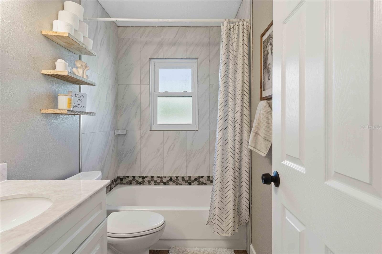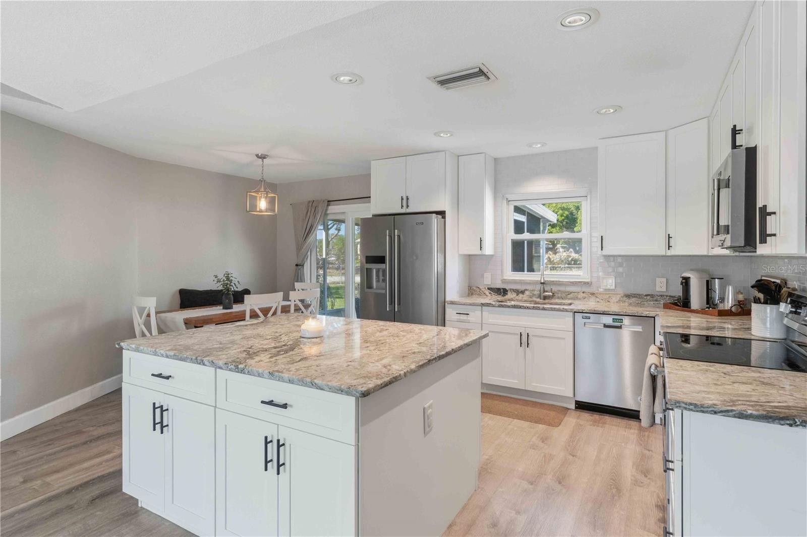 Welcome home to this beautifully updated 3-bedroom, 2-bathroom residence situated on an oversized lot (.42 acres) with a fenced in back yard. No HOA Fees, NOT in a flood zone, and protected by IMPACT RATED HURRICANE WINDOWS AND SLIDERS helping to keep your home protected and your insurance affordable. Brand NEW Roof in 2019, NEW water heater in 2020, and NEW AC in 2018. From the moment you step inside, you’ll appreciate the light, bright, and modern feel throughout. The heart of the home is the stunning, fully remodeled kitchen, featuring crisp cabinetry, stainless steel appliances, a stylish subway tile backsplash, and expansive granite countertops—perfect for cooking, entertaining, or gathering around the oversized island. The open-concept layout flows seamlessly into the dining area, where sliding glass doors bring in natural light and lead to the backyard, creating an ideal indoor-outdoor connection. The spacious primary suite offers a comfortable retreat, complete with an updated ensuite bath and modern finishes. Both bathrooms have been tastefully upgraded with contemporary vanities and fixtures for a clean, refreshed look. The garage was professionally converted/permitted giving you the unique aspect of having such a massive private room that could also be utilized as a private office or game room. Additional highlights include durable wood-look flooring throughout, recessed lighting, a neutral color palette, and generous living spaces ideal for everyday living or entertaining along with a metal shed. Conveniently located near shopping, dining, and major roadways, this move-in ready home is a great opportunity for a primary residence, seasonal home, or investment property.