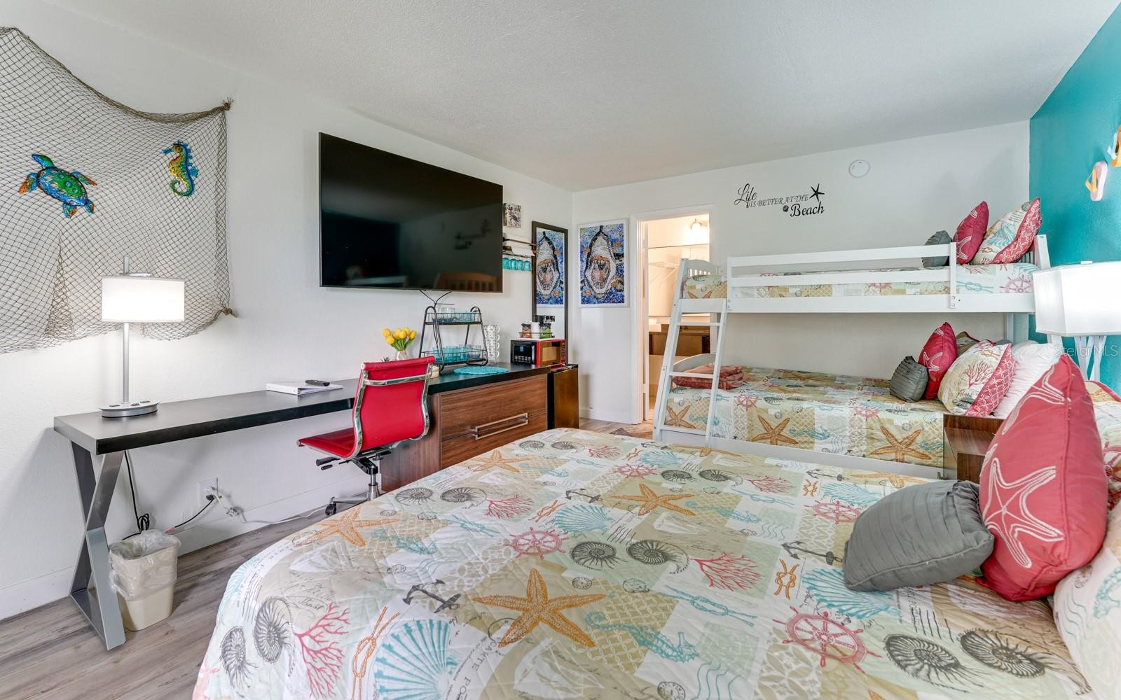 Enjoy your getaway with the full hotel experience at the Ramada Inn, complete with a huge heated pool, World Famous Tiki Bar & Grill, Live music, and an arcade all just steps from your door. This adorably updated room has everything you need for a relaxing beach vacation or a comfortable extended stay. Perfect for families, business travelers, or solo guests seeking convenience and comfort. Secure parking, and Marina access with boat rentals available. Sleeps up to 5 guests, with one queen bed and one bunk bed. Great location, close to beaches, downtown Sarasota, Sarasota Airport and St Armand's Circle.