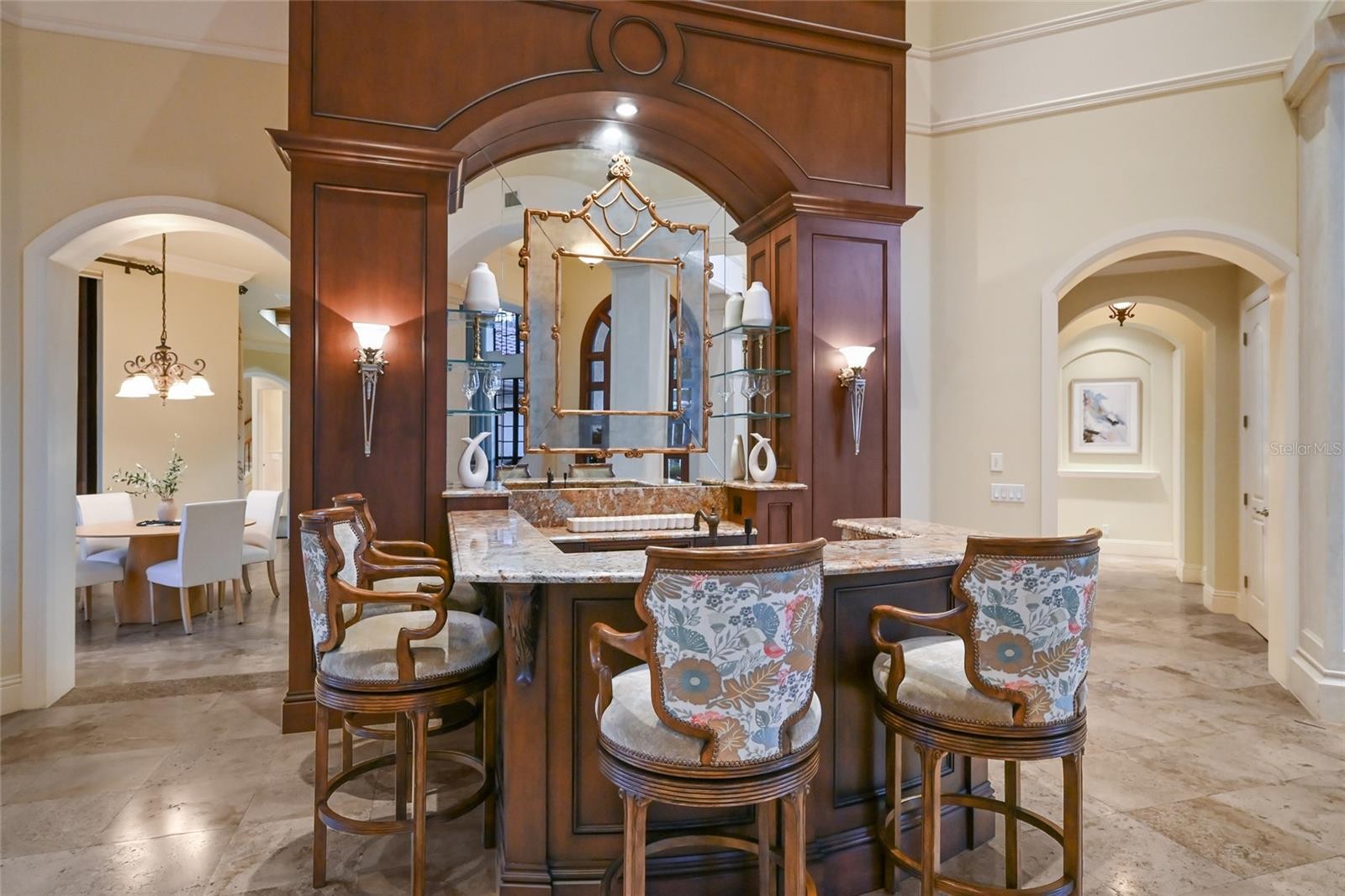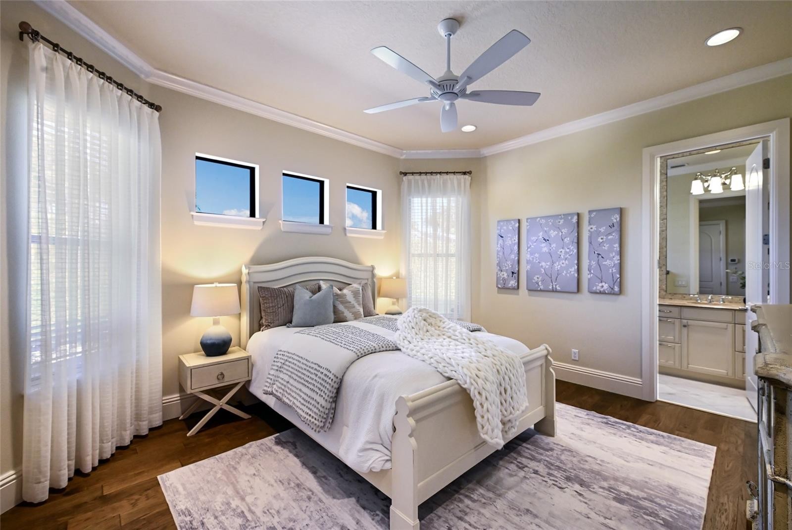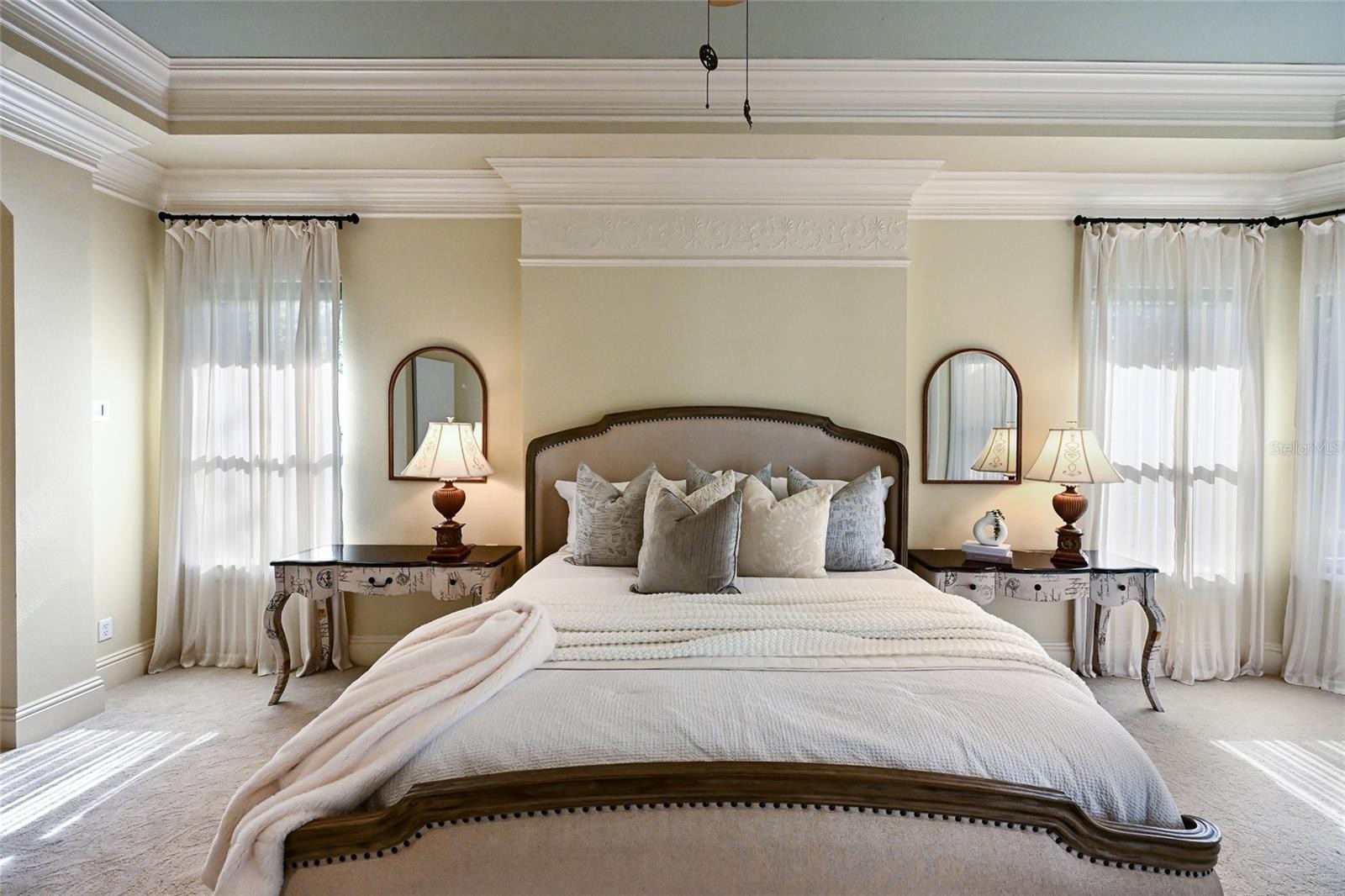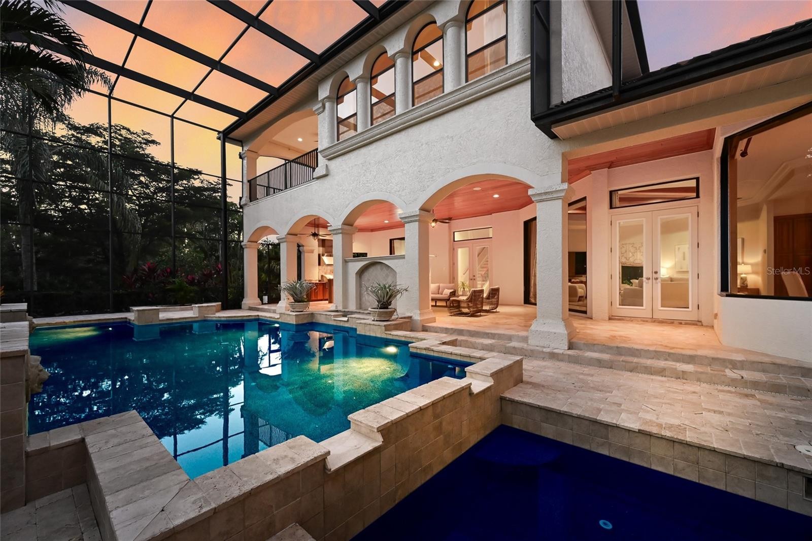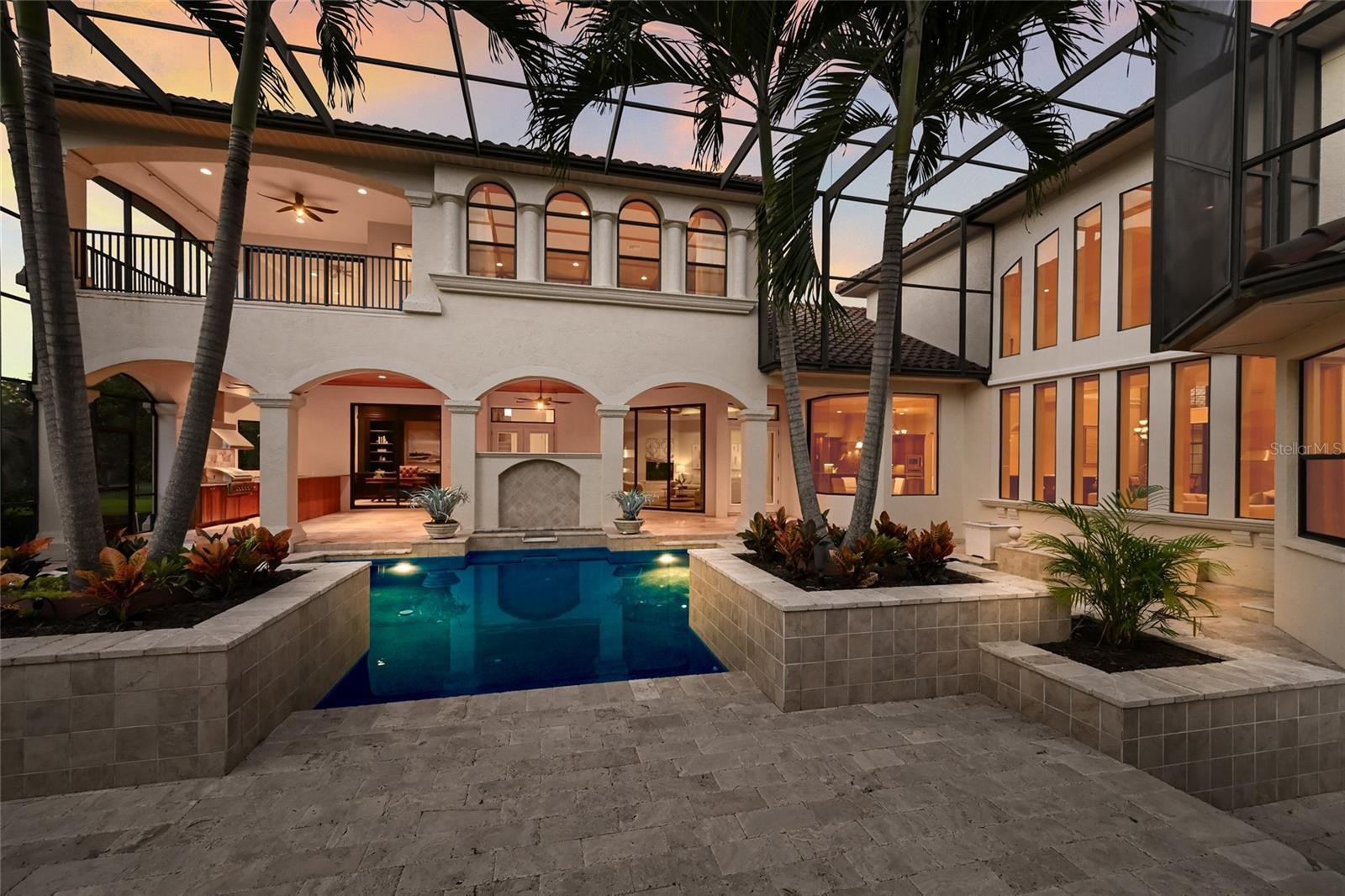 Superior custom offering built by Anchor and inspired by acclaimed designer Marc-Michaels, this impressive residence is privately positioned on .69 acre at the end of a cul-de-sac in Palmers Creek enclave in The Country Club of Lakewood Ranch. Stunning 6,376 square feet of architectural excellence showcasing generously-proportioned spaces, exceptional design, and, IMPACT windows and doors throughout. Beyond the gated courtyard and mahogany entry door are grand living areas with 23’+ coffered ceilings with double crown molding, oversized windows, floor-to-ceiling limestone and marble cast mantle and hearth gas fireplace, sitting/piano room, elegant formal dining, and a refined wet bar drenched in a wall of wood paneling. Meanwhile the incredibly sized lanai boasts multi-level heated pool and spa, open and undercover travertine decking, outdoor kitchen with 2026 DCS grill, gas fireplace, 2-story lanai cage, pecky cypress ceilings, and oversized fenced back yard. Seamlessly connected to the serene outdoors via impact French doors and sliders is an invitingly large great room open to the kitchen where form and function reigns cohesively with custom limestone and marble cast hood, sprawling granite counters, wood cabinetry by Woodmode, 3 Fisher Paykel ovens, warming drawer, new Miele dishwasher, Subzero refrigerator, secondary prep sink, large island with storage, an oversized hidden walk-in pantry, and large breakfast nook area adorned with the lush preserve views. Unwind in the elegant owner’s retreat on a private wing offering beautifully detailed moldings, 2 walk-in customized closets, direct lanai access, and a luxuriously appointed spa-like bath with Rojo Elegante marble counters, dual entry walk-in shower with multiple shower heads, bench seating, limestone & marble mosaic tile flooring, aquarium window overlooking private garden, double vanity and makeup station with abundant storage, oversized soaking tub, and separate water closet with bidet and pedestal sink. Family and overnight visitors will be right at home with 3 generously sized guest suites all with wood flooring, two on the main level with private full baths accentuated with Italian marble, while on the upper level is the fourth generously sized guest suite with walk-in closet anddirect veranda access. Additionally, upstairs is a large media club room with wet bar, built-in wood cabinetry, wood-paneled entry door, veranda and full bath. Other notable highlights of this all-encompassing 8,537 sf residence includes a private Office on the main level with built-ins, oversized Powder Room and Pool Bath both adorned with marble counters and flooring, Laundry Room with sink, cabinetry and 2022 washer/dryer, secondary desk and drop area off garage entry, 2022 water heater, water softener, solid interior doors, central vacuum, additional batting insulation to interior walls, multi-zoned heating and cooling system with 4 AC units ages 2022-2024, landscape lighting, side load 3 car garage with a storage, electric charger, and portable generator with dedicated electrical line, and so much more. This one-of-a-kind masterpiece is a testament to refined living for even the most discriminating buyer ideally located within Lakewood Ranch known for its vibrant lifestyle near dining, shopping, polo, golf, tennis, events and entertainment near Waterside, Centerpointe, UTC area, the beaches of Sarasota, and of course, in an A-rated school district next to ODA and a few miles from IMG.