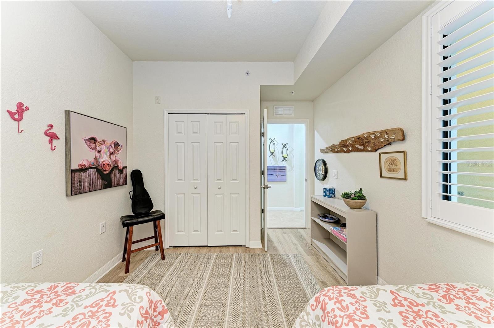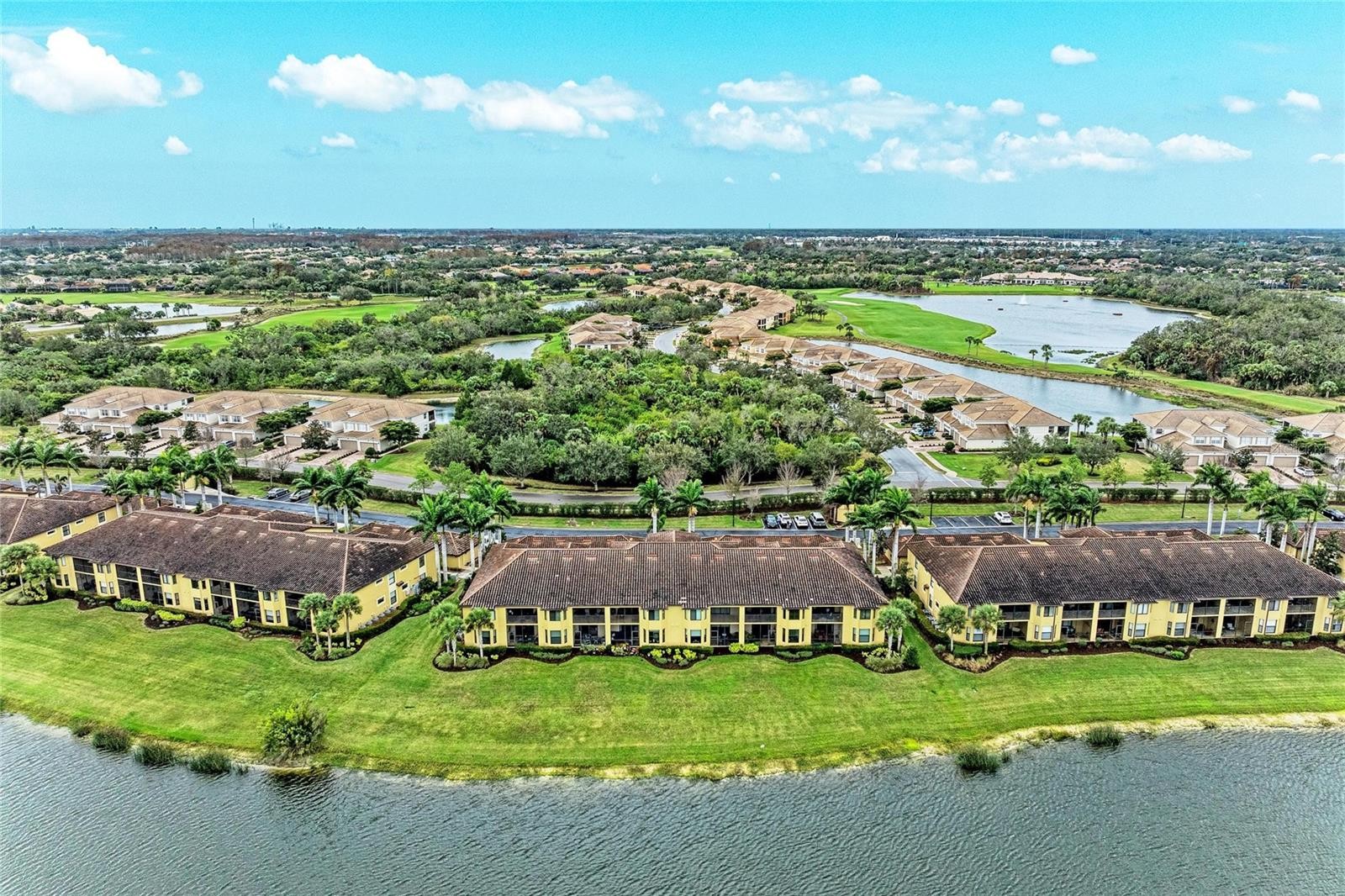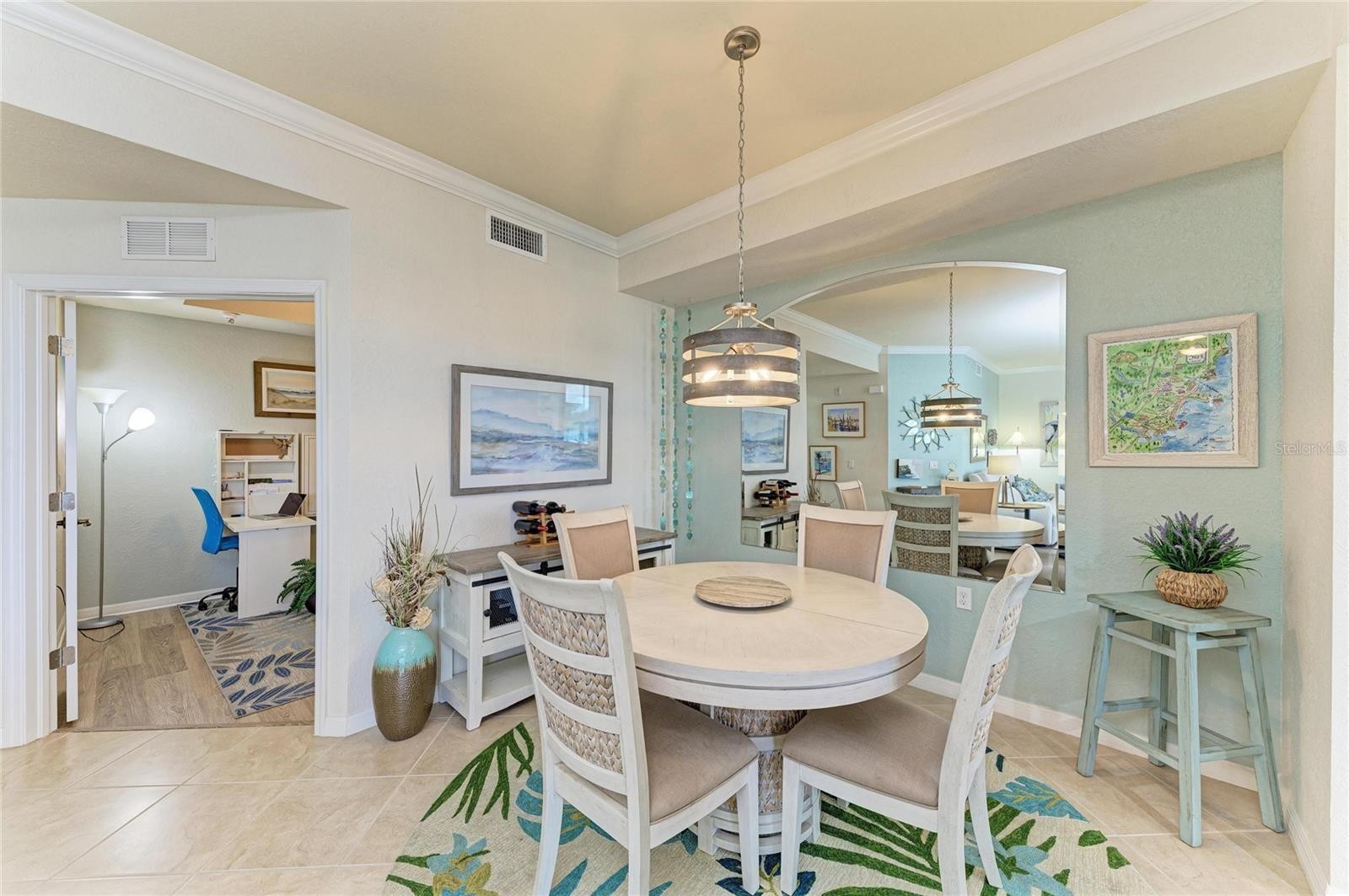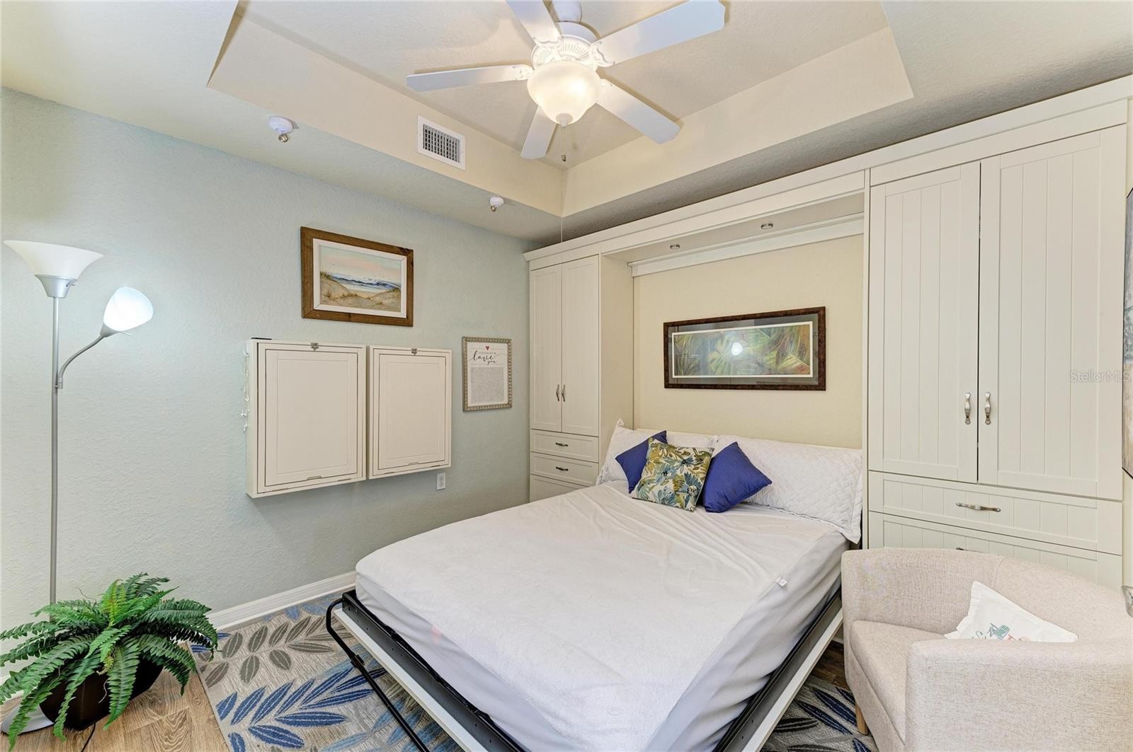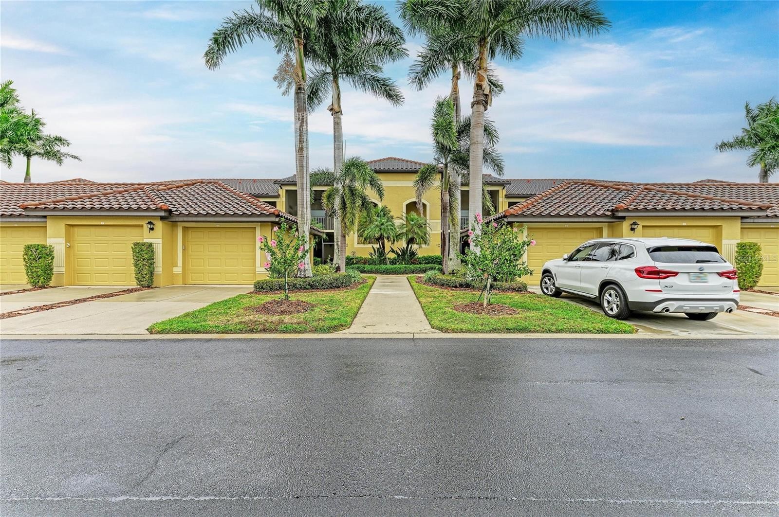 Under contract-accepting backup offers. Experience refined Florida living in this exquisitely UPDATED first-floor veranda condominium, perfectly positioned within the luxurious gated River Strand Golf & Country Club. Offering over 1,500 square feet of thoughtfully designed living space, the sought-after Dogwood floor plan showcases an elegant OPEN-CONCEPT layout ideal for both enhanced entertaining and everyday comfort. The KITCHEN HAS BEEN BEAUTIFULLY REIMAGINED with stunning quartzite countertops, custom-painted cabinetry, and a designer backsplash, seamlessly flowing into the expansive great room and dining area. Luxury vinyl flooring enhances the bedrooms and den, combining timeless style with modern durability. The primary suite is a true retreat, featuring a striking accent wall, A FULLY RENOVATED SPA-LIKE BATH with new cabinetry, countertops, and an upgraded shower, along with a spacious custom walk-in closet. The versatile den offers custom built-ins, including a discreet Murphy bed and hidden desk spaces—perfect for hosting guests without sacrificing elegance. Step onto the private, screened rear lanai and take in SWEEPING GOLF AND WATER VIEWS overlooking the 8th hole of the Estuary Course—iconic scenery that defines River Strand living. An additional front lanai provides another serene space to enjoy Florida’s year-round sunshine. A detached one-car garage offers ample room for a vehicle, golf cart, or beach essentials. Notable upgrades include a new A/C system (2025), custom lighting, plantation shutters, ceramic brick-style tile on both lanais, and a stunning custom glass-inlay front door. River Strand continues to elevate its luxury lifestyle with an impressive $9 million amenity renovation nearing completion, featuring a redesigned RESTAURANT, grille room and an expanded tiki bar with modernized facilities. This GOLF DEEDED residence includes access to 27 holes of championship golf, two resort-style pools and spas, six satellite pools, tennis and pickleball courts, two state-of-the-art fitness centers, and a vibrant calendar of social and wellness events. Ideally located just minutes from the new Marketplace with Target, Costco, and an exciting collection of upscale dining and shopping options. This exceptional residence offers the perfect blend of luxury, lifestyle, and location—So come and experience River Strand at its best, you may never want to leave!
