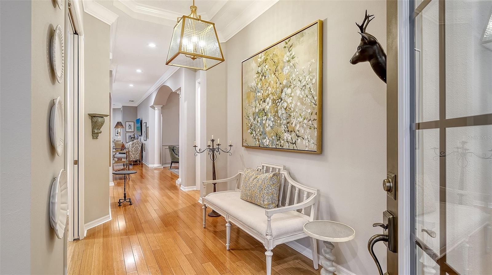 A masterful renovation has reimagined this Neal Custom single-family residence into a European-inspired sanctuary, ideally situated within the prestigious Presidio enclave of the park-like and highly coveted Lakewood Ranch Country Club. Within this exclusive community, residents enjoy fully maintained grounds, a private neighborhood pool, and optional Lakewood Ranch Country Club memberships—including golf, social, and sports—offering a refined and elevated lifestyle. Designed for effortless living, a resort-style, heated community pool is located just across the street—an easy 60-second stroll from home. Enjoy an exclusive retreat without the responsibility of pool ownership, maintenance, or insurance. This thoughtfully curated, lock-and-leave approach to modern luxury allows more time to simply enjoy life. Infused with over $100,000 in bespoke enhancements, this provincial-style residence is a testament to enduring elegance and thoughtful design. Expansive, unobstructed views stretch across the golf course, glistening lakes, and preserved natural surroundings, creating a dramatic backdrop for Florida’s unforgettable sunsets. Inside, a thoughtfully designed 2-bedroom, 2-bath layout—with a versatile den ideal as a third bedroom or guest suite—flows effortlessly across rich bamboo wood and custom tile flooring selected for both beauty and ease of maintenance. Every detail has been meticulously curated, from custom plantation shutters and designer lighting to crown molding, tray ceilings, and premium fixtures. The newly reimagined gourmet kitchen is a chef’s dream, featuring Café appliances, exquisitely refaced cabinetry in a soft, Wild Mushroom grey, radiant quartz countertops, statement backsplash, and marble-inspired floor tile. Both baths have been luxuriously transformed with artisanal tilework, elegant freestanding vanities, and refined lighting and plumbing selections. High ceilings, IMPACT-resistant windows, and a whole-home water purification system further enhance the home’s atmosphere of refined comfort. Notable updates include kitchen appliances and washer/dryer (2025), full renovation (2025), A/C (2021), and gas water heater (2022). Perfectly positioned minutes from Waterside, Main Street, UTC, premier dining, shopping, and entertainment—and within easy reach of the Gulf beaches, SRQ Airport, downtown Sarasota, IMG, The Out-of-Door Academy, and I-75—this residence offers exceptional sophistication paired with unparalleled convenience. CDD is included in the tax amount. Furniture is available for purchase. A rare offering within Lakewood Ranch Country Club, this exceptional residence must be experienced in person to fully appreciate its level of craftsmanship, setting, and lifestyle appeal—an opportunity well-suited for even the most discerning buyers.