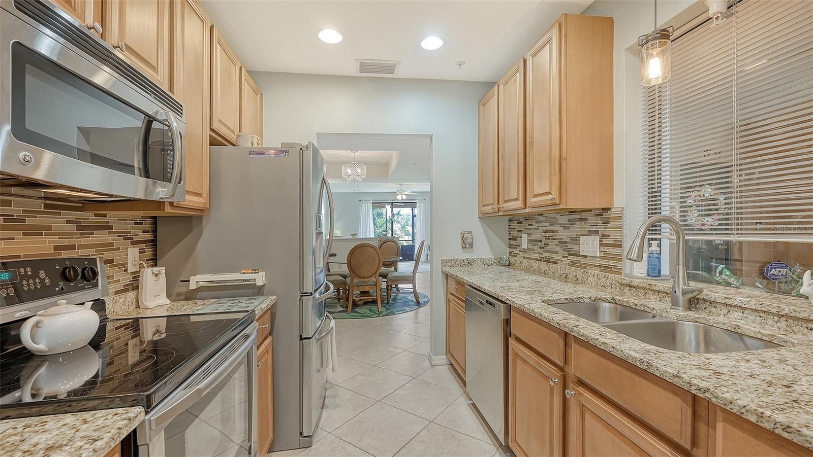 Experience maintenance-free living at its best at Palma Sola Trace! This stunning Carlisle townhouse unit boasts one of the largest floor plans in the community. Upon entering through your beautifully landscaped walkway, you'll find an open-concept dining and living room area adjacent to the kitchen. The garage provides easy access to this lovely unit. Step into the screened lanai off the living room, where you can relax and enjoy the tranquil stream just outside your door, surrounded by beautiful wildlife—perfect for savoring your morning coffee or evening drink. The galley kitchen features granite countertops, all-wood cabinetry, and stainless-steel appliances, complemented by a spacious pantry for all your culinary needs. Conveniently, the one-car garage is located near the kitchen, with an additional tandem parking spot available, along with extra guest parking across the street. Upstairs, you’ll discover the primary bedroom and bath, complete with a large walk-in closet and an updated bathroom featuring a single vanity with granite counters. At the end of the hallway, two additional bedrooms share a bathroom with a tub and shower combo, also equipped with granite countertops. These generously sized bedrooms can easily accommodate queen beds and furniture. Plus, the laundry is conveniently located upstairs—no more hauling loads up and down the stairs! Enjoy a prime location close to shopping, dining, and just minutes from the world-renowned beaches of Anna Maria Island. Palma Sola Trace also offers a community pool, fitness center and is a very pet-friendly community