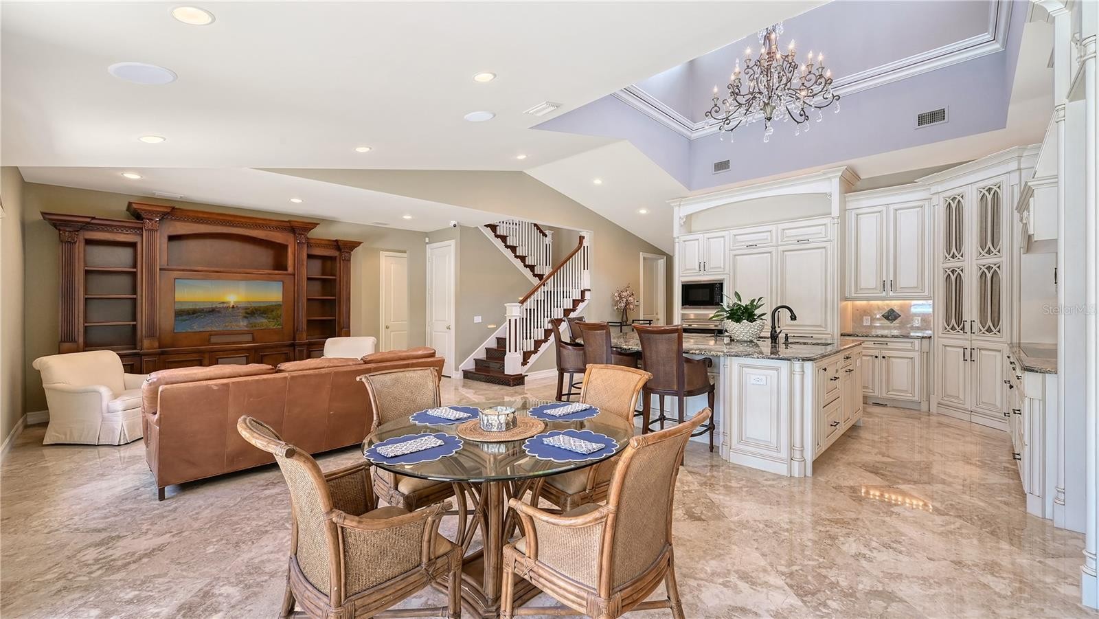 One or more photo(s) has been virtually staged. Experience refined coastal living in this stunning custom canal-front home, where timeless architectural elegance blends seamlessly with effortless luxury on the exclusive north end of Longboat Key. The attention to detail in this exquisitely renovated home is reflected in every thoughtfully crafted element and high-end finish, including furniture quality bespoke cabinetry, automated Lutron lighting and shade control system with remote access, standing seam metal roof, high-impact rated windows and doors throughout, low maintenance artificial turf, advanced whole house surveillance system...an endless list of luxuries. Step inside the marble entry foyer which flows into the heart of the home where the living room, dining area and the spectacular chef’s kitchen come together framing the view out to the resort-like private backyard oasis. Walls of windows, doors, and the exquisite copula with gorgeous wood clad ceiling and motorized shades bathe the space with natural light. The magazine worthy kitchen is outfitted with furniture quality cabinetry, professional grade Wolf and dual Sub-Zero appliance suite, walk-in pantry, and a generous center island featuring wrap around seating and abundant storage. This impeccably designed space effortlessly balances form and function, making it ideal for everything from everyday dining and casual gatherings to grand-scale entertaining. Just off the dining area, you will find the sunroom with a folding NanaWall allowing for privacy as needed; this room is truly flexible. The living room features a custom wall unit, in-ceiling speakers, and is pre-wired for surround sound enhancing the TV viewing experience. The hallway off the living room leads to the private second bedroom (can also serve as study/office), beautiful marble clad full bath, and an oversized laundry room lined with two walls of cabinets. The first-floor primary bedroom suite boasts vaulted ceilings and a spacious walk-in closet outfitted with a custom closet organizer. The luxurious spa bathroom exudes timeless style with high end cabinetry featuring twin vanities, dual function whirlpool/air tub, oversized marble shower and a private water closet. The grand walnut staircase with dramatic glass tile risers leads to the private self-contained second floor guest quarters featuring separate HVAC zone and water heater. The two upper bedrooms feature hand scraped hardwood floors, tray ceilings, ensuite marble baths and spacious closets with custom organizers. This floor also houses abundant storage with two large storage closets complete with built in shelving. Outside, the coastal lifestyle unfolds in the ultra-private rear yard with mature and lush tropical landscaping, resort style saltwater pool with sun shelf and spa, four hole putting green, oversized pergola with motorized sunshade, outdoor shower, and a 53 ft dock on a deep water canal fully equipped with power, water, fish cleaning station and a 16,000+lb lift. Enjoy power boating or sailing on the Bay or Gulf with no fixed bridges to stand in the way. Just a few minutes by foot to the azure waters and sand beaches. Ideal as a year-round residence or seasonal retreat, this incredible home captures the quintessential Longboat Key beach to bay lifestyle. A rare opportunity not to be missed! Schedule your private showing today.