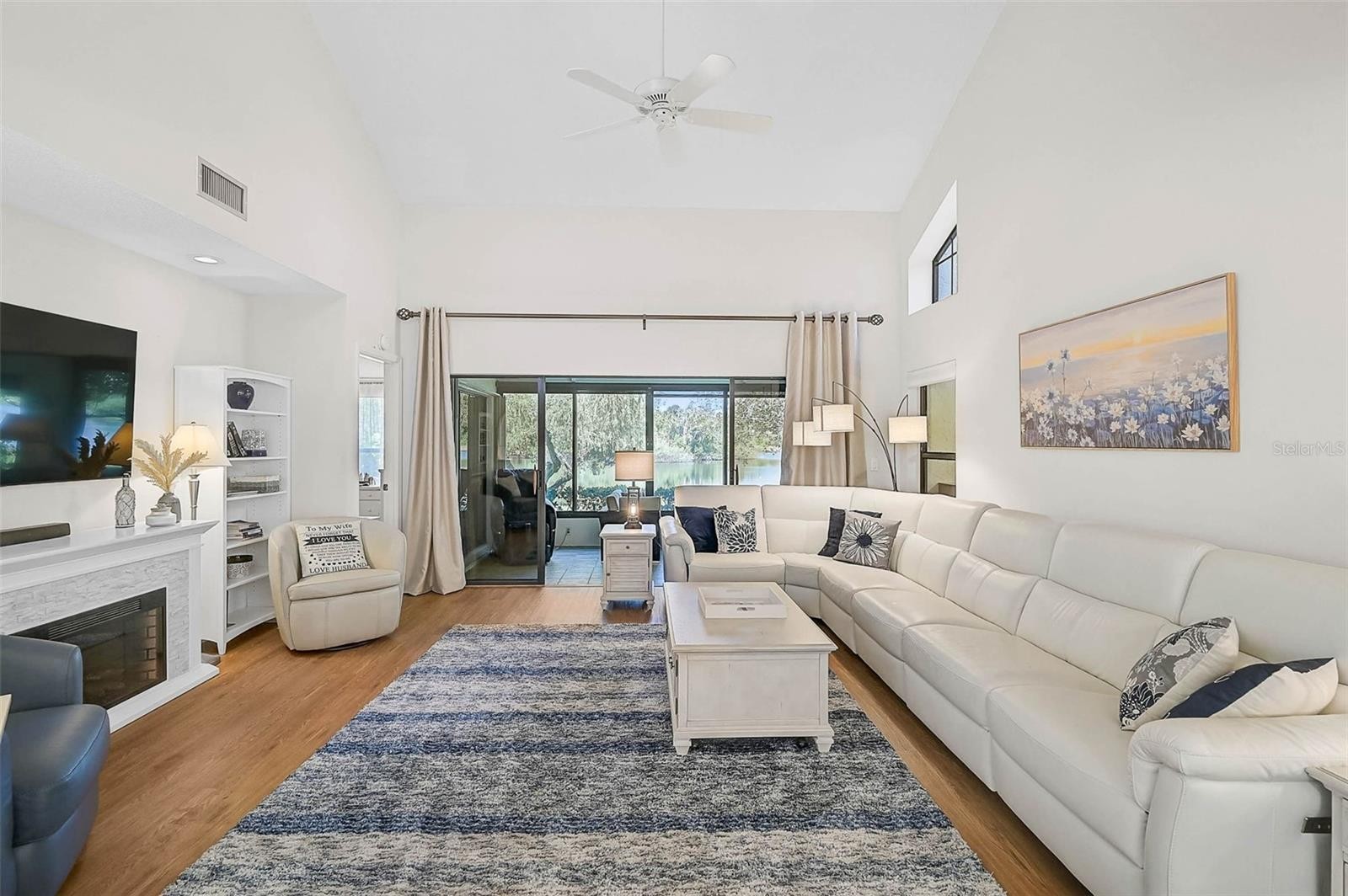 Price Reduced! Fantastic tranquil water views from nearly every room with. This updated and meticulously maintained condominium offers 3 bedrooms, 2.5 bathrooms, and 2,177 square feet of comfortable living space! The upgraded kitchen features rich wood cabinetry, quartz countertops, and newer stainless steel appliances, while a separate laundry room provides excellent storage and convenience with a separate sink! A spacious dining area with bay-style window and plantation shutters leads into the large family room, where soaring vaulted ceilings create an open, airy feel. The owners’ suite is located on the main level and includes sliding doors that open to the lanai, where tranquil views of the expansive lake set the scene for relaxation. Upstairs, two additional bedrooms and a full bath are connected by a loft-style hallway overlooking the family room below. Both air conditioning systems were replaced in 2024, complete with duct cleaning, and while the tile roof is 18 years old, full replacement is included in the HOA, along with exterior building maintenance and maintenance of grounds with canopy trees welcoming you home! Not your cookie cutter "row" of townhomes. This home has a whole house water purification system and kitchen reverse osmosis. Also, hurricane shutter package the owners had installed and easily to close up if needed! Set within the gated community of Bent Tree Village, residents enjoy a peaceful environment where single-family homes and villas/townhomes are surrounded by nature. With the large lake, you'll enjoy endless hours of peaceful water views as the variety of birds dive for their meals! The neighborhood also offers a lakeside gazebo in a park-like setting, where deer can often be spotted roaming freely. Hammock IV, the condominium enclave of Bent Tree Village, provides residents with access to two community pools, each with showers and restrooms, making it an ideal retreat to enjoy Florida living at its best. This is a 55+ Community.
