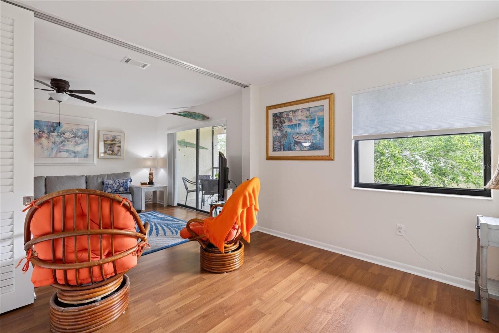 This beautifully maintained and thoughtfully upgraded turnkey-furnished condo offers the perfect blend of modern style and coastal comfort. The open kitchen features sleek quartz countertops, matching white appliances, and a custom backsplash that creates a bright, inviting space to cook and gather. The primary suite provides a relaxing private retreat with a walk-in closet, an updated en-suite bathroom with a modern walk-in shower and vanity, and direct access to the lanai overlooking a peaceful pond and the Phase IV pool. The second bedroom is a flexible space enhanced by a stylish pocket-door design, allowing it to open or close seamlessly to fit your needs. The home’s interior reflects the meticulous care it has received over the years. Beautiful laminate flooring extends through the main living areas and transitions smoothly into ceramic tile in the primary suite, lanais, kitchen, and bathrooms. Located in the highly desirable Bird Bay Village, residents enjoy a wealth of resort-style amenities including a heated Junior Olympic pool, an additional Phase pool, tennis and pickleball courts, a fitness center, shuffleboard, and an active clubhouse. The HOA covers water, sewer, trash, basic cable, pest control, exterior insurance, and grounds maintenance, offering true peace of mind. Just minutes from world-class beaches, great shopping and dining, and the scenic Legacy Trail, this home is perfectly positioned for those who enjoy coastal living and the Florida lifestyle. Whether you're seeking a seasonal escape, a full-time residence, or a strong investment property, this condo is an opportunity you won’t want to miss. Paradise Awaits!
