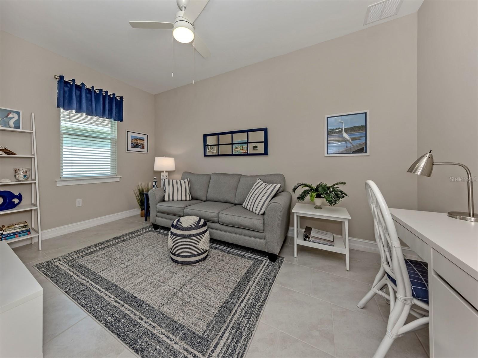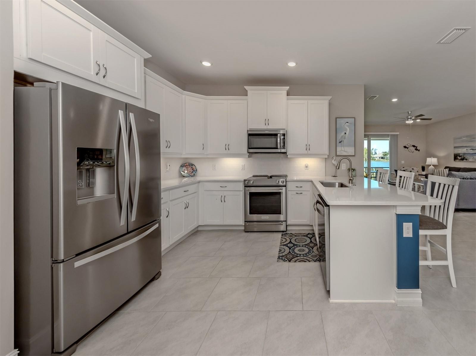 Welcome to effortless Florida living in this like-new, turnkey furnished villa in the gated community of Palencia! Beautifully decorated in true coastal style, this light and bright residence offers 2 bedrooms plus a versatile den that can easily serve as a third bedroom or home office. Designed with comfort and entertaining in mind and smart home features, the open floor plan features tile flooring throughout the main living areas and plush carpet in the bedrooms. The living and dining rooms showcase serene lake views and open seamlessly through sliding glass doors to the screened lanai—perfect for enjoying peaceful mornings or relaxing evenings. The kitchen is a standout, offering quartz countertops, a breakfast bar, upgraded stainless steel appliances, a spacious pantry, and elegant white wood cabinetry with convenient pull-outs. An adjoining laundry room adds to the home’s functionality. The split-bedroom layout provides privacy, with a spacious primary suite featuring a large walk-in closet, dual vanities, and a seamless glass walk-in shower. Hurricane impact windows and doors provide added peace of mind, while the epoxy-finished garage offers both durability and extra storage space. Enjoy tranquil lake views from the lanai and a peaceful preserve setting at the front of the home. Palencia is a golf cart-friendly community with an active lifestyle, offering a clubhouse with scheduled activities, fitness room, clubroom, resort-style pool, Bocce Ball and even a dog park. Fences are permitted, making it ideal for pet lovers. Conveniently located near shopping, dining, I-75 and the new SMH. This move-in-ready home truly has it all.