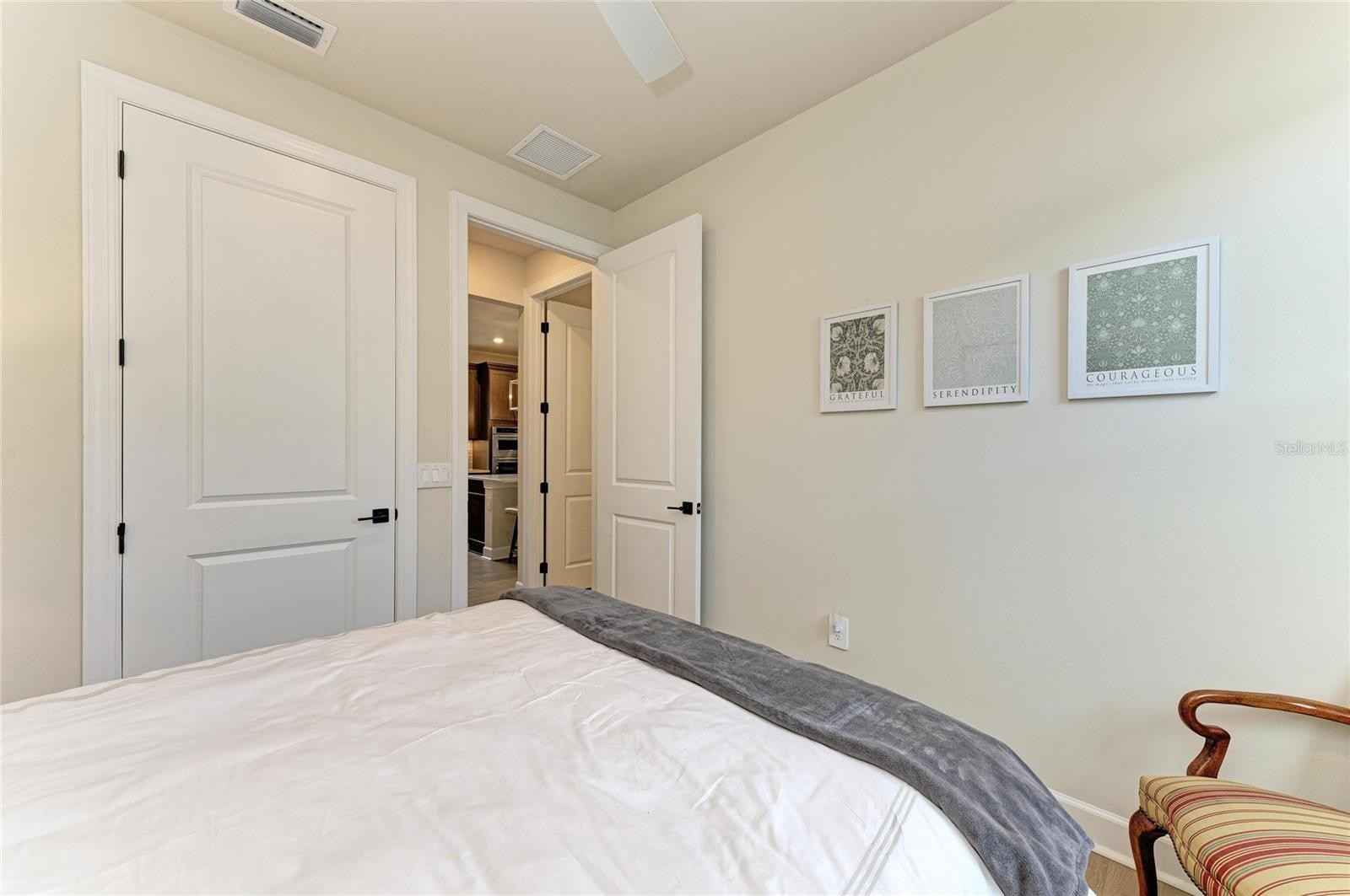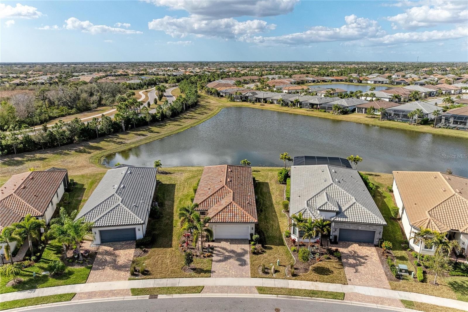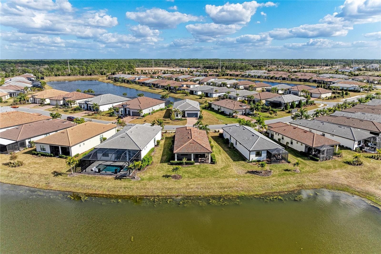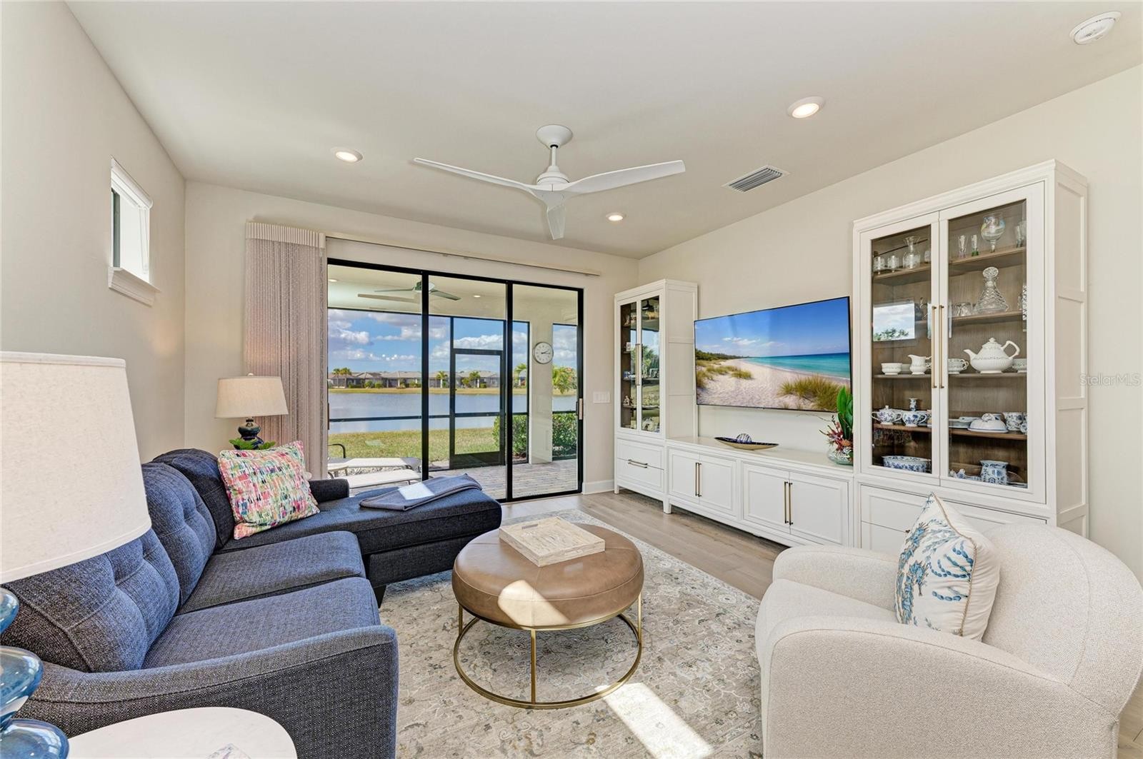 Stunning 2 bedroom, 2 bath with study single family home with a water view that stands apart from many other homes in Del Webb! Walk in the front door and see the full water view through the sliding door! The outdoor living adds expanded living with the extended, covered and screened lanai. This beautiful long pond view also has a sprawling view of deep conservation across the pond. You also have the option of sitting on your front covered porch! Inside you will see many upgrades such as the glass front entry, stunning engineered wood flooring throughout that have a solid feel and neutral earthy tone. The areas that require tile have upgraded and neutral tile. Plenty of recessed lighting and LED dimmer switches. The study has french doors and overlooks the front entry, a very nice place to work or relax. The 8 ft doors add to volume throughout. Enjoy preparing meals in this upgraded kitchen with wall oven, gas cooktop, extra deep pull out drawers, garbage cabinet, soft close doors, huge kitchen island, quartz counters, upgraded appliances and a custom pantry with solid shelving. The living room is light and bright and great for entertaining, especially with the pass through to the extended lanai. Step into this charming primary bedroom with en-suite bath with quartz counter, dual sinks and beautifully designed shower with tile to the ceiling and a well designed custom closet system in the large walk-in closet! There is a well equipped laundry room with custom cabinets and washer and dryer are included. The second bedroom has a custom closet as well and is steps away from the well appointed bath with tub/shower combination and tile to the ceiling and quartz counter. The two car garage has a bump out for extra storage. There is so much to love about this exceptionally maintained home. Minutes from the smaller community pool and a quick walk or drive to the main amenity center! Seller would prefer to sell a majority of the furniture. Come enjoy the good life in this 55 Plus resort style community with so many social clubs to join, a large amenity center, fitness classes, lifestyles director, 2 pools and spa, located within Lakewood Ranch in the best possible location for convenience to fine shopping and dining.