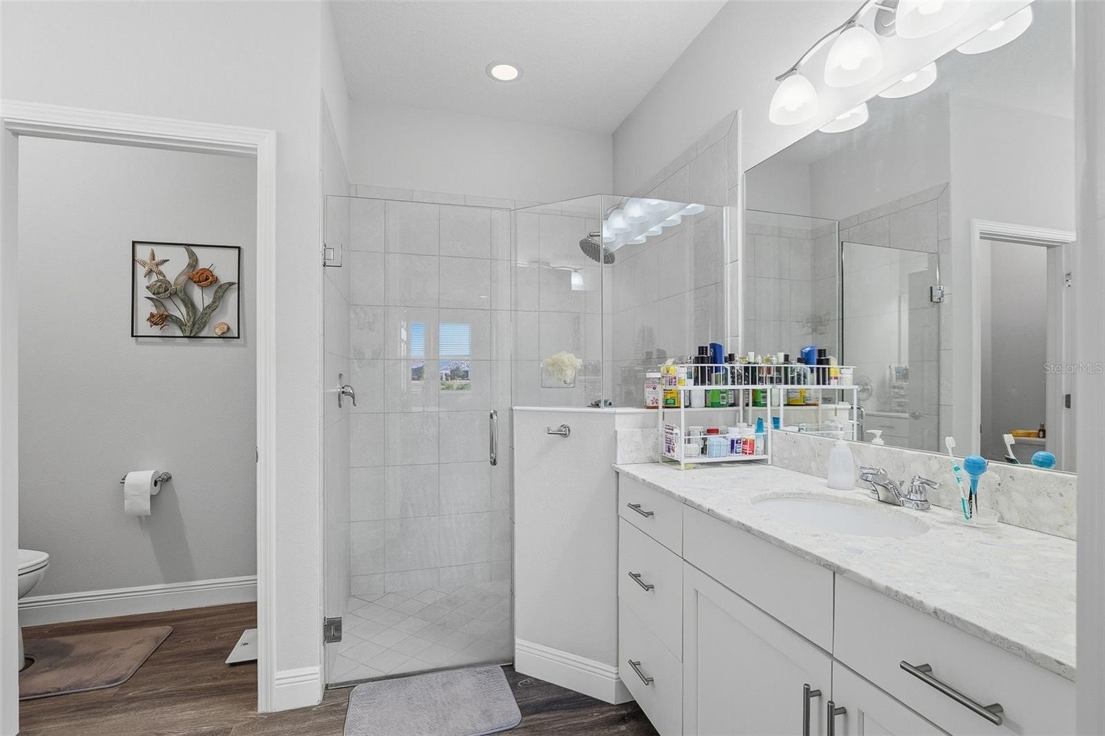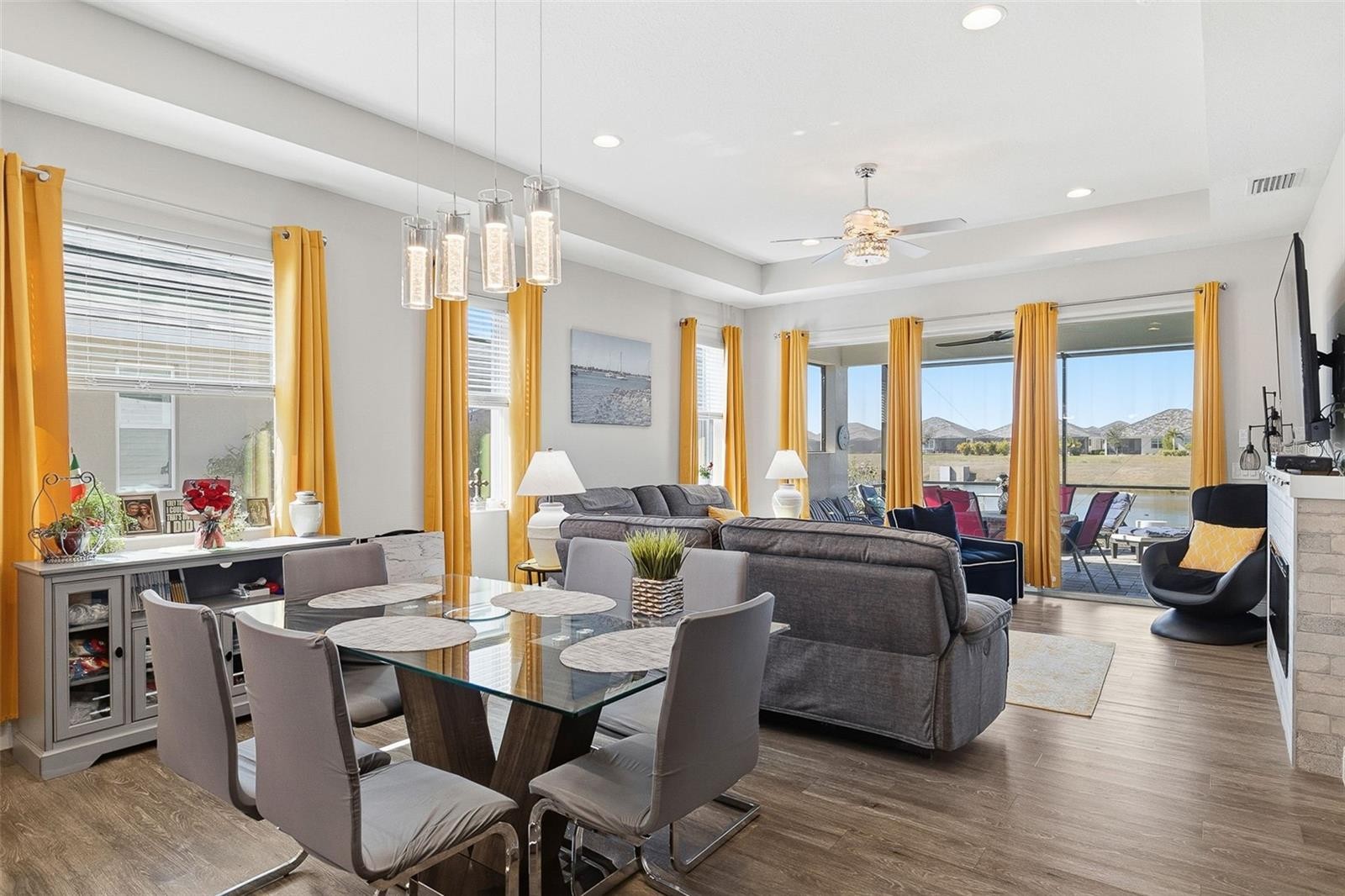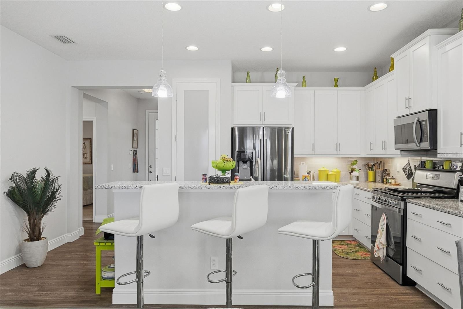 Welcome to this meticulously maintained 2019 Medallion home in the sought-after Gated Community of University Village. Offering 1,579 square feet of stylish, well-appointed living space, this charming 2 bed 2 bath residence features a spacious split floor plan with a private den/office. Enjoy water views and stunning sunsets from the spacious entended lanai. As you approach, you’ll be greeted by a paver driveway leading to a 2-car garage, with a large screened front porch area that invites you to relax outdoors. Step inside to discover an open-concept design that seamlessly blends comfort and elegance, highlighted by recessed lighting and luxury vinyl flooring throughout the main living areas. The heart of the home is the gourmet kitchen, complete with a large island offering seating for four, granite stone countertops, sleek stainless steel appliances and pantry. The luxurious gas stove and microwave were updated in 2024, ensuring efficiency and convenience. Along with the stainless French door refrigerator, a full size freezer has been added in the garage. The adjacent dining room is accentuated by beautiful contemporary lighting, perfect for both casual meals and entertaining. The expansive living room boasts high tray ceilings, an upscale ceiling fan/light, and a stunning stone faced fireplace with glass lighting and heat—ideal for cozying up or hosting guests. Large, wall-to-wall sliders open to an extended, screened-in paver lanai, where you can enjoy tranquil water views of the pond. Whether you're entertaining or simply soaking up the sun, this outdoor space with a 2025 60’ mounted flat-screen TV is sure to impress. The private primary suite offers a peaceful retreat with picturesque pond views. It features a spacious bedroom, a walk-in closet with custom built-ins for optimal storage, and an en-suite bath with separate vanities, stone countertops, a walk-in shower, and a private WC. The home also includes a whole-home water filtration system for added comfort. Additional features include an inside utility room with front-load washer/dryer and a full-size utility sink. The dryer vent was cleaned 12/25. and the most recent upgrade to the home are the accordion storm shutters. As a resident of Medallion, you'll enjoy a host of fantastic amenities, including a sparkling community pool, hot tub, a beautiful clubhouse with an entertaining area, a gated dog park for your furry friends and paver sidewalks throughout the community. This home offers a rare combination of style, comfort, and practicality. Don’t miss your chance to make it yours!