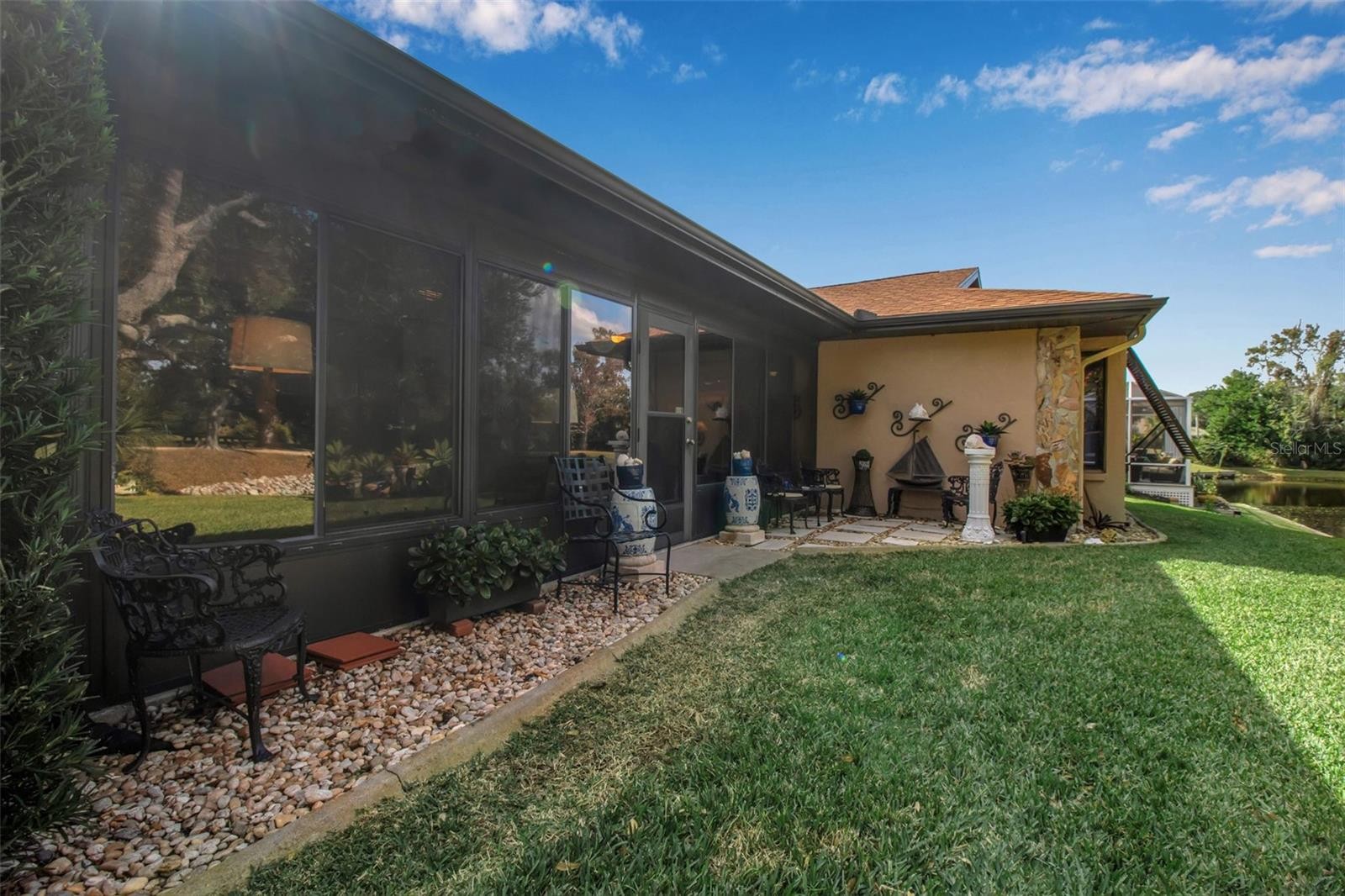 Meticulously maintained 3-bedroom, 2-bath home situated on a pond-front corner lot in the desirable Indian Springs community of NW Bradenton. Originally the model home, this property makes a strong first impression as you enter the neighborhood, featuring a covered front porch and inviting foyer. The split floor plan offers privacy and functionality, with an open-concept living area that includes vaulted ceilings and a fireplace. The kitchen features granite countertops, a serving window to the lanai, and flows seamlessly into the main living space, making it ideal for everyday living and entertaining. The spacious lanai has been enclosed and includes air conditioning, providing additional year-round living space. The primary bedroom offers direct access to the lanai through sliding glass doors, double closets with one walk-in, and an ensuite bath featuring a vanity area and walk-in shower. Secondary bedrooms include built-in storage, and the guest bathroom offers a tub/shower combination with a granite countertop. Additional features include an indoor laundry room with utility sink, Bahama shutters on select windows, and a pond-side retaining wall that was professionally treated with seawall and bulkhead soil stabilization injections in September 2025. Located in NW Bradenton, this home offers convenient access to local beaches, parks, and recreation, including Anna Maria Island, Robinson Preserve, GT Bray Park, and IMG Academy, along with nearby shopping, dining, and everyday conveniences.