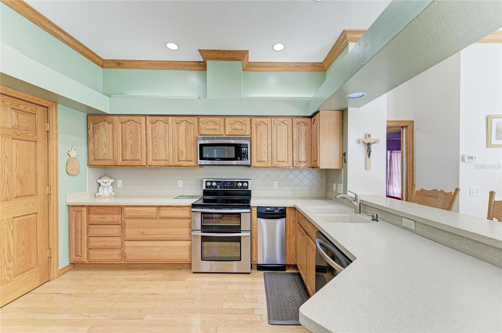 Creekwood Home! One of the larger homes in Creekwood. 4 BR, 3 BA with heated pool and spa. Only $182.00 a quarter HOA Fees! Roof Feb. 2021, HVAC System Oct. 2018, Exterior Painted 2021, 10" insulation added 2019, water heater 2018, pool cage painted and rescreened 2025, pool vacuum 2023 and all duct work relined in 2021. Central Vacuum System with new hose and main vacuum 2025. Main bedroom, Jack and Jill bedrooms painted 2021. The Jack and Jill BR's were used as Jill and Jill BR's with a solid oak pocket door to close for more privacy and Jack's Bedroom and bathroom which opens to pool are at the back of the house with solid oak 6 panel pocket door for privacy as well. Dining room, living room and family room all painted in 2021. Main bathroom and the jack and jill bathrooms updated in 2021 which includes quartz counters, new toilets and bath tubs. This home features Travertine floors (Sealed March 2021) as you enter through the front door in living-dining areas. Backflow system passed inspection March 2026. Double door entry makes it a breeze to move into this home. The home has a central vacuum system, stainless steel appliances, 6 panel solid Oak doors, Crown Molding and 3 sets of sliding glass doors that all open to the pool area. Kitchen has Oak Cabinets with soft close features, double oven/covection 2025, trash compactor, French Door Refrigerator and bottom freezer 2025, dishwasher 2021, and a freezer in garage. Laundry room has counter space to fold clothes and cabinets above counter and above washer and dryer. Wood Shelves in garage for storage and additional cabinets in garage for more storage and attic space above garage for even more storage! Excellent location on a cul-de-sac street in a very sought after Community. Community pool, basketball court, tennis court, picnic tables, and pickle ball! Camera on site.