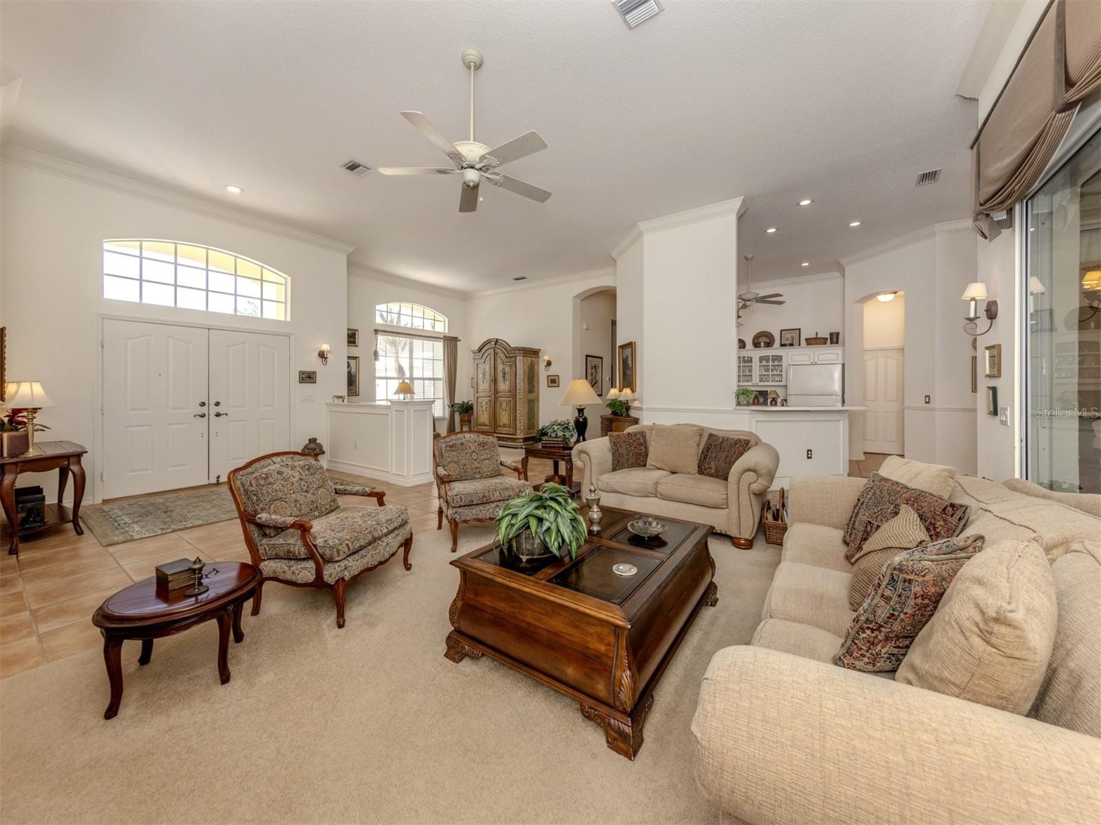 Welcome to this beautifully crafted custom home by J&J Homes, ideally in the gated community of Sawgrass. Offered turnkey furnished, this residence provides comfort, convenience, and quality throughout. The home offers three bedrooms, two baths and a two-car garage with generous space and thoughtful design. Upon entry, you’re greeted by 12-foot ceilings with crown molding and spacious, light-filled rooms that create an immediate sense of openness. The living room features a wall of sliders leading to a large enclosed Florida room, ideal for year-round enjoyment. Adjacent to the living room, the dining area is ideal for entertaining and currently serves as a quiet reading or gathering space, highlighting the home’s versatile floor plan. The chef’s kitchen is a standout, offering abundant counter space for preparation, a breakfast bar, glass-front cabinets for displaying china and a huge walk-in pantry with floor-to-ceiling storage. The expansive primary suite includes a private sitting area, two walk-in closets and a spacious en-suite bath with double vanities, a garden tub and an easily accessible walk-in shower. Two guest bedrooms are located on the opposite side of the home for privacy and share a Jack-and-Jill bath. The oversized Florida room is ideal for entertaining and opens to a screened lanai with power in place for a hot tub. Curb appeal is enhanced by a paver driveway leading to an oversized garage featuring epoxy floors and extensive built-in cabinetry. This home also features hurricane shutters for peace of mind during storm season and a new roof in 2024. Residents of Sawgrass enjoy an active lifestyle with access to a clubhouse, fitness room, meeting spaces, dual kitchens and popular pickleball courts. Just a short drive to historic downtown Venice, you’ll enjoy alfresco dining, boutique shopping, live theater and sugar sand beaches of the Gulf Coast. This home offers it all, space, style, community, convenience and peace of mind.