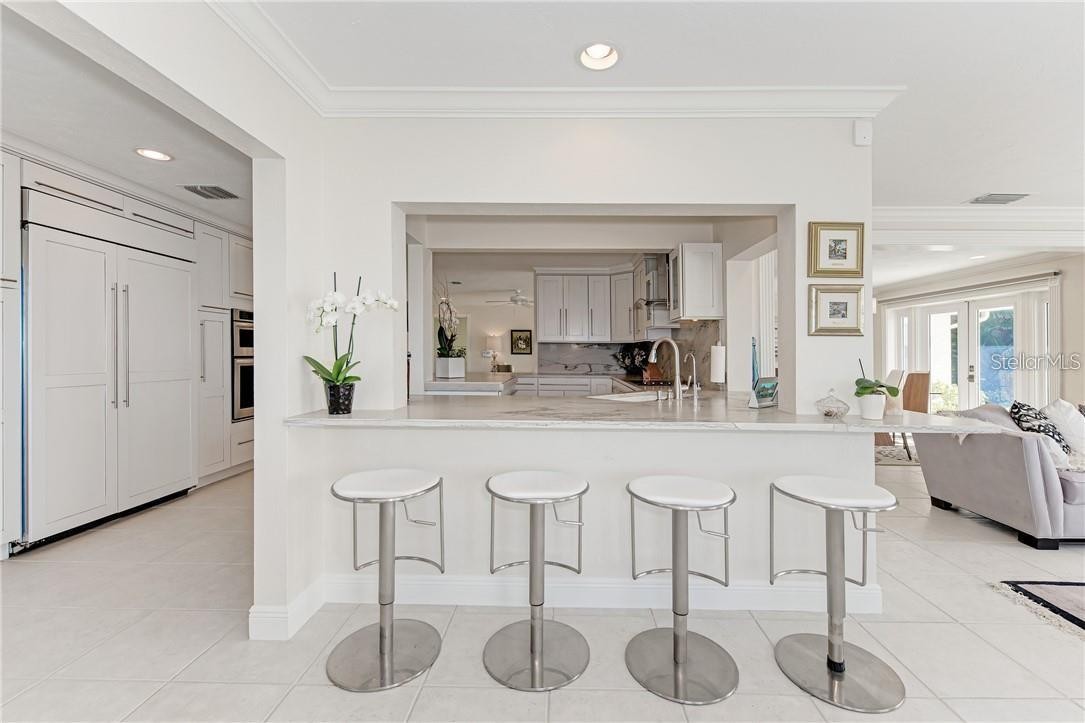 A truly exceptional opportunity, this premier point-lot estate in Dolphin Cove represents one of Sarasota’s most coveted waterfront opportunities. Perfectly positioned on Sarasota Bay, the property boasts approximately 210 feet of deep-water frontage, ideal for large yachts and sailboats, with panoramic, unobstructed bay views that feel endless. Whether your vision is to expand the existing residence, downsize in style, build a custom waterfront masterpiece, this rare property provides remarkable flexibility. The home now features a brand-new dock, along with newly enhanced elevation for peace of mind. Tucked away on a quiet cul-de-sac, the residence is designed to maximize its stunning setting, with walls of windows framing the water from nearly every angle. The open-concept Florida-style layout includes a split floor plan with two primary suites, one offering direct pool access. The chef’s kitchen is thoughtfully designed with premium finishes and functionality in mind: quartzite countertops (harder than granite with a soft, non-glare finish), custom solid-wood cabinetry, dual dishwashers, oversized sink, under-counter water filtration, double ovens with convection and roasting capabilities, a paneled refrigerator with ice maker, and two built-in wine refrigerators. The living and dining areas are equipped with motorized sun-filtering blinds, allowing effortless control of light and views. The main primary suite features a spa-style bath with dual vanities, a Jacuzzi soaking tub, walk-in shower, walk-in closet, and an electric fireplace (with a wood-burning option behind it), all opening seamlessly to the backyard and waterfront beyond. Outdoor living is elevated with a covered rear patio addition, complete with a professional-grade outdoor grill and rotisserie, finished in Italian shell-stone pavers compressed to 4% porosity—beautiful, durable, and resistant to staining. The PebbleTec swimming pool is surrounded by matching shell-stone decking accented with natural oblong shells that shimmer in the sunlight. Boating enthusiasts will appreciate the brand new private dock with a 13,000-pound boat lift, strategically placed along the right side of the seawall to preserve uninterrupted water views—no dock blocking your horizon here. Additional features include a concrete tile roof with a modified bitumen secondary membrane, hurricane-impact windows and doors, high-efficiency HVAC with updated ductwork, new water supply lines, an 80-gallon water heater, private well with zoned irrigation, and a two-and-a-half-car garage with sink and hurricane-rated doors. The seller reports that county guidelines (buyer to verify) allow for a structure of approximately 5,537 square feet on the main level, with the potential for a second story—an exceptionally rare opportunity for waterfront construction of this scale. This is a one-of-a-kind Sarasota Bay property offering privacy, scale, and timeless waterfront appeal. Please schedule s showing to fully appreciate the details and setting of this extraordinary home.