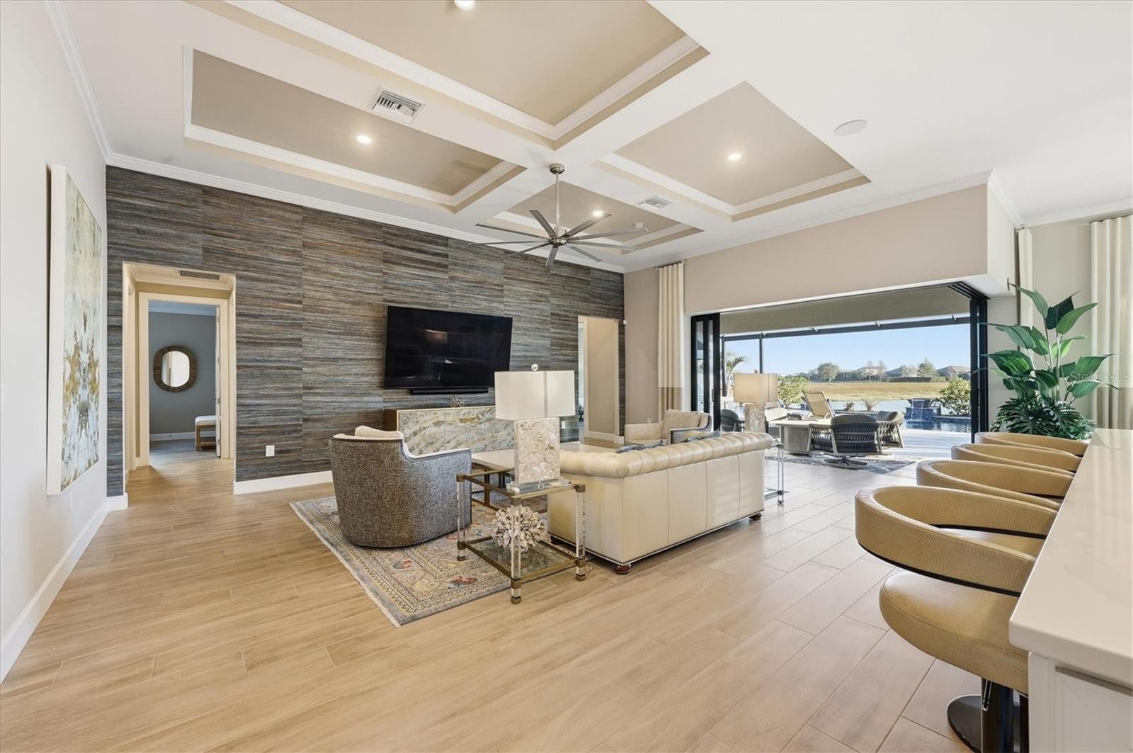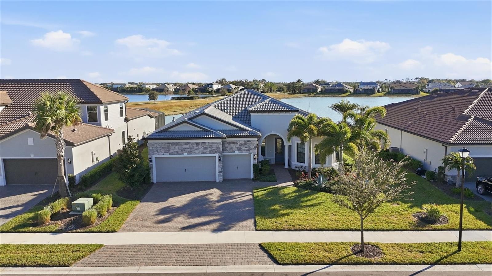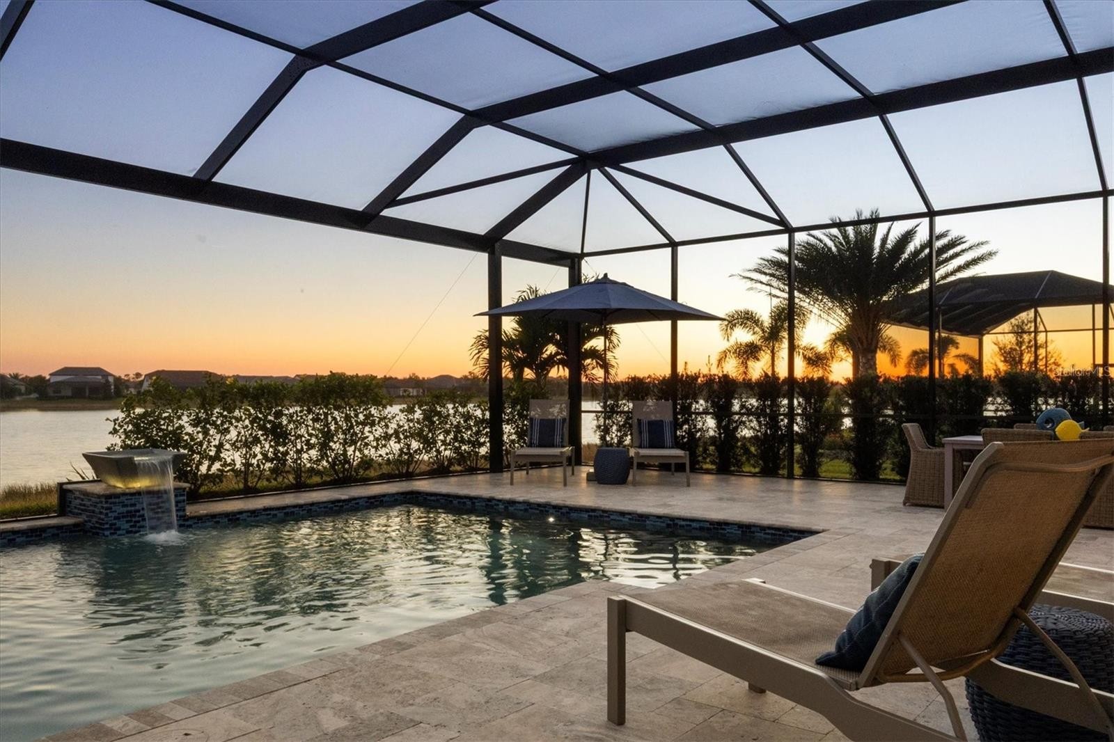 his beautifully appointed three-bedroom, three-bath plus den custom Pulte Pinnacle model showcases refined design, thoughtful upgrades, designer touches, and serene waterfront living in the highly desirable Shoreview community of Waterside. From the moment you arrive, the striking stone front façade, manicured landscaping, and elegant glass entry door create a sophisticated first impression. Inside, tile flooring flows seamlessly throughout the home, complemented by modern designer lighting, stylish ceiling fans, tray ceilings, crown molding, and curated architectural accents that elevate every space. The open-concept floor plan is designed for both effortless entertaining and comfortable everyday living. The spacious great room features tray ceilings and pocketing sliding glass doors that fully open to the oversized lanai, blending indoor and outdoor living while framing stunning lake views. The adjacent dining area is perfectly positioned to enjoy natural light and water vistas, while the chef’s kitchen serves as the heart of the home with KitchenAid and Whirlpool appliances, sleek cabinetry, and a large eat-at bar ideal for gatherings and casual dining. Step outside to your private Florida retreat where an expansive screened lanai overlooks tranquil water views. The heated saltwater pool and spa are set against a panoramic screen enclosure, creating a breathtaking backdrop of shimmering lake views. An outdoor kitchen enhances the space, making it ideal for alfresco dining and entertaining year-round. The primary suite is a peaceful sanctuary featuring a tray ceiling, large picture window overlooking the pool and lake, and a beautifully appointed spa-inspired bath with a spacious walk-in shower and refined finishes. One guest bedroom with stunning window filled bump out, offers its own en-suite bath, while the second guest bedroom is serviced by a dedicated full bath, providing privacy and comfort for family or visitors. The private den, accessed through double doors, features a tray ceiling and built-in designer cabinetry—perfect for a home office, library, or creative space. Additional highlights include hurricane-rated windows for peace of mind, a spacious three-car garage with ample storage, and meticulous landscaping that enhances the home’s curb appeal. Located in Shoreview at Waterside, residents enjoy a resort-inspired lifestyle with access to a stunning clubhouse, state-of-the-art fitness center, resort-style pool and spa, tennis and pickleball courts, dog parks, playground, and scenic walking trails along Kingfisher Lake. Waterside offers charming waterfront dining, boutique shopping, vibrant community events, and picturesque views throughout the area, creating a dynamic yet peaceful setting. This exceptional residence offers the perfect blend of luxury, comfort, and community in one of Lakewood Ranch’s most sought-after neighborhoods.