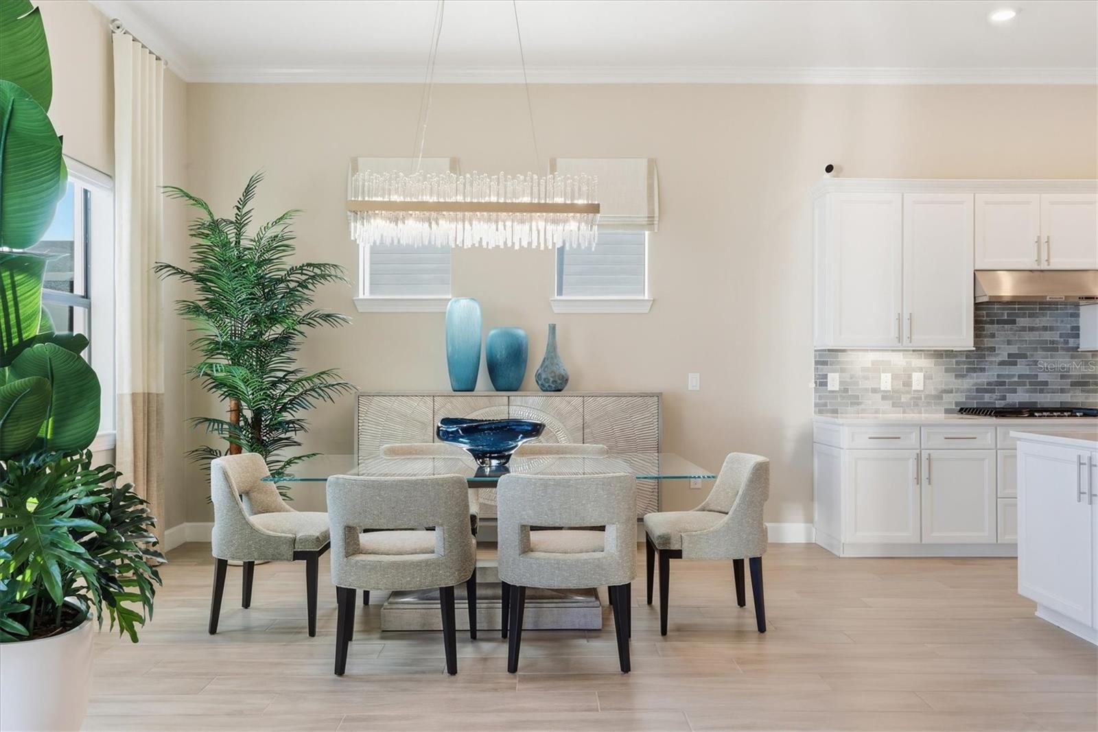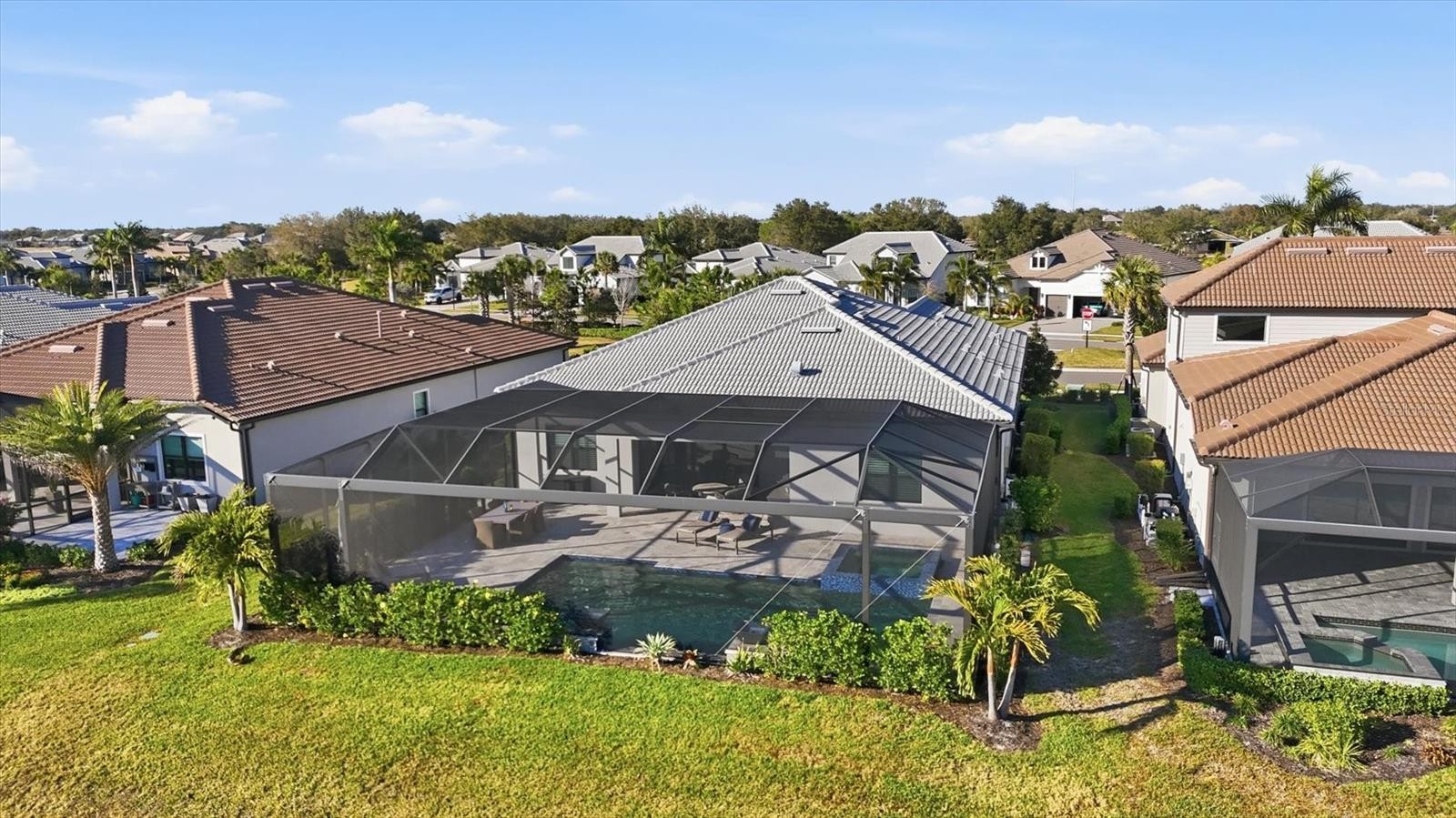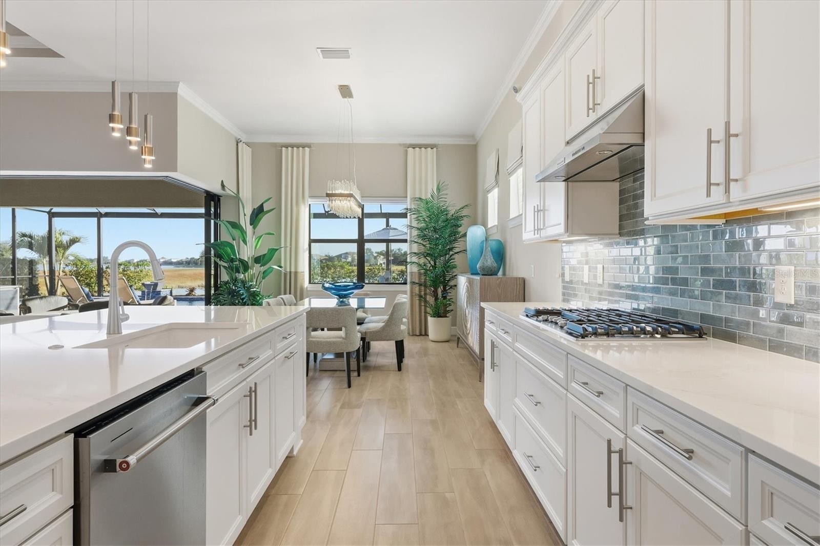 his beautifully appointed three-bedroom, three-bath plus den custom Pulte Pinnacle model showcases refined design, thoughtful upgrades, designer touches, and serene waterfront living in the highly desirable Shoreview community of Waterside. From the moment you arrive, the striking stone front façade, manicured landscaping, and elegant glass entry door create a sophisticated first impression. Inside, tile flooring flows seamlessly throughout the home, complemented by modern designer lighting, stylish ceiling fans, tray ceilings, crown molding, and curated architectural accents that elevate every space. The open-concept floor plan is designed for both effortless entertaining and comfortable everyday living. The spacious great room features tray ceilings and pocketing sliding glass doors that fully open to the oversized lanai, blending indoor and outdoor living while framing stunning lake views. The adjacent dining area is perfectly positioned to enjoy natural light and water vistas, while the chef’s kitchen serves as the heart of the home with KitchenAid and Whirlpool appliances, sleek cabinetry, and a large eat-at bar ideal for gatherings and casual dining. Step outside to your private Florida retreat where an expansive screened lanai overlooks tranquil water views. The heated saltwater pool and spa are set against a panoramic screen enclosure, creating a breathtaking backdrop of shimmering lake views. An outdoor kitchen enhances the space, making it ideal for alfresco dining and entertaining year-round. The primary suite is a peaceful sanctuary featuring a tray ceiling, large picture window overlooking the pool and lake, and a beautifully appointed spa-inspired bath with a spacious walk-in shower and refined finishes. One guest bedroom with stunning window filled bump out, offers its own en-suite bath, while the second guest bedroom is serviced by a dedicated full bath, providing privacy and comfort for family or visitors. The private den, accessed through double doors, features a tray ceiling and built-in designer cabinetry—perfect for a home office, library, or creative space. Additional highlights include hurricane-rated windows for peace of mind, a spacious three-car garage with ample storage, and meticulous landscaping that enhances the home’s curb appeal. Located in Shoreview at Waterside, residents enjoy a resort-inspired lifestyle with access to a stunning clubhouse, state-of-the-art fitness center, resort-style pool and spa, tennis and pickleball courts, dog parks, playground, and scenic walking trails along Kingfisher Lake. Waterside offers charming waterfront dining, boutique shopping, vibrant community events, and picturesque views throughout the area, creating a dynamic yet peaceful setting. This exceptional residence offers the perfect blend of luxury, comfort, and community in one of Lakewood Ranch’s most sought-after neighborhoods.