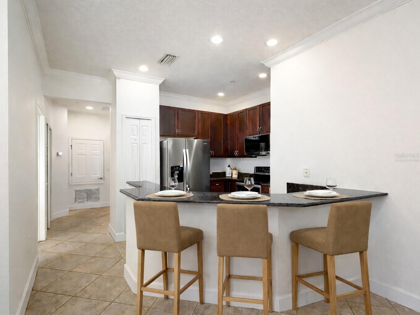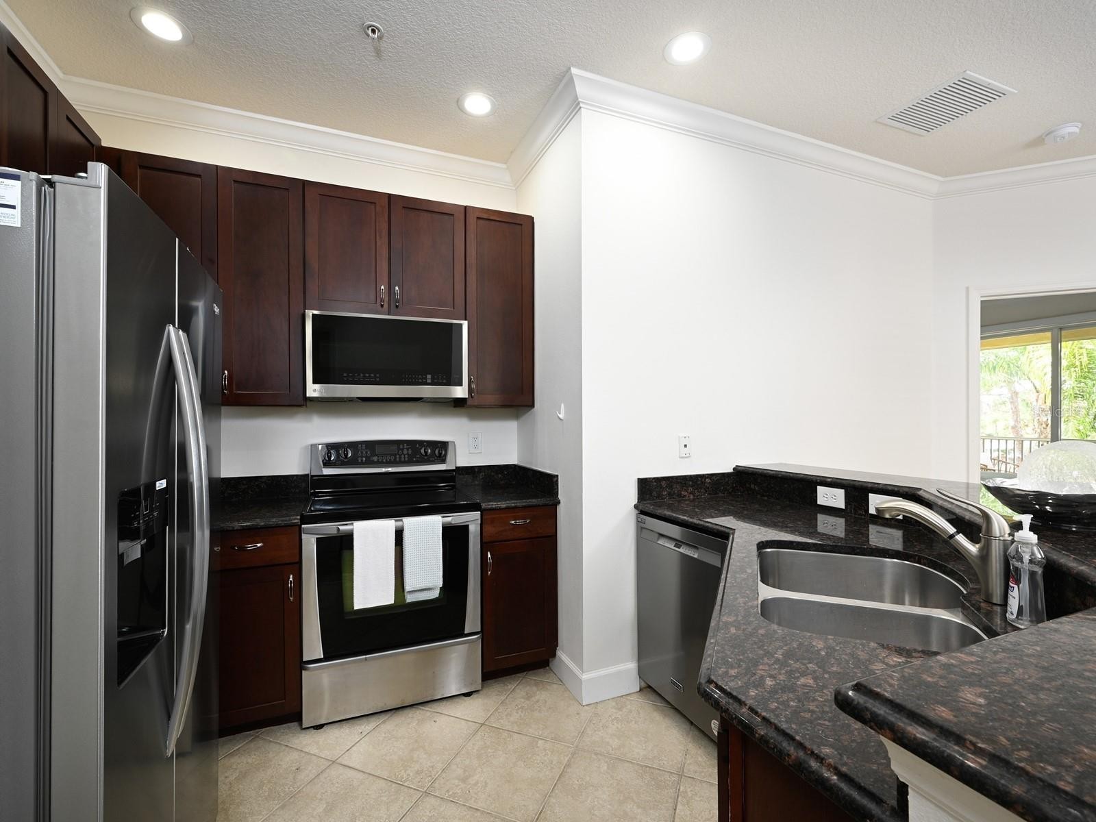 One or more photo(s) has been virtually staged. Enjoy comfortable, low-maintenance living at 7919 Limestone Lane #13-204, an end-unit, stylish walk-up residence in Sarasota featuring three bedrooms, two bathrooms, and an attached one-car garage. Guests are greeted by a paver walkway, an inviting side entry, and lush landscaping, while owners enjoy direct access from the garage. Inside, a tiled foyer leads to an open-concept floor plan, where the bright, spacious great room with crown molding, ceiling fan, designated dining area, and diagonal tile flooring flows seamlessly into the kitchen. Here, cherry wood cabinetry, granite countertops with a breakfast bar, and all-new stainless-steel appliances—including a microwave, refrigerator, range, and dishwasher—replaced at the end of 2024—are complemented by recessed lighting, pantry, and above-cabinet display space. Each bedroom features built-in closets, ceiling fans, laminate flooring, and access to a full bath with tub and shower. The laundry closet has a washer and dryer, less than two months old, and never used. The primary suite offers direct balcony access, a walk-in closet, and an en-suite bath with tiled shower, glass doors, and solid-surface counters. The covered and screened balcony overlooks a private park. All fans, lights, sockets, and switches were recently updated. The AC and water heater are brand new, and the garage door motor was replaced a year and a half ago. Blending functional design with tasteful finishes and extensive updates, this home is ideally situated for Sarasota living in Stonehaven. This beautifully maintained, gated, pet-friendly community delivers an impressive array of amenities and lifestyle features at an affordable price. Residents appreciate concrete-block construction, hurricane-impact windows and doors, and tranquil surroundings. The maintenance-free setting boasts lush landscaping, a year-round heated pool, playground, scenic lake for appreciating wildlife and tranquil views, and low monthly fees that cover exterior upkeep and irrigation. Ideally positioned just a mile from I-75 and a short drive from the world-renowned beaches of Siesta Key, Stonehaven is in a desirable A-rated school district. Convenient access to public transportation enhances connectivity throughout Sarasota, while nearby trailheads make it easy to explore the Legacy Trail and enjoy the outdoor lifestyle. You'll also find plenty of shopping, dining, and parks in the area. The neighborhood offers guest parking and a welcoming atmosphere for a variety of lifestyles. Reasonable leasing restrictions make this an excellent investment option. With its combination of comfort, convenience, and resort-inspired amenities—at a value rarely found in Sarasota—Stonehaven stands out as a premier choice for those seeking a relaxed yet active Florida experience.