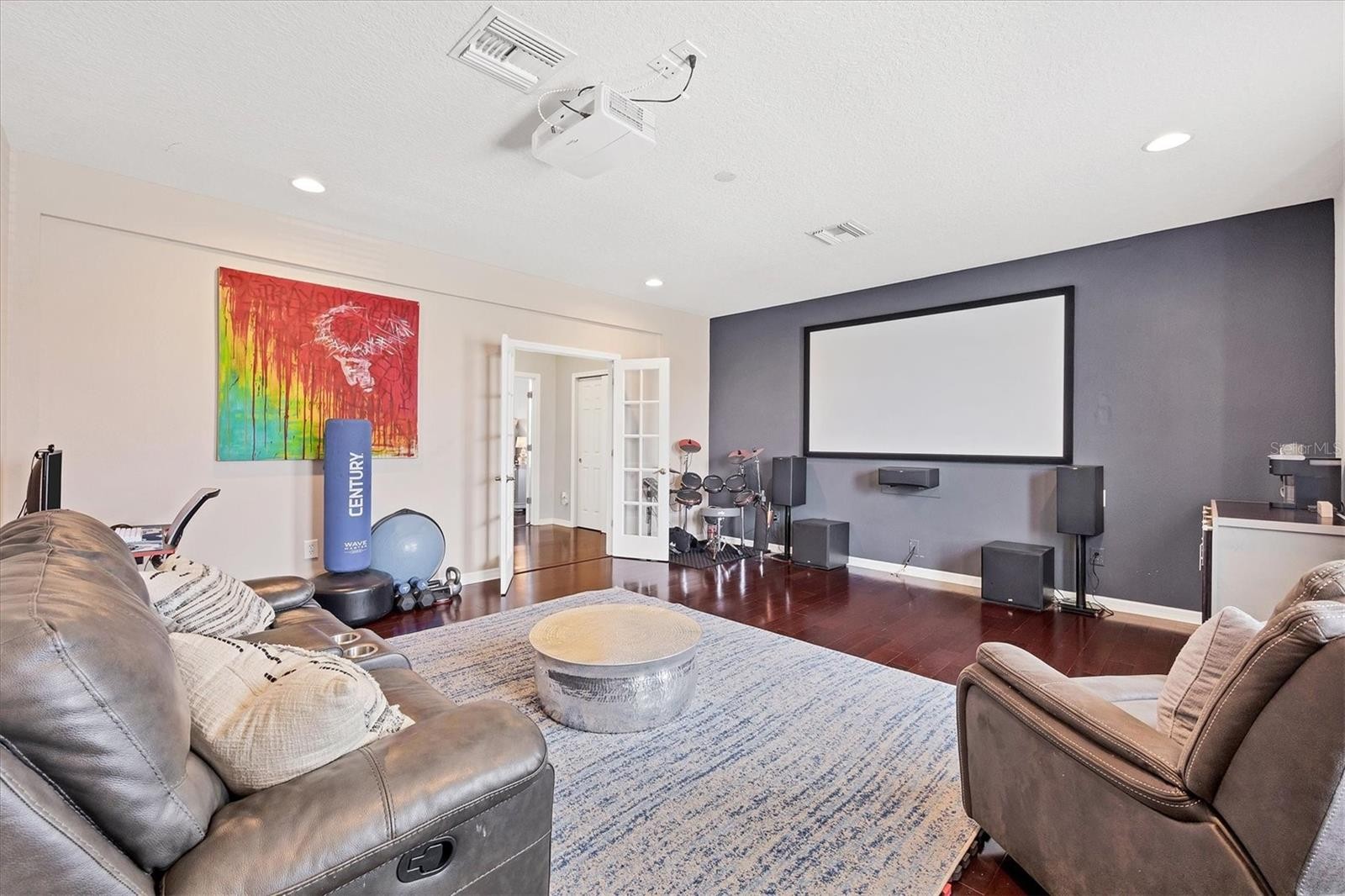 Price reduced 50K ! Luxury Lakefront Living in Copperstone ! Step into your dream home—a stunning two-story lakefront retreat boasting 4 spacious bedrooms, a private DEN, and a high-end THEATRE room (or 5th bedroom) nestled in the sought-after, gated Copperstone Community! This elegant oasis is where luxurious indoor comfort meets sensational outdoor living. As you enter, you’re greeted by an expansive open-concept floor plan anchored by a gourmet kitchen—showcasing rich 42” espresso cabinetry, gleaming granite countertops, a custom tile backsplash, stainless steel appliances, and a generous corner pantry. The great room flows seamlessly for effortless entertaining and everyday comfort. Elegant French doors lead to the versatile den/study, ideal for a home office, creative space, or quiet retreat. Plank tile flooring throughout the main level offers warmth and sophistication, perfectly complemented by the home’s inviting neutral palette. Upstairs, escape to your very own private theatre/game/bonus room—complete with French doors and a closet, giving you the flexibility to convert it into a 5th bedroom if desired. The primary suite is a true sanctuary with lustrous cherry wood floors, and a luxurious bathroom with dual vanities, and a roomy walk-in closet. You’ll also find two additional upstairs bedrooms, a convenient laundry room, and a guest bath that makes hosting a breeze. A guest en suite on the main floor ensures comfort and privacy for visitors. Your outdoor sanctuary awaits as you step outside to peace and tranquility in the screened-in patio/ lanai and indulge in your own private resort. The custom 28’ x 13’ saltwater pool & spa package (built in 2023) features a Pebble Tec finish and color-changing LED lighting, setting the stage for unforgettable evenings under the stars. This home is loaded with builder upgrades that add comfort and value, including additional recessed lighting, upgraded window package, abundant storage space ( including under the grand staircase) and storm shutters. Copperstone is one of the most vibrant and active communities around! With a beautifully renovated clubhouse with modern amenities, 2 resort-style pools, State-of-the-art fitness center, Pickleball, basketball, and sports courts, Scenic walking paths and a stocked pond for fishing PLUS Year-round community events for all ages. This home is perfectly situated in a prime location near top-rated schools, premier shopping, restaurants, medical centers, and just a short drive to Florida’s best beaches. Plus, basic cable and internet are included in the HOA, adding extra value and ease. Whether you’re entertaining guests, working remotely, or soaking up lakeside sunsets, this home delivers the perfect blend of function, flair, and Florida charm. Don’t miss the opportunity to call this exquisite property your new Home Sweet Home! Don't just dream it - Live it!