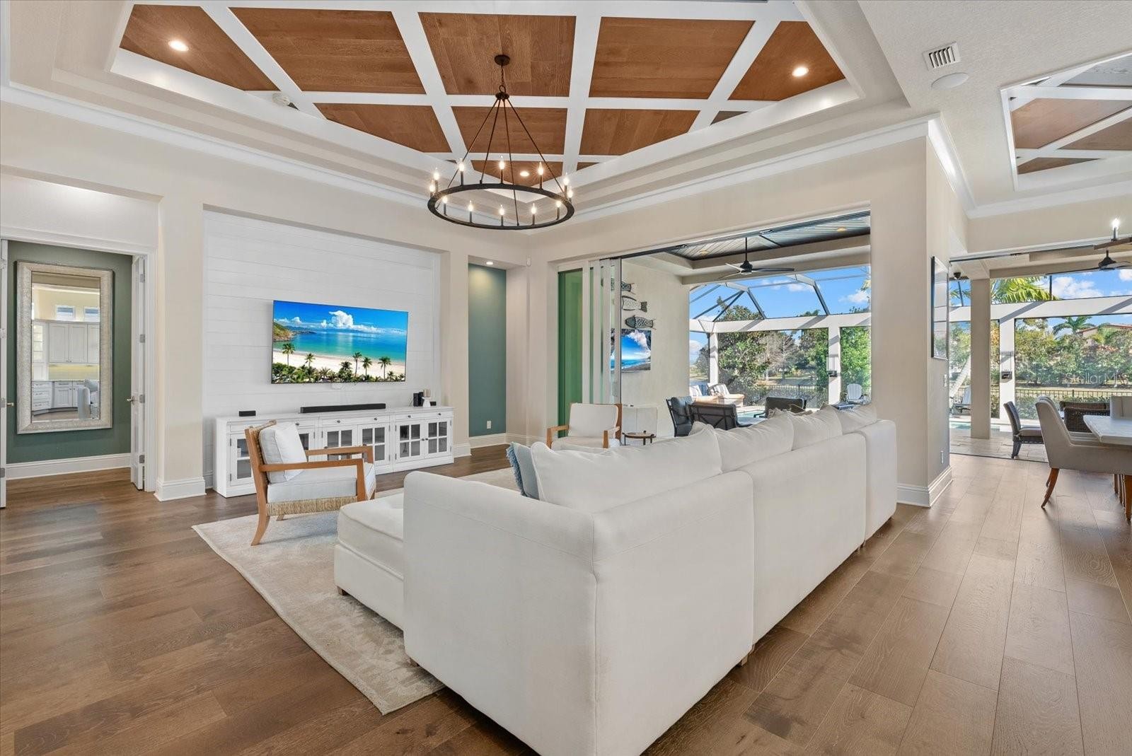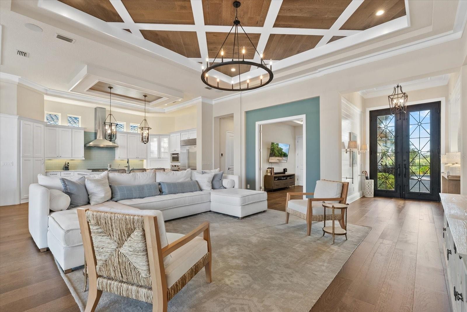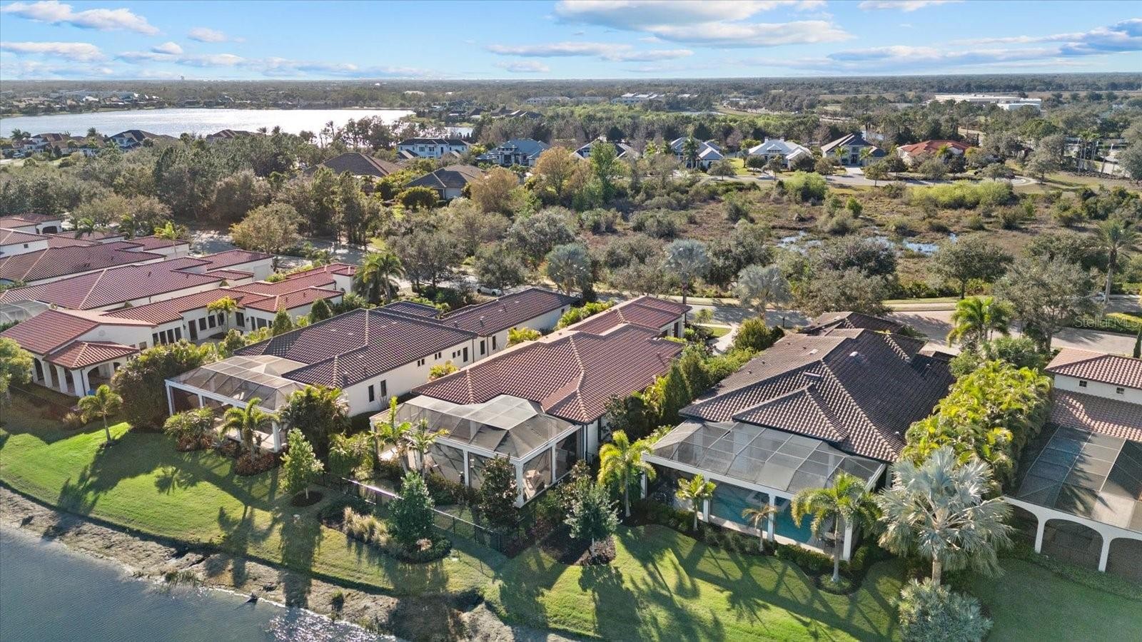 Set on a premium .3-acre waterfront homesite with expansive lake views, this exceptional Lee Wetherington-built residence offers nearly 3,000 square feet of thoughtfully curated living space where custom craftsmanship and attention to detail define every room. With 3 bedrooms, 3.5 baths and a den, this home is a true showcase of architectural design, elevated finishes, and refined Florida living. From the moment you arrive, the paver driveway, lush landscaping, and courtyard-style entry set the tone for what awaits inside. Wide-plank white oak flooring flows throughout the main living areas, complemented by intricate coffered ceilings, crown molding, custom millwork, designer feature walls, statement lighting, and tailored built-ins that elevate the space beyond the expected. The gourmet kitchen is both striking and functional, anchored by an oversized quartz island and surrounded by custom cabinetry, glass display accents, designer backsplash, and premium appliances including a Wolf gas cooktop and Sub-Zero refrigerator. The open-concept layout flows seamlessly into the great room and dining space, where architectural ceiling details and pocketing sliders frame the stunning water views.The primary suite offers a serene retreat with water views, direct lanai access, custom-designed walk-in closets, a coffee/beverage nook, and a spa-inspired bath featuring dual vanities, an oversized walk-in shower, and a freestanding soaking tub. Each guest bedroom includes its own en-suite bath, thoughtfully appointed with quality finishes and custom touches. A beautifully designed den provides flexible space for a home office or additional lounge. In addition, there is a built-in work area with a desk and cabinets just outside the two guest bedrooms. Perfectly positioned to capture expansive water views, the outdoor living environment is a true focal point of this home. The screened lanai features a heated, salt water pool and raised spa, travertine decking, a fully equipped outdoor kitchen, and multiple covered areas designed for both intimate evenings and larger gatherings. In addition, a recently installed fence creates a safe space for pets. Other notable features and upgrades include a new AC (2025), new tankless hot water heater (2026), Control4 smart home and security system, and water softener. Built with the superior quality Lee Wetherington is known for, this residence is more than just a waterfront home — it is a carefully crafted statement of custom detail, architectural beauty, and luxury lifestyle in Lakewood Ranch. Located within the Matera section of The Lake Club, HOA fees include lawn maintenance and pool service, allowing for a truly maintenance-free lifestyle. Life at The Lake Club extends well beyond the home itself. The clubhouse serves as the social heart of the community, offering sophisticated indoor and outdoor dining venues, and beautifully appointed gathering spaces. Residents enjoy access to a resort-style pool, fitness center, tennis and pickleball courts, scenic walking paths, and a curated calendar of social events designed to foster connection and lifestyle.