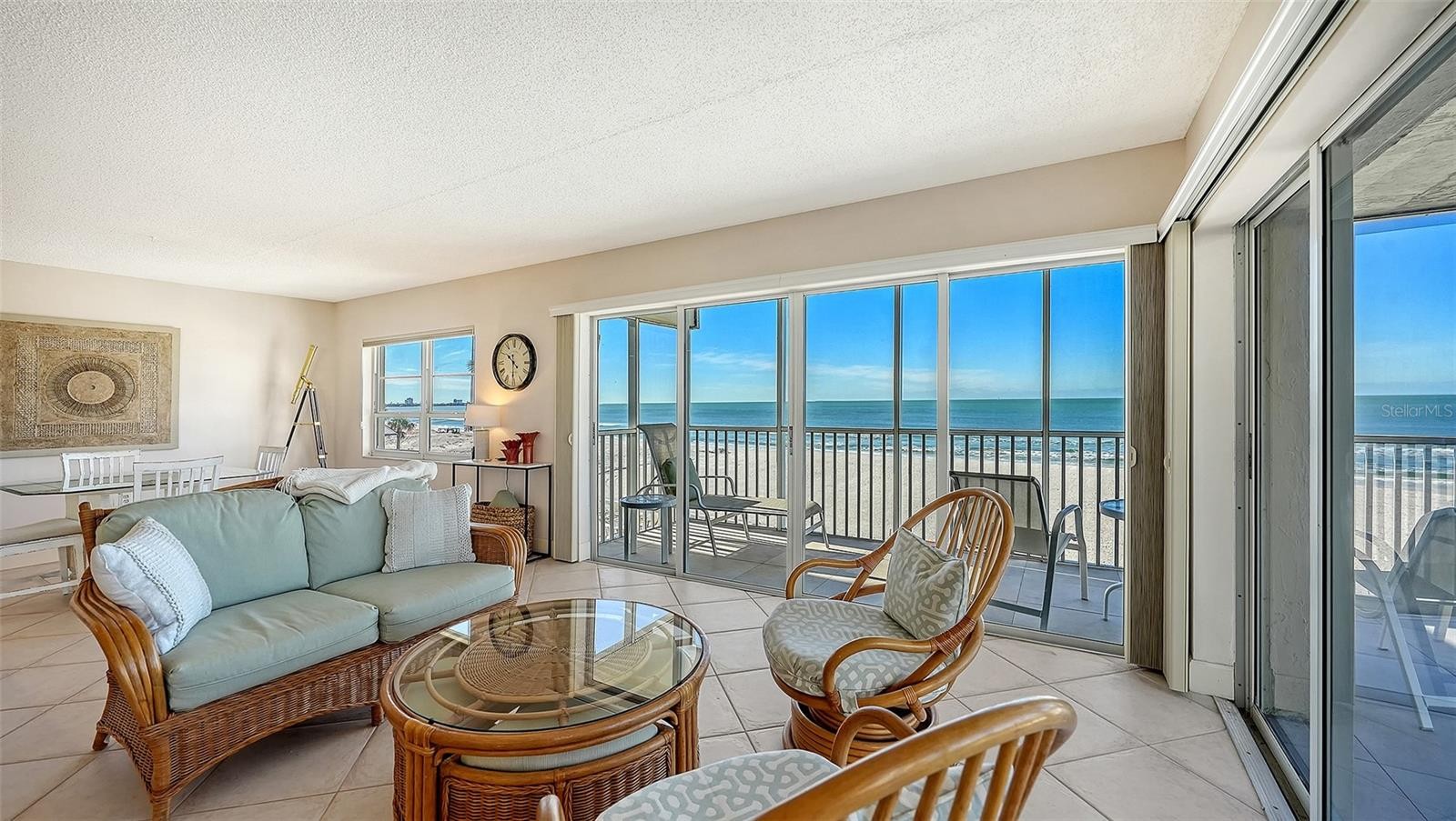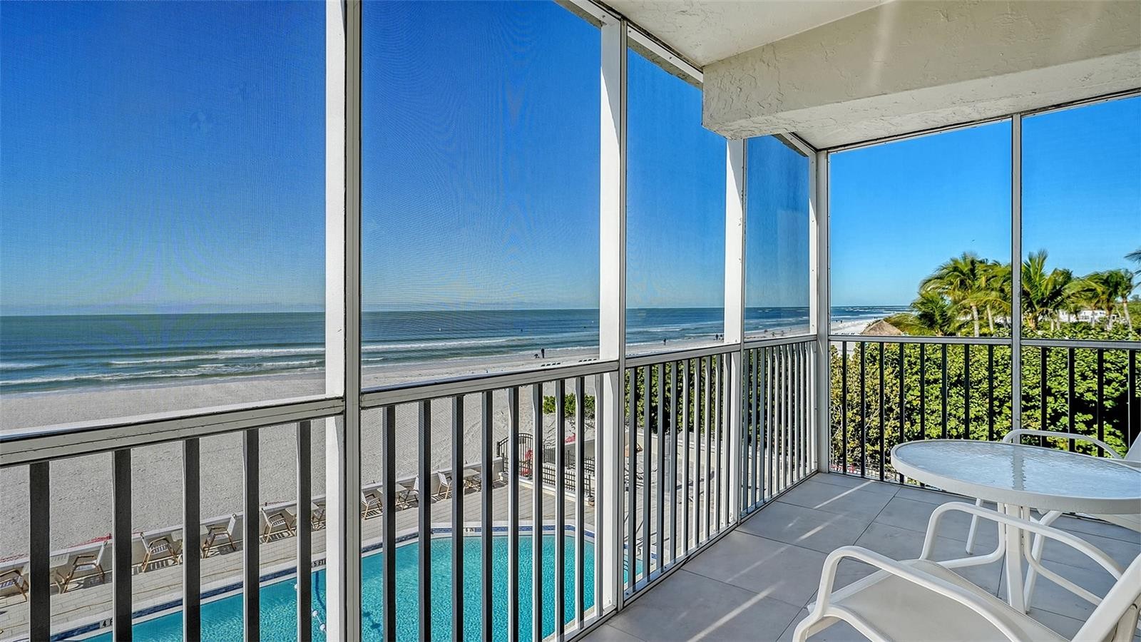 Experience beachfront living in this rarely available northwest corner residence at Lido Ambassador. This 3rd floor end-unit offers unparalleled panoramic views of the Gulf and beach, creating an extraordinary backdrop from every main living space. The residence features two bedrooms and two bathrooms encompassing 1,350 sq. ft. of interior living space complemented by a wraparound screened balcony that seamlessly blends indoor and outdoor living. Natural light fills the home, showcasing an open-concept layout that transitions from the entry area into the spacious great room overlooking the beachfront balcony. This thoughtful design is perfect for both entertaining guests and enjoying peaceful evenings at home, with endless beach views. The kitchen features Corian countertops, light colored cabinetry, generous storage all anchored by a trey ceiling. The primary suite offers a walk-in closet and an updated en-suite bath, while the guest bedroom and bath provide a private retreat for visitors. Lido Ambassador is a well-managed community known for its maintained grounds and attentive upkeep. Residents enjoy access to a Gulf-front pool and sun deck, which is currently undergoing a full renovation, to create a refreshed, resort-style atmosphere. And for added peace of mind, the roof of the building is brand new. Additional amenities include a fitness center, catering kitchen, outdoor grills, private storage, and one assigned covered parking space. The location is simply phenomenal. Nestled on the exclusive south end of Lido Key, the residence is steps from the Lido Beach Resort Tiki Bar and short distance from St. Armands Circle, Longboat Key, and with easy access to downtown Sarasota’s arts and culture scene including the weekly farmer’s market. Whether you are seeking a coastal getaway, investment opportunity, or full-time residence, this unit delivers exceptional location, and breathtaking views.
