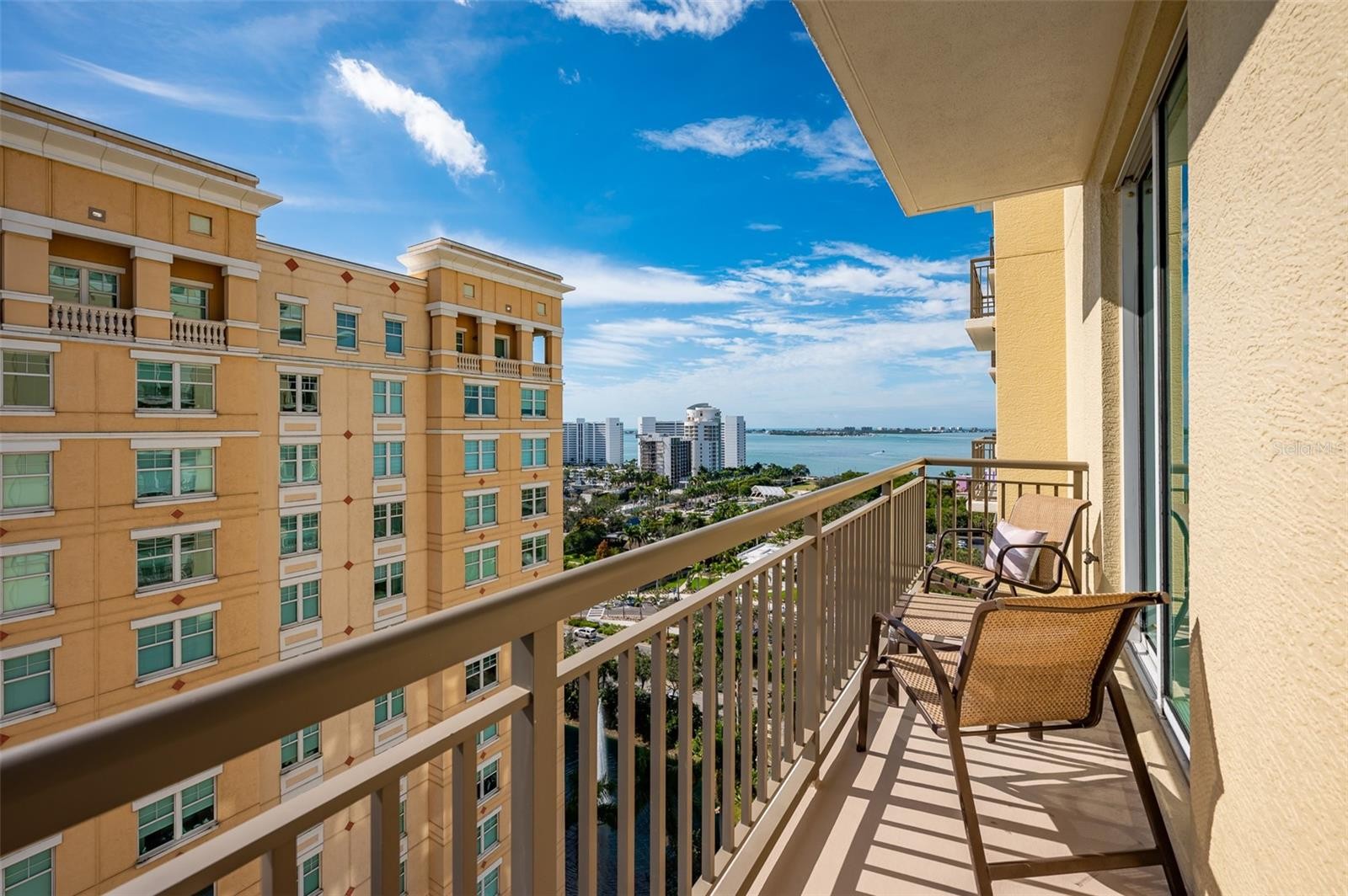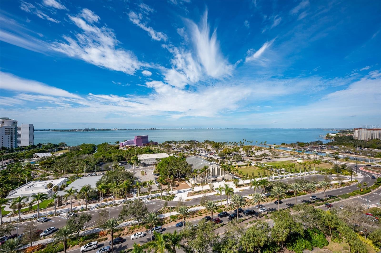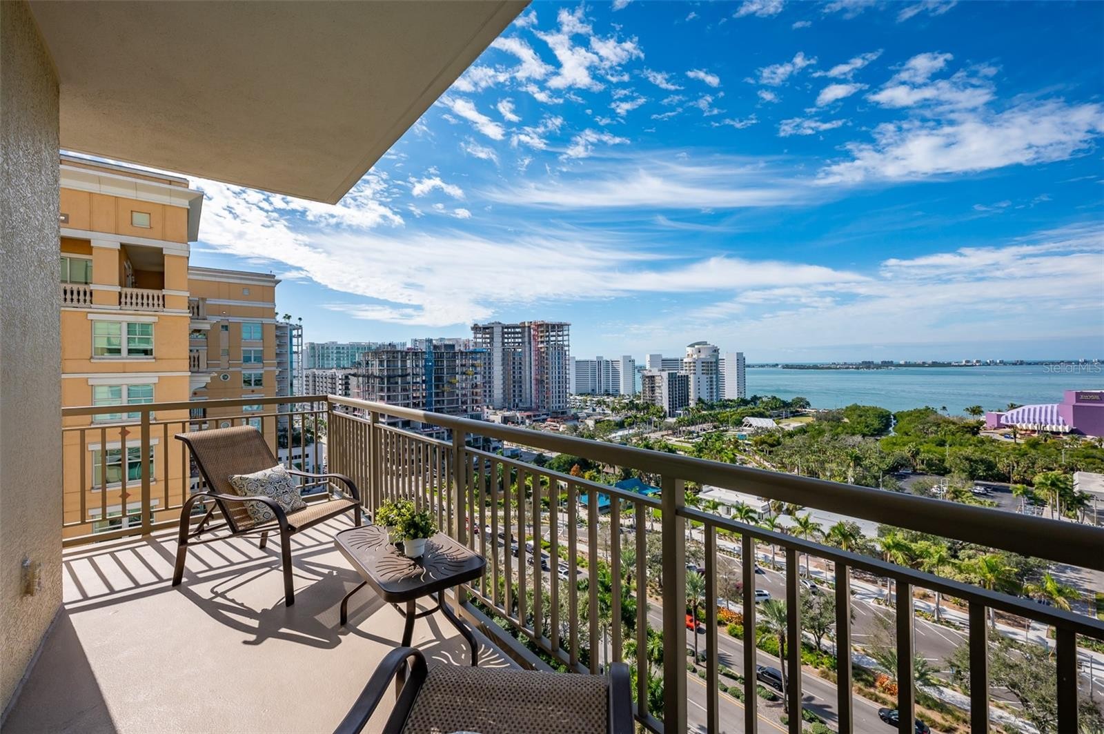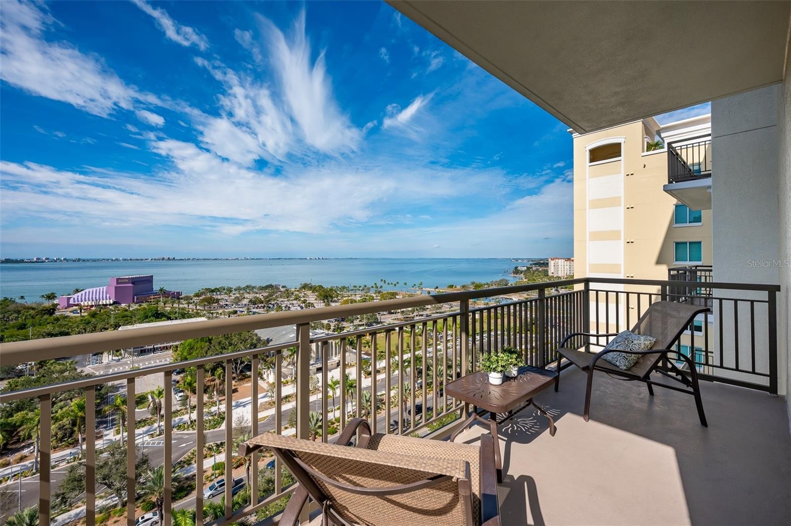 Immerse yourself with coastal luxury in this spectacularly designed two-bedroom, two-full-bath and one-half bath East to West corner unit in downtown Sarasota. Nearly every surface has been artistically modernized to provide supreme elegance, comfort and functionality. As you step inside, you will be immediately greeted by the bright interior, featuring 11 ft ceilings and open floor plan. The sunlight reflects beautifully off the porcelain tile throughout the unit and almost exudes the ambiance that you are walking amongst the clouds, although on the 15th floor. The beautiful flow of the porcelain tile, neutral palate and rich wood flooring in the primary bedroom, elevate the look and makes cleaning effortless. Every detail has been accounted for and no expense has been spared when designing your future home. The kitchen's stately stainless steel appliance package, stone countertop, pantry and newly refinished kitchen cabinetry and hardware complement the overall atmosphere overlooking the vistas of Sarasota Bay turquoise water. Enjoy West and East balconies with breathtaking Sarasota Bay and city views. The primary en-suite bedroom has expansive views of the East sunrise large walk-in closet and secondary closet both with built-ins and spa- like bath retreat. Your second bedroom is spacious with balcony access and closet with built-ins. There is complete laundry closet located between both bedrooms for convenience and complete with washer, dyer and storage shelving. There are beautiful lighting fixtures and fans throughout the residence. Living here means that you will enjoy the most amazing sunsets on the west coast of Florida! When it comes to selecting your next building to call home, understand that Alinari truly has all the amenities and security that you would want in a Florida condominium building. Beyond the unit itself, Alinari offers a wealth of amenities. Residents of this stunning 18-story condominium high-rise enjoy lovely plazas, fountains and modern resort-style perks. The building is completely secure with key-card entry and 24-hour front desk services, including an overnight guard. The building is in flood zone X and outside the floodplain. Alinari is designed like a fortress and was constructed with reinforced concrete beams, has been fireproofed, and was built on pilings that were drilled deep into the ground for extra added stability and security. The lobby and guest parking spaces are elevated 17 feet above from the base sea level. This unit enjoys two assigned parking spaces (one on the third floor garage and one on the first floor garage), which means your vehicles will be secured and elevated over 30 feet from sea level. From a grand entrance and an impressive lobby to concierge services, on-site management, secured parking, a clubroom, business center, fitness center and even a resident theater, every need is catered to. The location could not be better. In a contemporary-inspired building, Alinari is in the heart of Sarasota's cultural district. The opportunity to experience the epitome of downtown Sarasota living awaits.