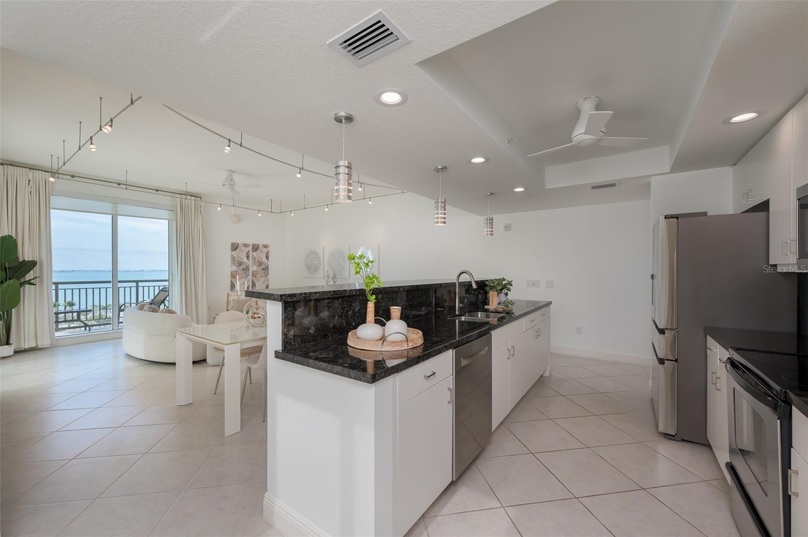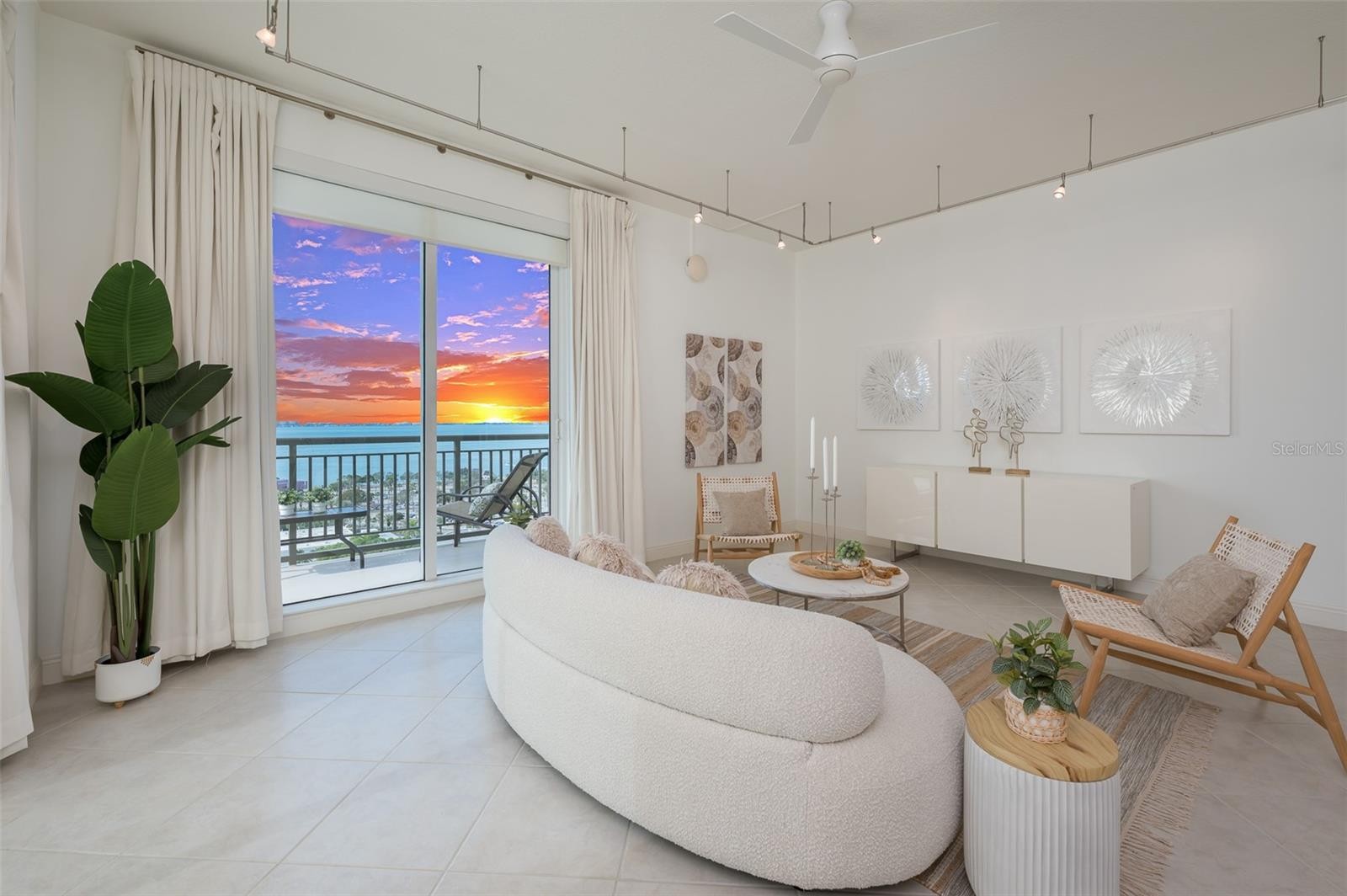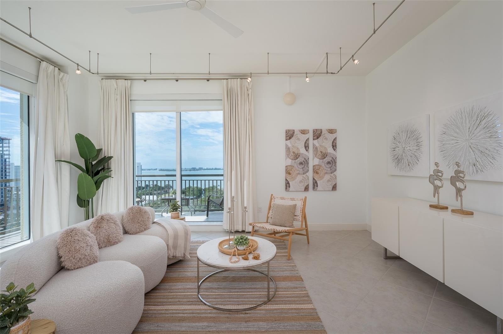 Immerse yourself with coastal luxury in this spectacularly designed two-bedroom, two-full-bath and one-half bath East to West corner unit in downtown Sarasota. Nearly every surface has been artistically modernized to provide supreme elegance, comfort and functionality. As you step inside, you will be immediately greeted by the bright interior, featuring 11 ft ceilings and open floor plan. The sunlight reflects beautifully off the porcelain tile throughout the unit and almost exudes the ambiance that you are walking amongst the clouds, although on the 15th floor. The beautiful flow of the porcelain tile, neutral palate and rich wood flooring in the primary bedroom, elevate the look and makes cleaning effortless. Every detail has been accounted for and no expense has been spared when designing your future home. The kitchen's stately stainless steel appliance package, stone countertop, pantry and newly refinished kitchen cabinetry and hardware complement the overall atmosphere overlooking the vistas of Sarasota Bay turquoise water. Enjoy West and East balconies with breathtaking Sarasota Bay and city views. The primary en-suite bedroom has expansive views of the East sunrise large walk-in closet and secondary closet both with built-ins and spa- like bath retreat. Your second bedroom is spacious with balcony access and closet with built-ins. There is complete laundry closet located between both bedrooms for convenience and complete with washer, dyer and storage shelving. There are beautiful lighting fixtures and fans throughout the residence. Living here means that you will enjoy the most amazing sunsets on the west coast of Florida! When it comes to selecting your next building to call home, understand that Alinari truly has all the amenities and security that you would want in a Florida condominium building. Beyond the unit itself, Alinari offers a wealth of amenities. Residents of this stunning 18-story condominium high-rise enjoy lovely plazas, fountains and modern resort-style perks. The building is completely secure with key-card entry and 24-hour front desk services, including an overnight guard. The building is in flood zone X and outside the floodplain. Alinari is designed like a fortress and was constructed with reinforced concrete beams, has been fireproofed, and was built on pilings that were drilled deep into the ground for extra added stability and security. The lobby and guest parking spaces are elevated 17 feet above from the base sea level. This unit enjoys two assigned parking spaces (one on the third floor garage and one on the first floor garage), which means your vehicles will be secured and elevated over 30 feet from sea level. From a grand entrance and an impressive lobby to concierge services, on-site management, secured parking, a clubroom, business center, fitness center and even a resident theater, every need is catered to. The location could not be better. In a contemporary-inspired building, Alinari is in the heart of Sarasota's cultural district. The opportunity to experience the epitome of downtown Sarasota living awaits.