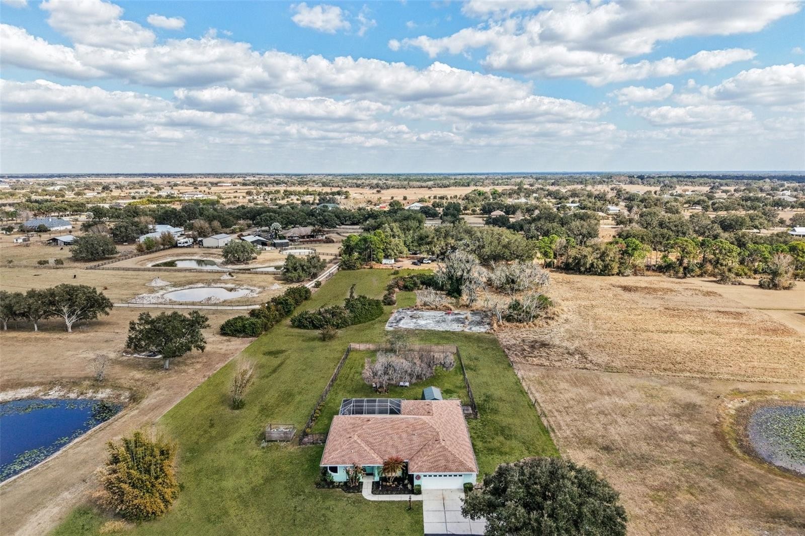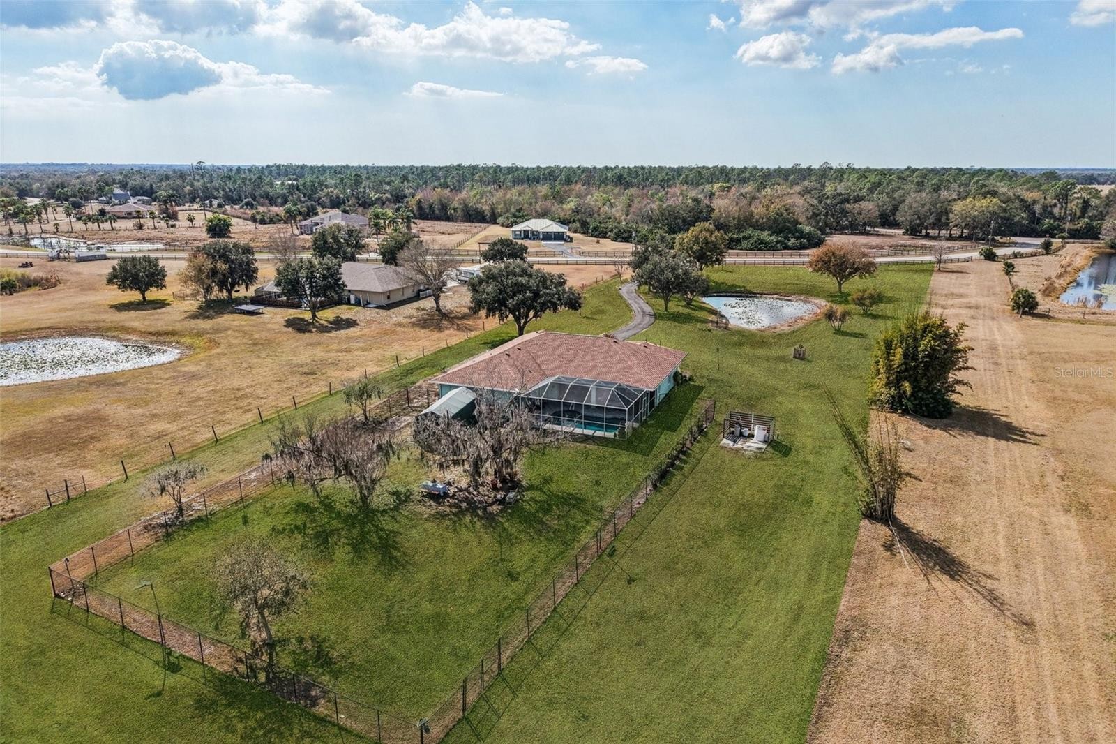 Offering 4.85 acres with room for a barn, workshop or animals - and only a short drive to Sarasota and white sandy beaches! Set within a rural community where neighbors keep horses, cows, goats and chickens, this well-maintained property offers practical acreage living with the space and flexibility many buyers are craving today. The land is open and usable, with an existing concrete pad already in place, ideal for a future barn, detached garage/workshop or guest house. Not heavily wooded, so fencing could be easily added to create defined areas for animals, gardening or additional structures as desired. Zoning (and HOA) allows for horses, livestock and outbuildings, giving the next owner the opportunity to tailor the property to their imagination. Inside, this bright and functional home offers 2,355 sq feet of comfortable living space, including 3 bedrooms in a split layout, plus a flex room suitable for an office, nursery or hobby space. There are 2 full baths and a half / cabana bath adjoining the second bedrooom. The open plan kitchen has two separate islands, and overlooks the pool and the large combined dining / living / family room - plenty of space to host a crowd. Outside, enjoy the pool and screened lanai, along with a smaller fenced area for pets or play. The surrounding area offers the natural beauty that draws many to rural Sarasota - frequent deer and sandhill crane sightings, open skies and peaceful nights under the stars. Located within an HOA community that supports rural living, the property offers a balance of space and neighborhood, and the area is known for it's laid-back, country feel while still being within a easy reach of town. Major improvements include new vinyl flooring throughout, water heater, and dishwasher (2025), pool resurface, lanai paving, exterior/interior paint and hurricane shutters (2023) and roof and A/C (2017). If you've been looking for usable acreage with flexibility and potential, this property is worth a closer look.