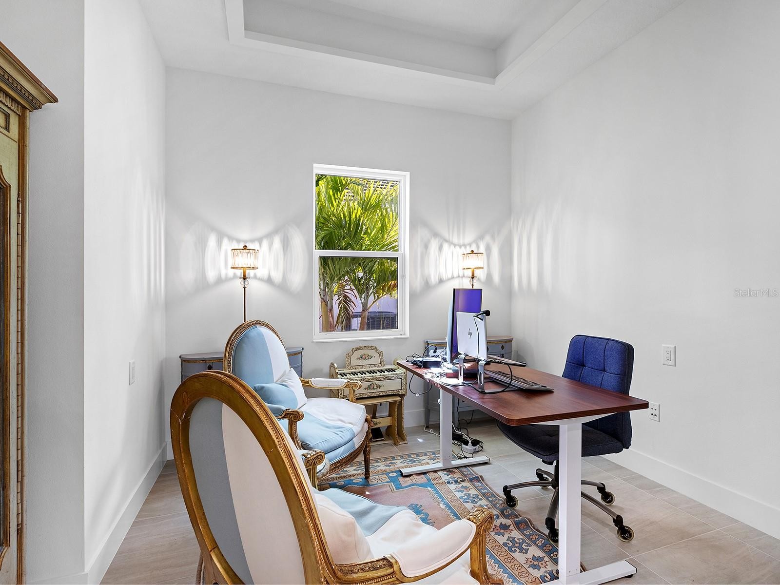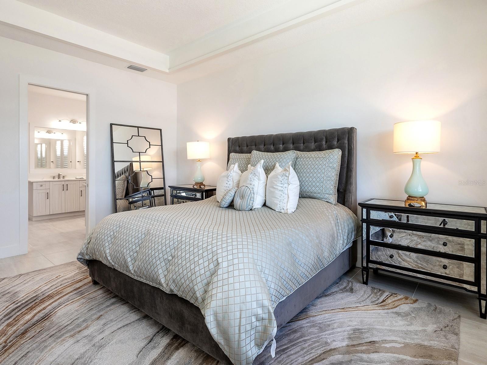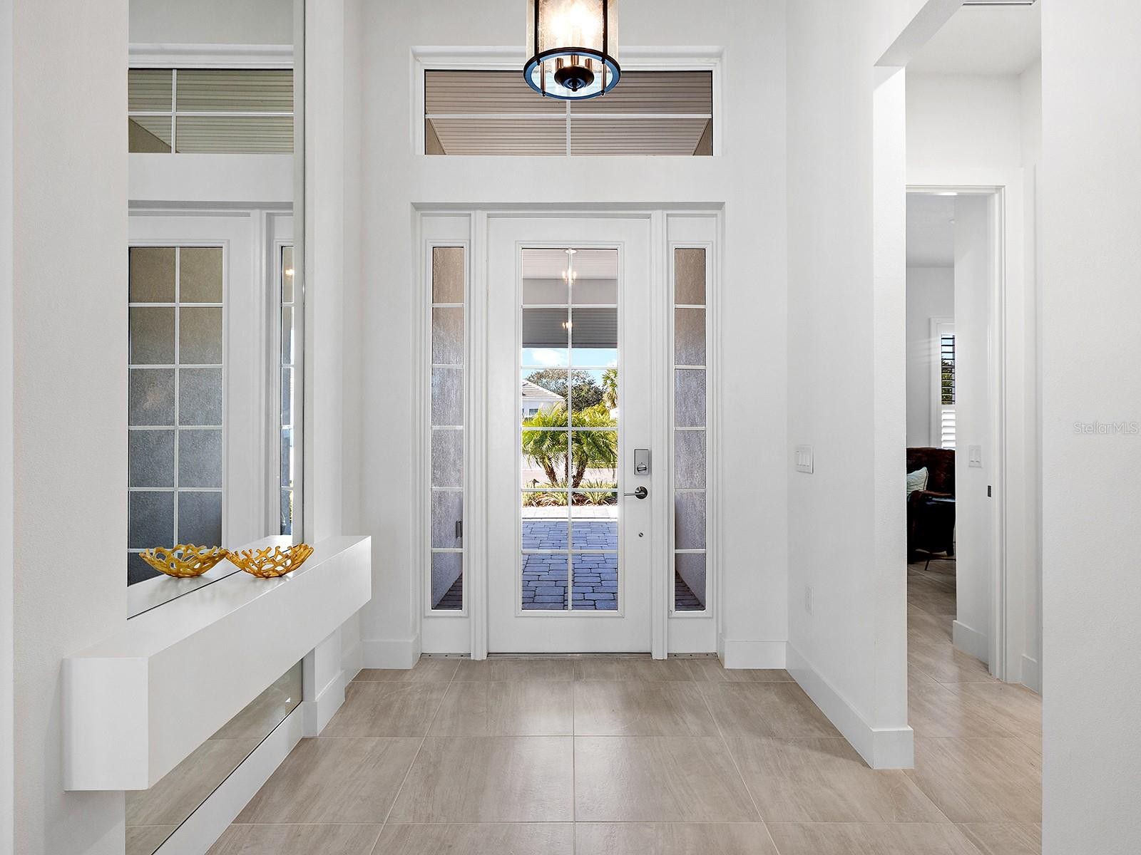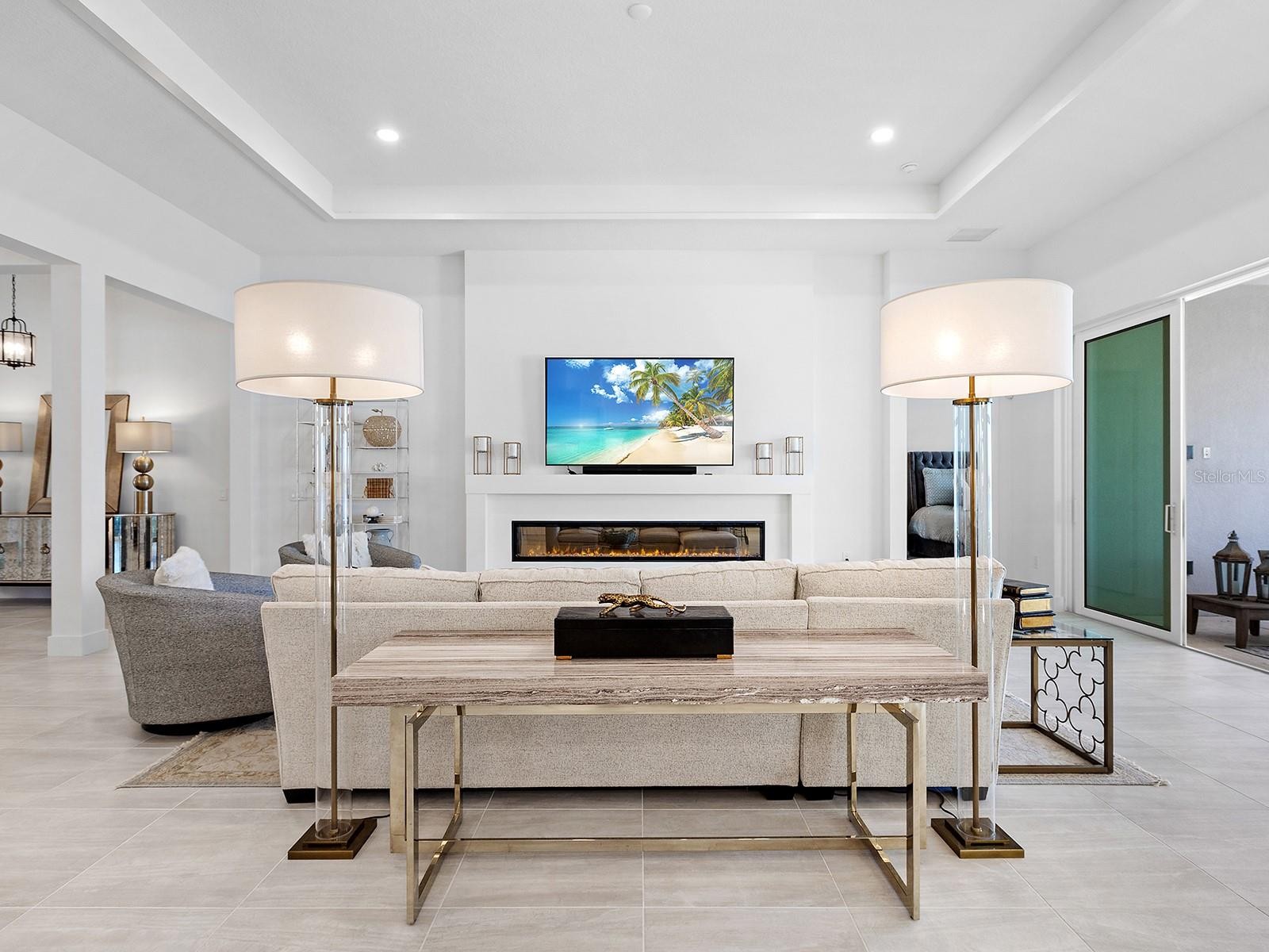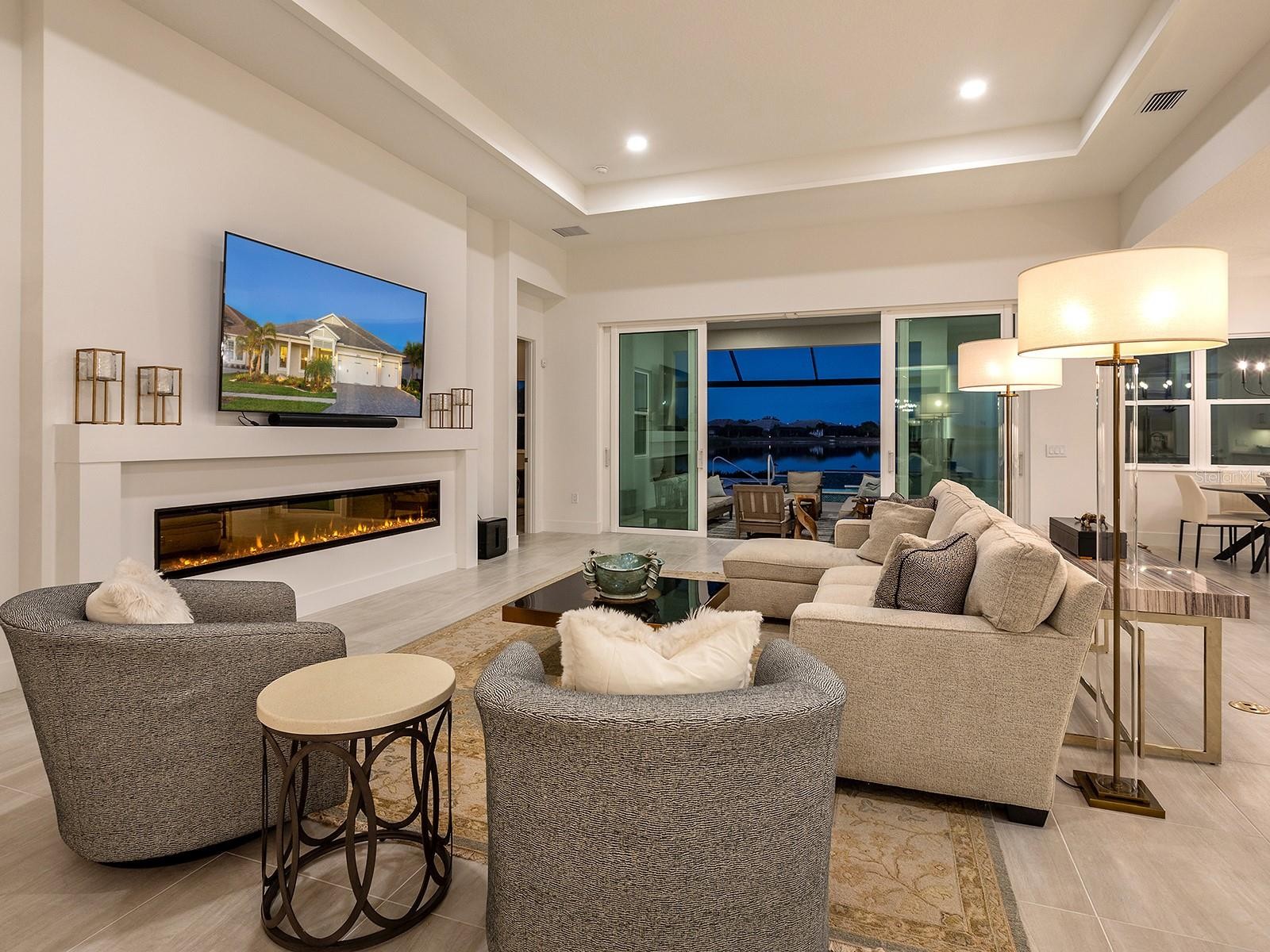 Welcome to 8043 Waterbend Trail, a stunning custom Outrigger model by Homes by Towne, offering nearly 3,000 square feet of elegant living space in the desirable Lakehouse Cove at Waterside. Unobstructed, panoramic views of Lake Ibis define this coastal-inspired residence. Wake up to the gentle shimmering of sunrise over the open water and end your day viewing spectacular pink-tinged skies. This coastal-inspired home is a sanctuary, offering a front-row seat to nature with herons gliding by and birdsong filling the air. Just a short drive from the community’s best amenities, this is more than a home, it’s a daily escape. Designed with luxury, comfort and style in mind, this home features three bedrooms, two-and-a-half baths, a versatile den/flex space and a three-car garage. From the moment you enter through the elegant glass front doors, you’re greeted by a bright, open interior where meticulous attention to detail is evident throughout. The welcoming foyer sets the tone with a tray ceiling, custom lighting and a large framed mirror with a built-in shelf. The open-concept great room is a showpiece, showcasing a tray ceiling, custom FIREPLACE, and expansive sliding glass doors that seamlessly connect indoor and outdoor living. Step outside to your private waterfront oasis, an expansive bronze-screened lanai with travertine pavers, two covered entertaining areas and a fully equipped outdoor kitchen, ideal for lounging or alfresco dining. The heated saltwater pool and spa feature a waterfall, accent tile and panoramic screen enclosure, all overlooking serene lake views. The formal dining room, styled as a sitting and gathering area, features TRAY CEILINGS and an oversized backlit framed mirror, flowing effortlessly into the great room and kitchen for easy entertaining. The chef’s kitchen is equally impressive, offering quartz countertops, tile backsplash, wood cabinetry with under-cabinet lighting, a natural gas oven with vent hood, upgraded appliances, a spacious walk-in pantry, and an oversized island with pendant lighting that serves as a breakfast bar and connection to the casual dinette. A dedicated den provides a private and inspiring workspace with a tray ceiling and flexibility to function as a home office or media room. The primary suite is a luxurious retreat, highlighted by tray ceiling and a spa-inspired bath featuring quartz split vanities, a tiled walk-in shower and a custom-designed walk-in closet with built-ins by The Tailored Closet Company. The two additional guest suites offer spacious walk-in closets and are conveniently near the second full bath, ensuring comfort and privacy for visitors. Additional highlights include a powder room/pool bath, a well-appointed laundry room with washer and dryer, soaking tub, folding counter and ample cabinetry. Notable upgrades include IMPACT WINDOWS AND DOORS, TILE FLOORING THROUGHOUT (no carpets), plantation shutters, full-house WATER SOFTNER, EV charging unit and custom garage storage cabinets by Tailored Closets. Lakehouse Cove residents enjoy premier amenities including seven lakes, 20 acres of shoreline, a clubhouse, fitness center, resort-style pool, pickleball, kayaking, dog parks and a maintenance-free lifestyle, all with low HOA fees. Just minutes from Waterside Place for shopping, dining and water taxi services, this home delivers a lifestyle where every day feels like a retreat.