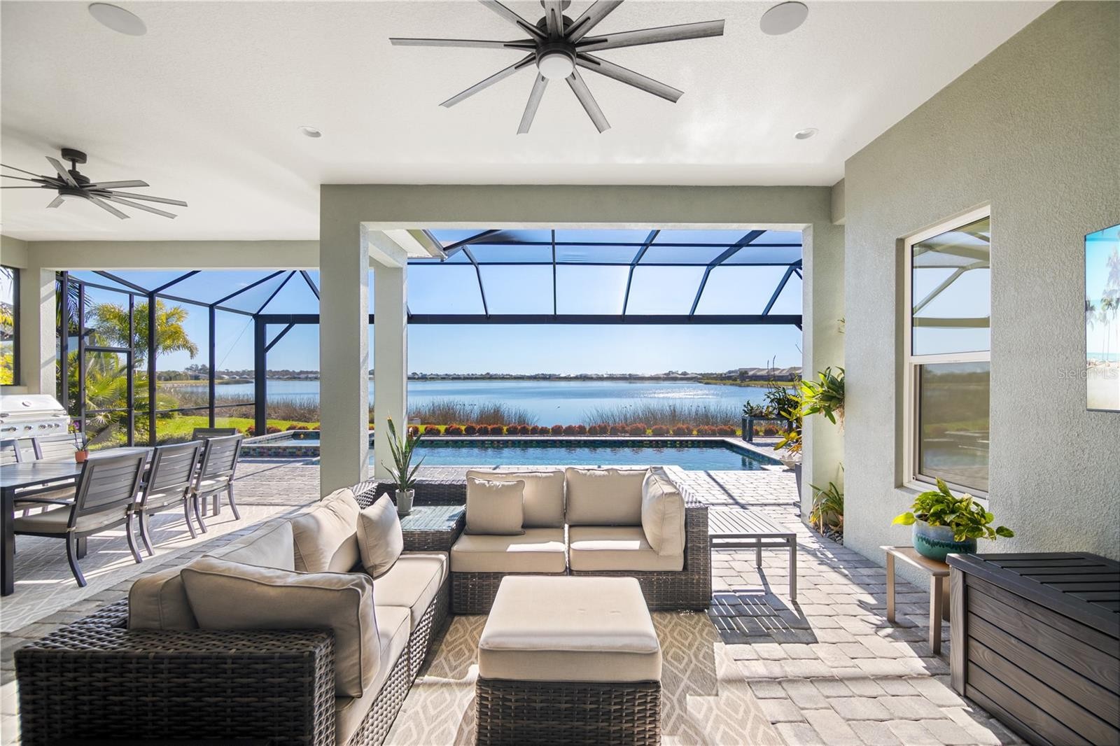 Nestled in the heart of the prestigious Lakehouse Cove community, this extraordinary home redefines Florida luxury living with its unparalleled blend of elegance, seclusion, and natural beauty. Sitting on the largest lot in Lakehouse Cove, this property offers an unmatched sense of privacy, with a 35-foot buffer on one side and 50 feet on the other. Adding to its exclusivity, the home boasts 2000 feet of uninterrupted long lake views, with nothing but serene waters and spectacular sunrises & sunsets as your backdrop—no neighbors in sight. This South-facing gem is designed to soak in the Florida sunshine, filling every corner with warm, natural light. Inside, the*open Outrigger floor plan is thoughtfully crafted, featuring a split-bedroom layout for ultimate privacy. The expansive chef’s kitchen impresses with two-tone countertops, a gas stove, and abundant storage, making it as functional as it is beautiful. Elegant details like tray ceilings, plantation shutters, and impact-rated windows and sliding doors add sophistication and peace of mind. Step outside, and you’ll find an entertainer’s dream. The frameless screened patio offers unobstructed views of the shimmering lake, while the heated saltwater pool and summer kitchen set the stage for unforgettable gatherings. The custom landscaped yard and spacious covered patio create a tranquil outdoor haven, and the cozy front patio overlooking a serene wildlife preserve adds even more charm. Practical upgrades abound here: an extended garage for extra convenience, additional cabinetry for effortless organization, and the removal of interior columns to create an open, airy flow. Every detail has been meticulously designed for comfort, style, and a seamless indoor-outdoor lifestyle. Purchasing this home with all its premium upgrades and this prime lot directly from the builder would cost over $2.5 million, if available. Why wait or pay more? This stunning, move-in-ready home is a rare opportunity to own the best of Lakehouse Cove today. Furniture included in the sale