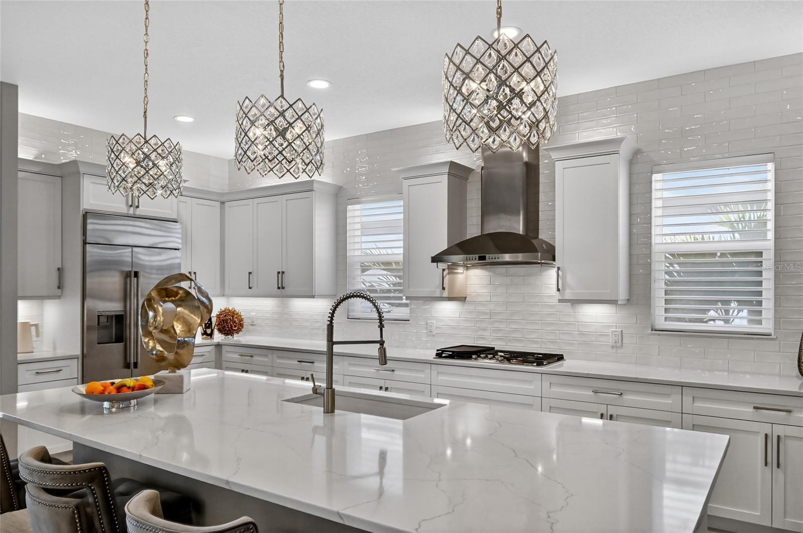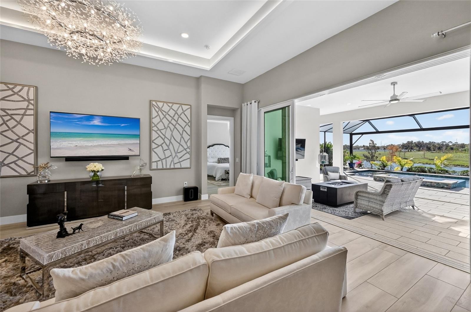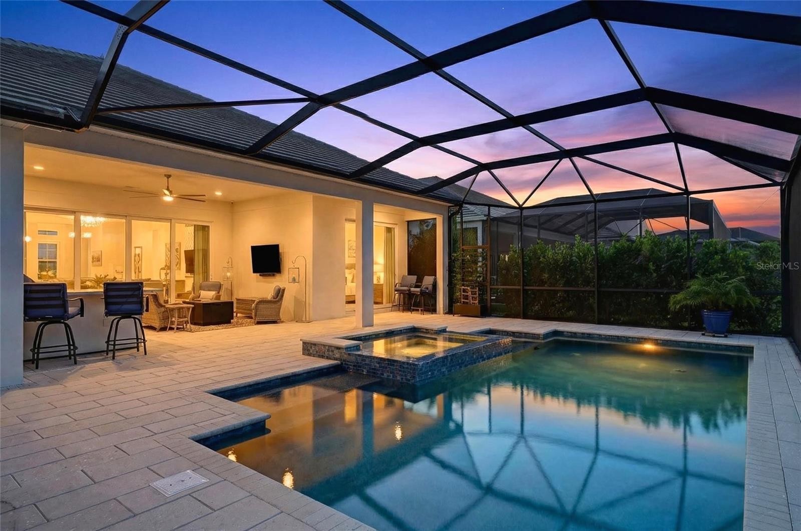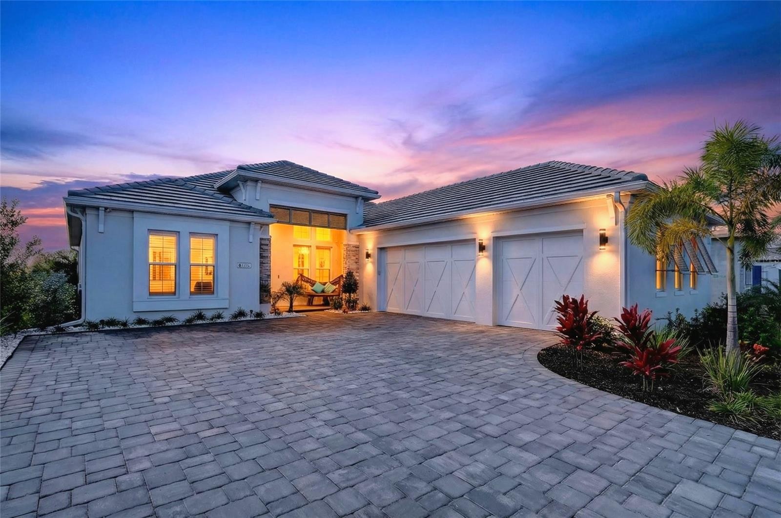 Opportunity to bypass the build process and start living a life well deserved in one of Lakewood Ranch’s newest communities from this beautifully appointed West Indies Islander plan built 2025 by Homes by Towne on a south-facing lake front setting in Shellstone at Waterside. The three bedroom plus study residence showcases 2,675 square feet of open one-story living, sumptuous wide wood-plank style porcelain tile throughout, voluminous tray ceilings with recessed accent lighting, IMPACT windows and doors, and a breathtaking outdoor living area with open and under cover space, shellstone pavered deck, newly added Summer kitchen and bar, PebbleTec heated saltwater pool/spa with sunshelf, and a panoramic clearview screen surrounded by premium landscaping and vistas. Seamlessly connecting this outdoor oasis to the oversized great room, kitchen and dining areas are impact glass doors revealing an optimal layout where guests and chefs alike will delight in the gourmet kitchen with GE Monogram appliances, sprawling counters, oversized island, dry bar with wine fridge, under cabinet lighting, a customized walk-in pantry, and stylish crisp white tile adorns the backsplash all the way up to the ceiling. Unwind in the elegant owner’s retreat offering direct lanai access via sliding glass doors, oversized customized closet, and a refreshingly luxuriant bath with two vanity stations, invigorating shower and separate water closet. Family and guests will be right at home in this split bedroom floor plan with two additional guest suites each on separate wings of the home, both offering customized walk-in closets and wood plank porcelain tile flooring, with one boasting its own private ensuite full bath, the other is just off the homes third full bath. Additionally, the residence offers a study behind double glass entry doors, and wood plank tile flooring. Other highlights of this all-encompassing 3,987 square foot residence includes a large laundry room with cabinetry and sink, the recent addition of remote-controlled window shades, show-stopper light fixtures, customized closets throughout, camera surveillance, 8’ interior doors, and an oversized three car garage with epoxy flooring and built-in storage cabinetry. Beckoning a lifestyle fulfilled with access to two resort-styled amenity centers, Shellstone residents will have private access to the soon-to-be completed Summit offering a social hall, fitness center, pool with cabanas, spa, firepit, poolside BBQ grills, and fitness lawn. Additionally, they can enjoy the recently completed hub at Midway Park that offers Shellstone and Wild Blue residents tennis, pickleball, basketball courts, kayak launch, walking trails, dog parks, playground, pro shop, and pavilions. Ideally located in Waterside, known for its vibrant Lakewood Ranch lifestyle surrounded by dining, shopping, polo, golf, community events, Waterside Place, Centerpointe, UTC Mall, and minutes to SRQ Airport and the beaches of Sarasota.
